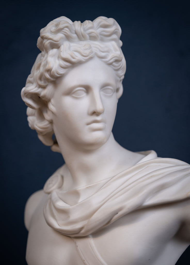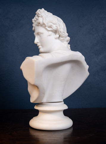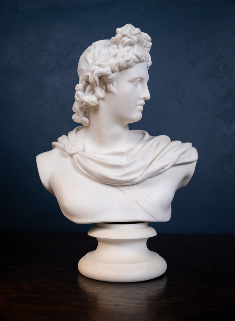 The bust depicts Apollo with his head looking to the right, with a drape across one shoulder fastened by a medallion. The whole sits upon a socle base which reads 'Art Union Of London 1861' to the fore, and 'Published February 1861' to the rear.