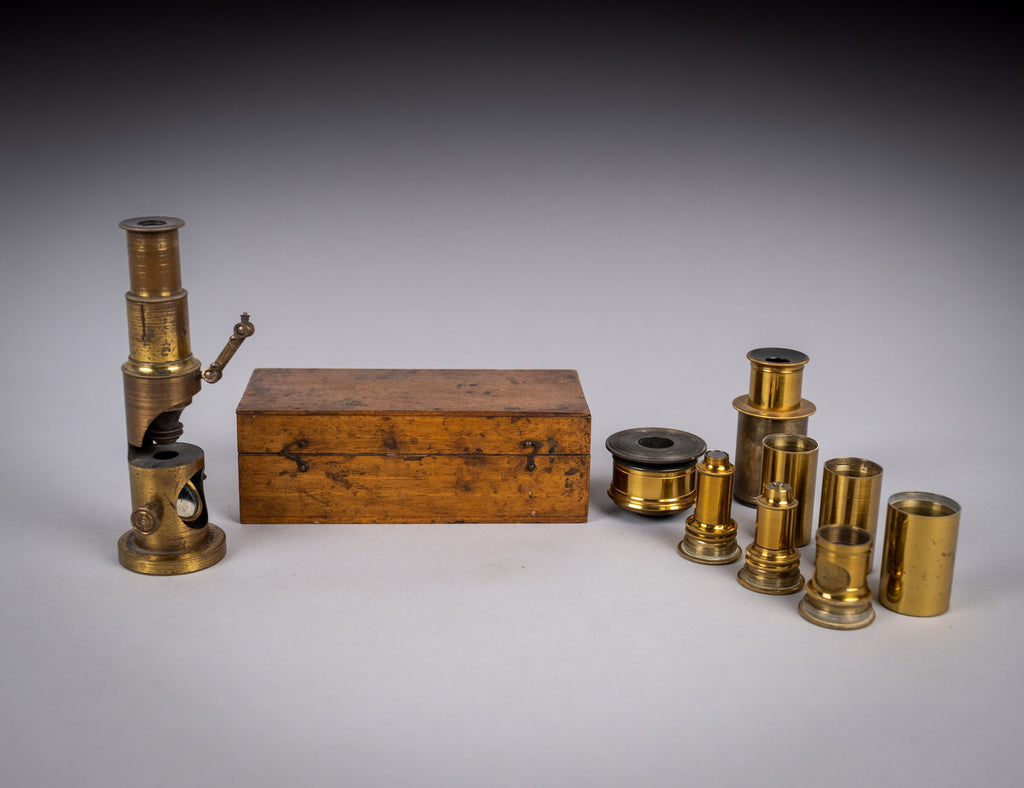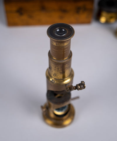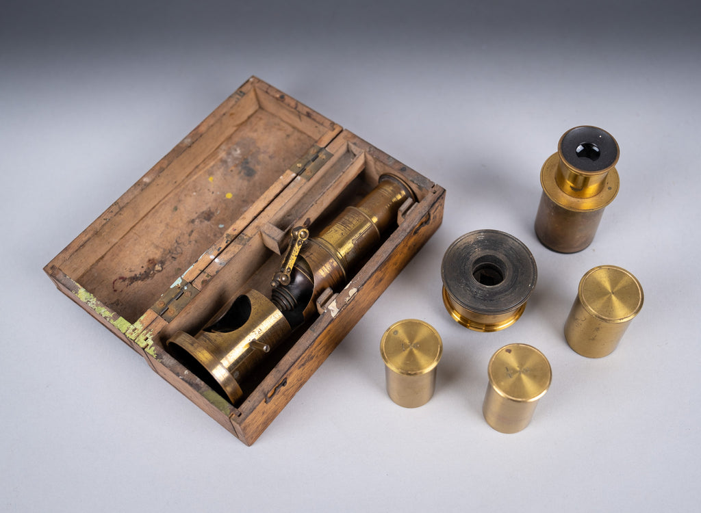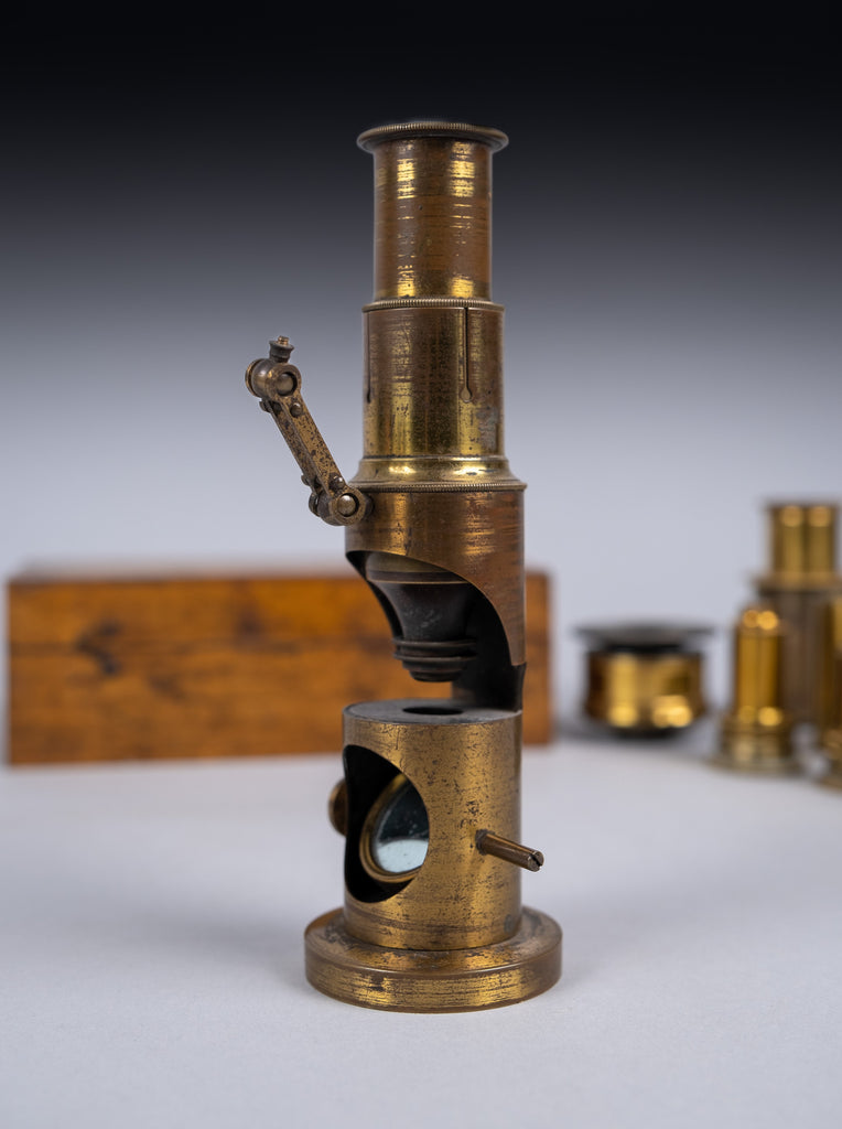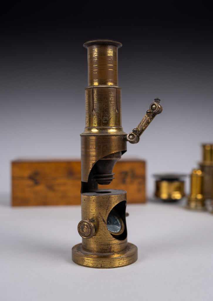 The microscope has a lovely age-worn patina, as does its carrying case. The lenses have been well cared for, highly polished and attractive pieces in their own right.