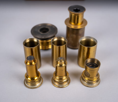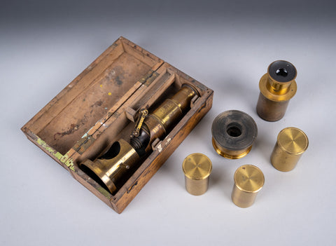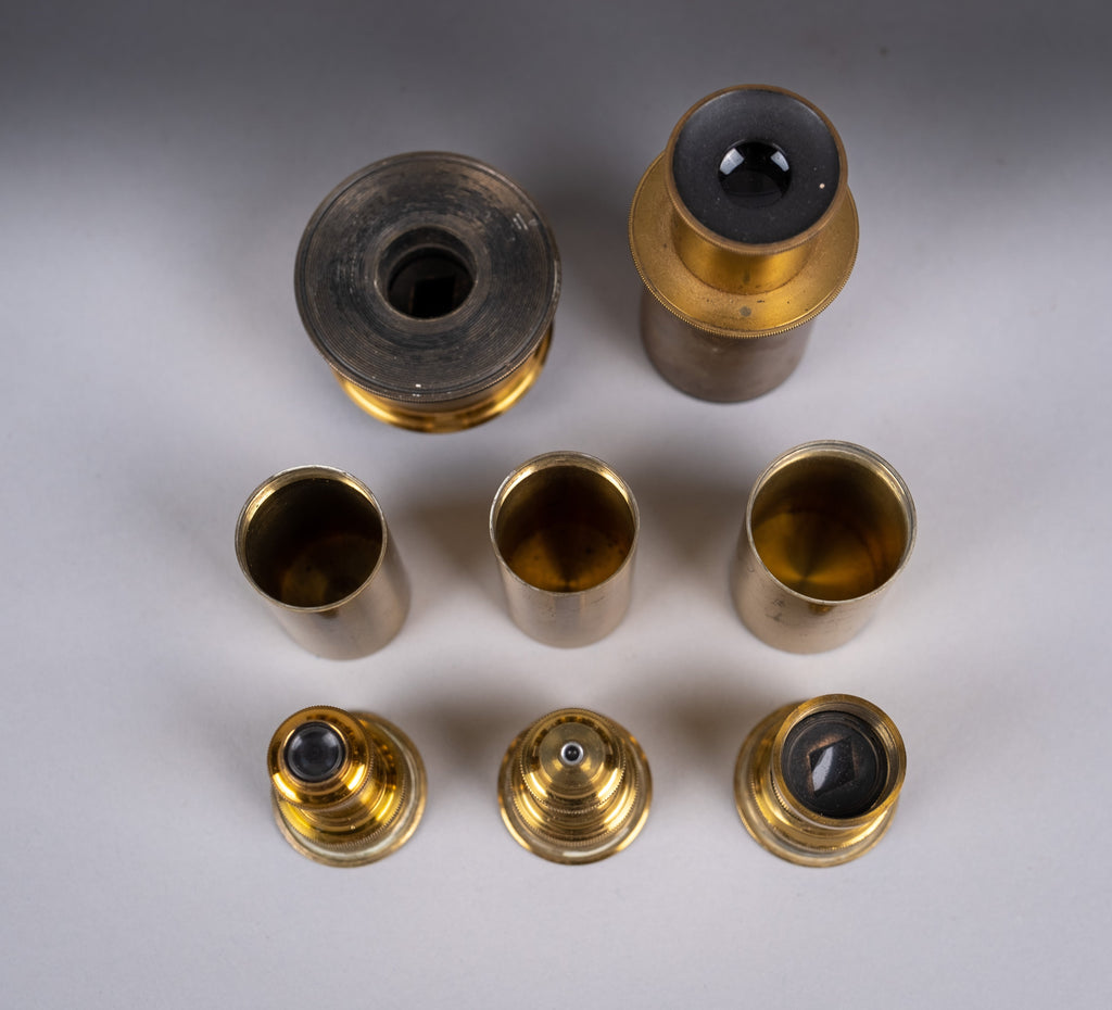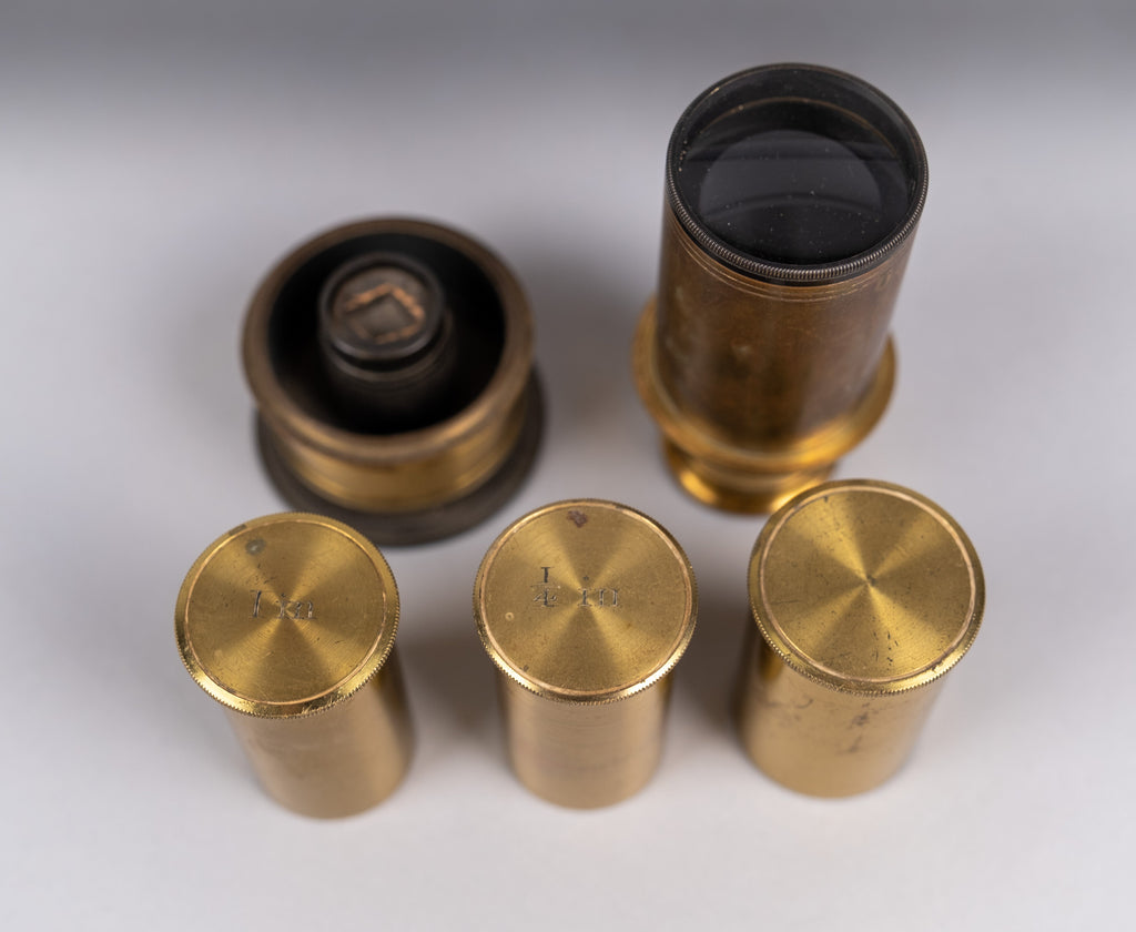 A charming late 19th century brass field microscope in its original box, together with five additional brass lenses.
