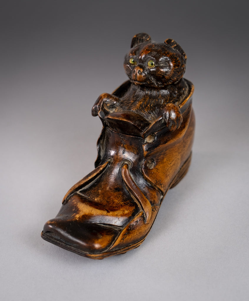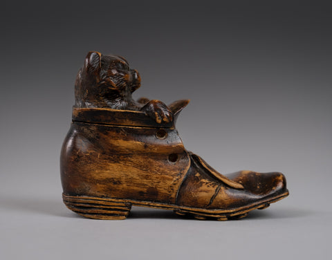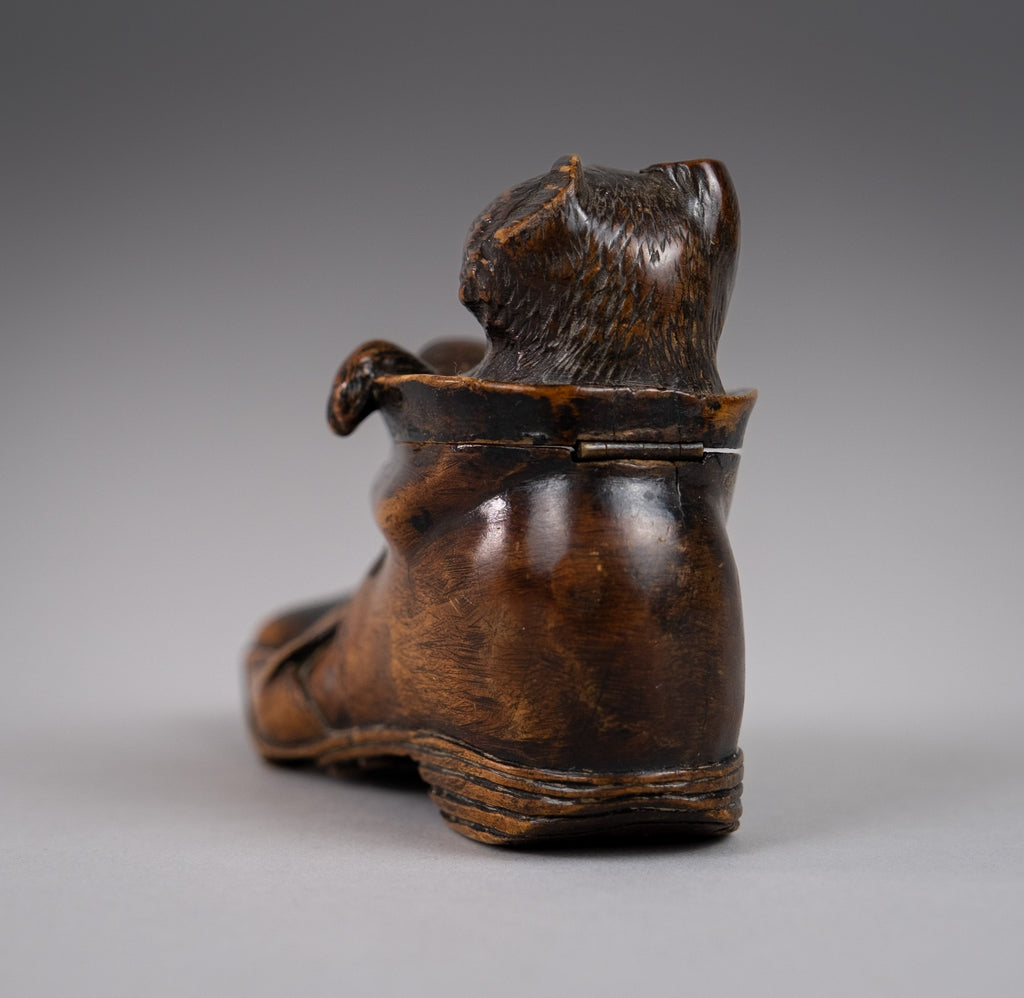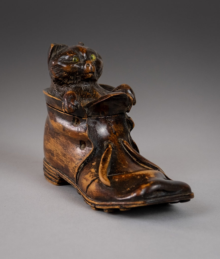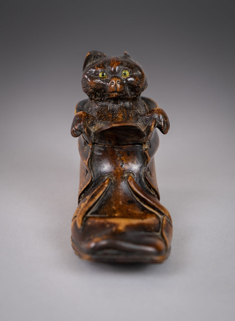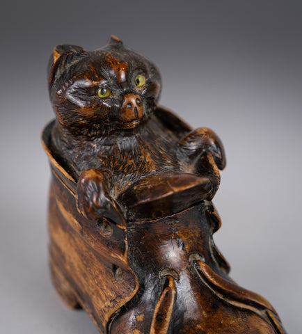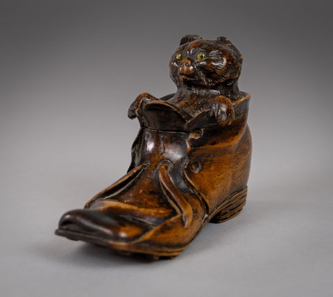 An absolutely charming 19th century inkwell finely carved to depict a cat sat in a boot.