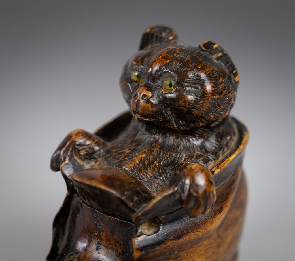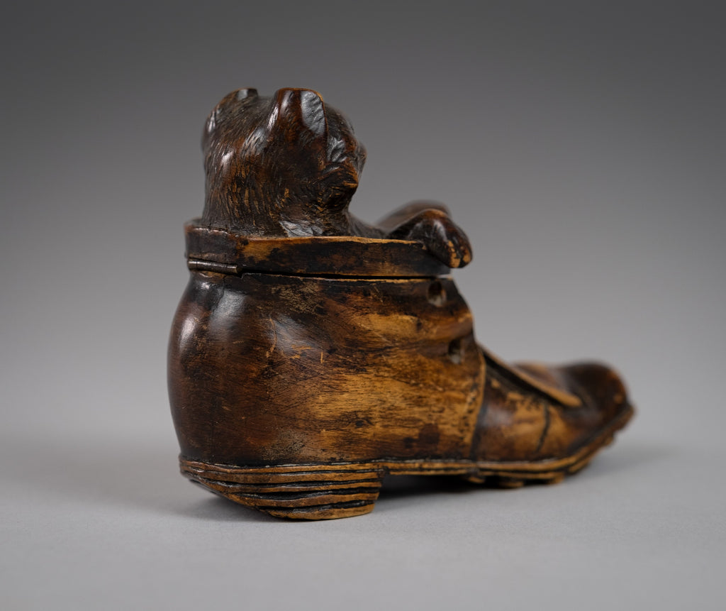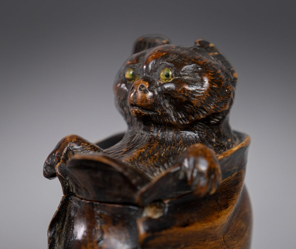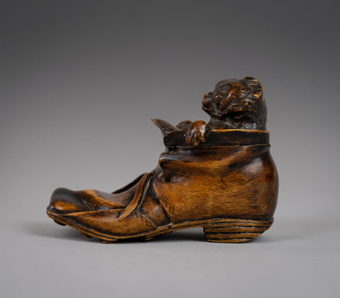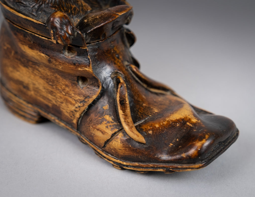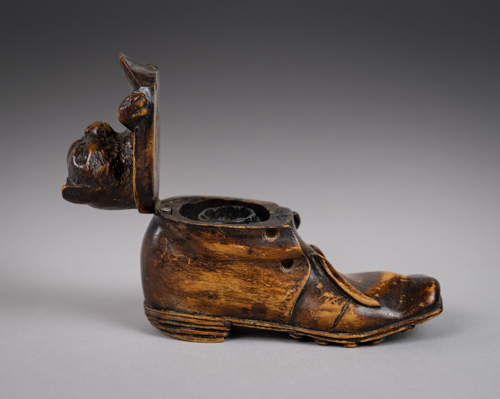 An absolutely charming 19th century inkwell finely carved to depict a cat sat in a boot.