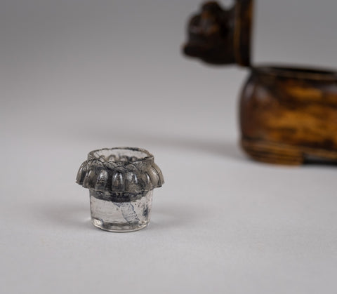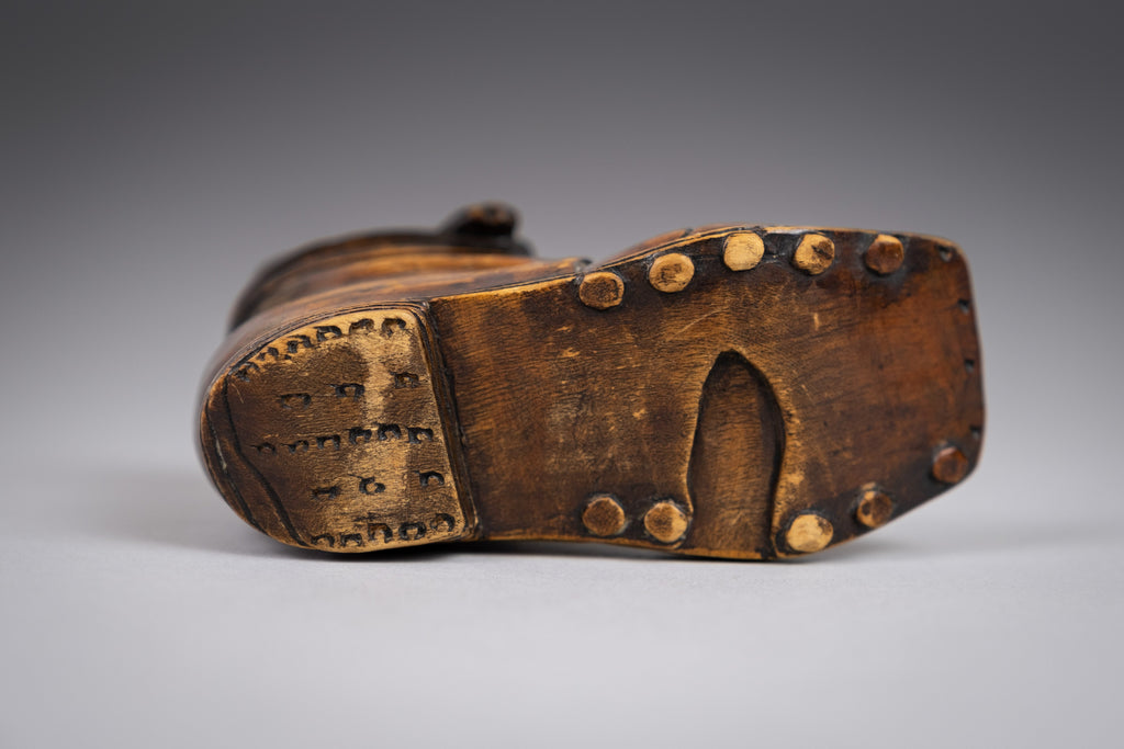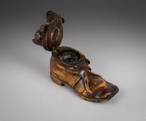 The top of the boot opens to reveal an inkwell interior. The small glass inkwell inside has numerous chips to the top commensurate with age and retains traces of ink.