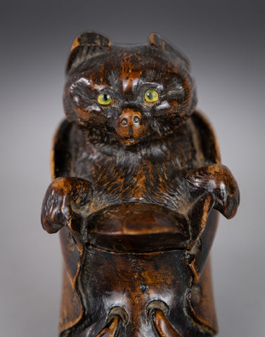 The inkwell is extremely well carved with wonderful attention to detail. The boot is realistically carved with care taken to include every detail, including the sole. The cat has a historic loss to an ear but this has patinated well with the rest of the piece. The cat has an endearing expression and rounded green glass eyes which seem to follow you wherever you go. The cat's paws sit either side of the boot opening.