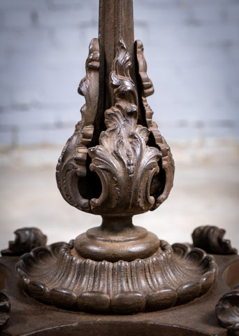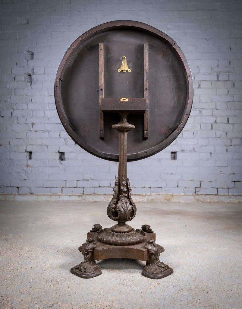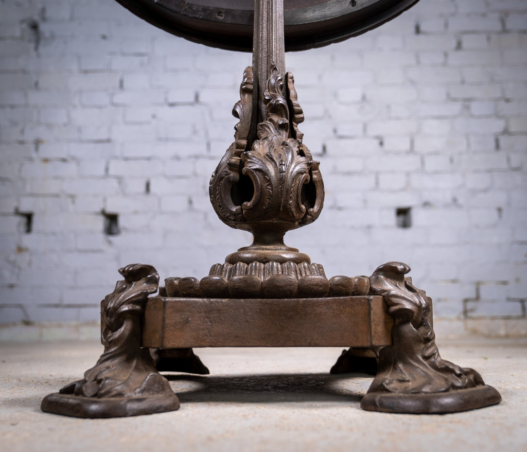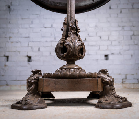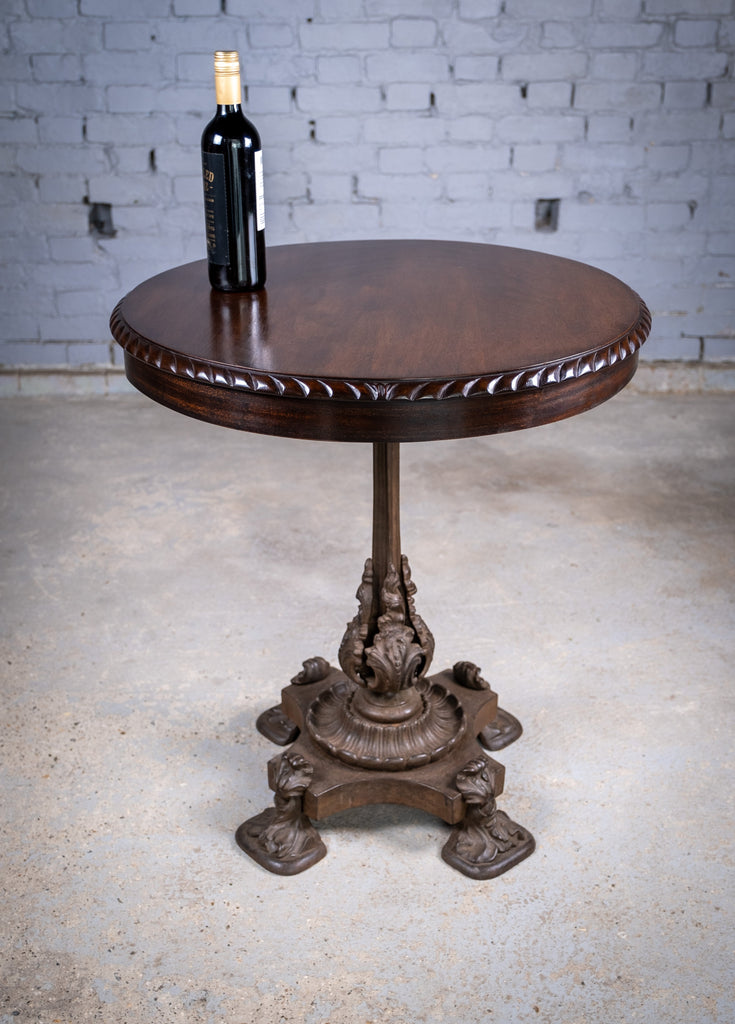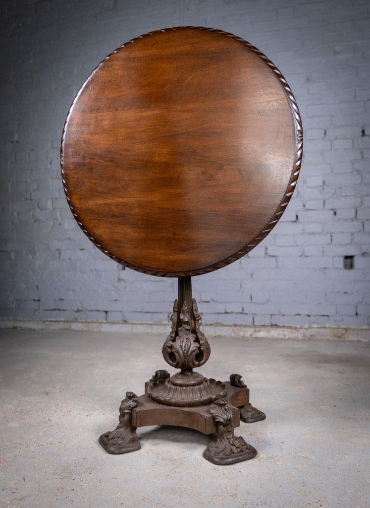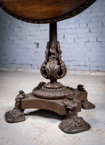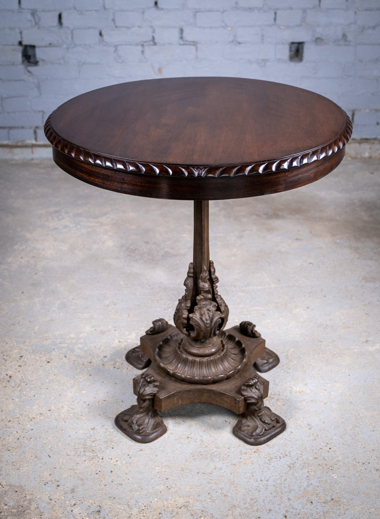 The mahogany top has a finely carved edge and a wonderful colour which glows in the light. The cast iron base is of a truly stunning design with foliate detail throughout.
