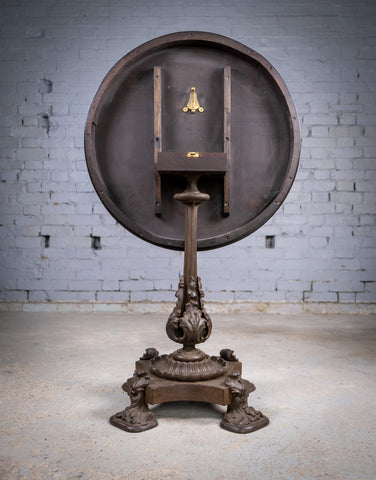 A large and substantial 19th century ornate cast iron base, with an early 20th century flame mahogany top and contemporary tilt top mechanism.