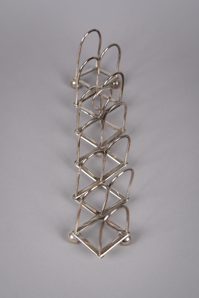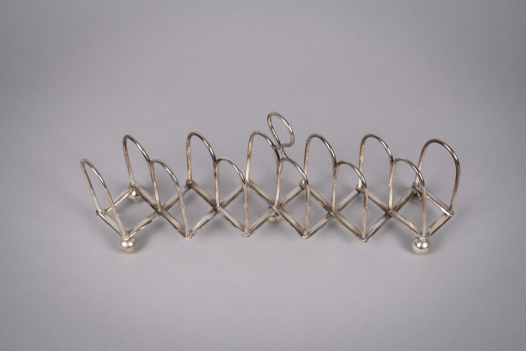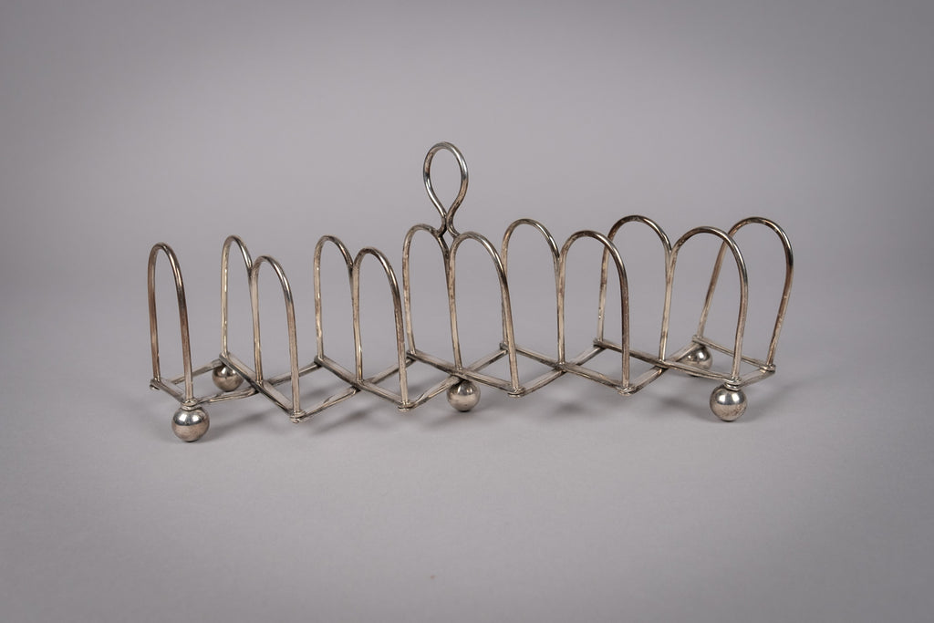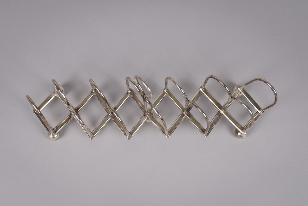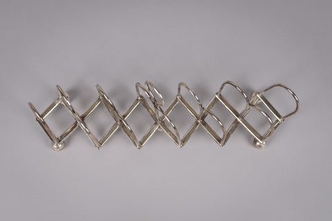 A 19th century concertina silver plated seven-bar toast rack. The first symbol of the maker's mark is rubbed but 'B & Co' remains clearly visible. Possibly AB & Co for A. J. Beardshaw & Co, Sheffield (active 1863-1866).