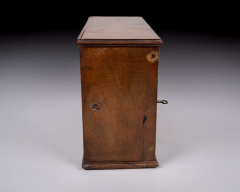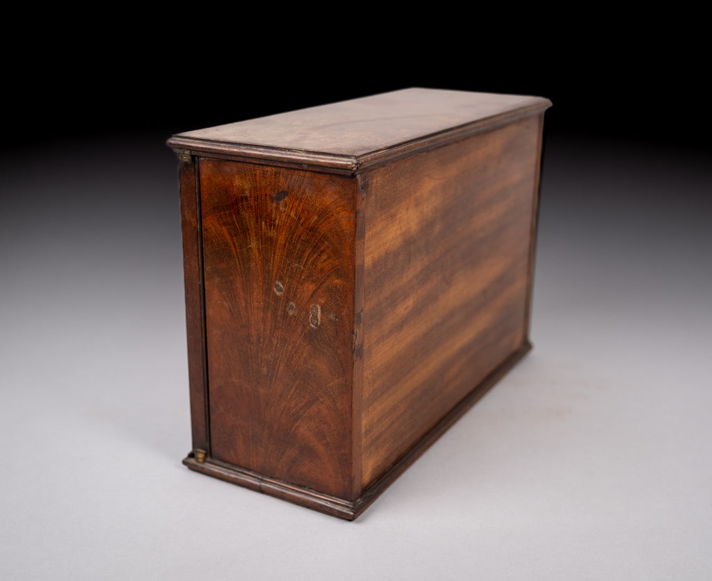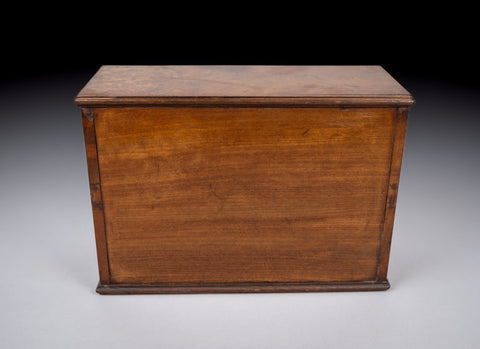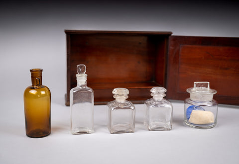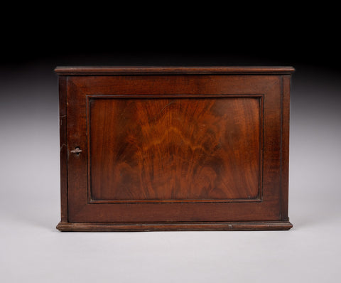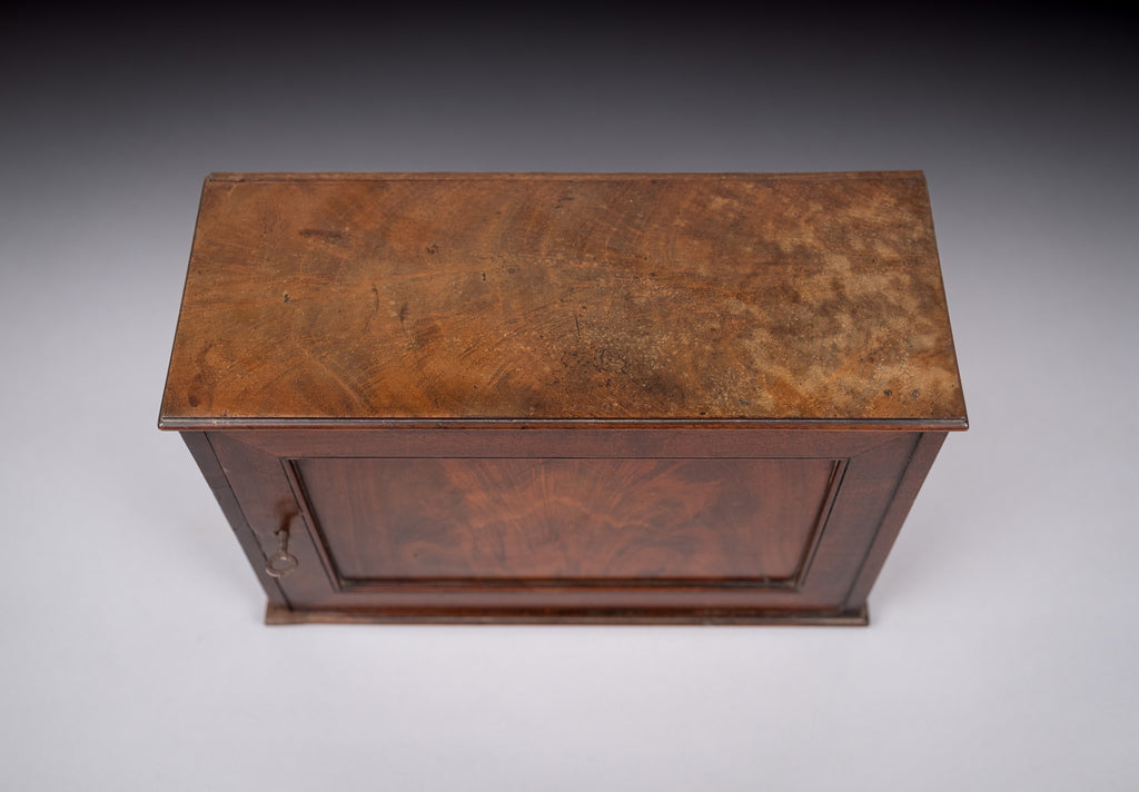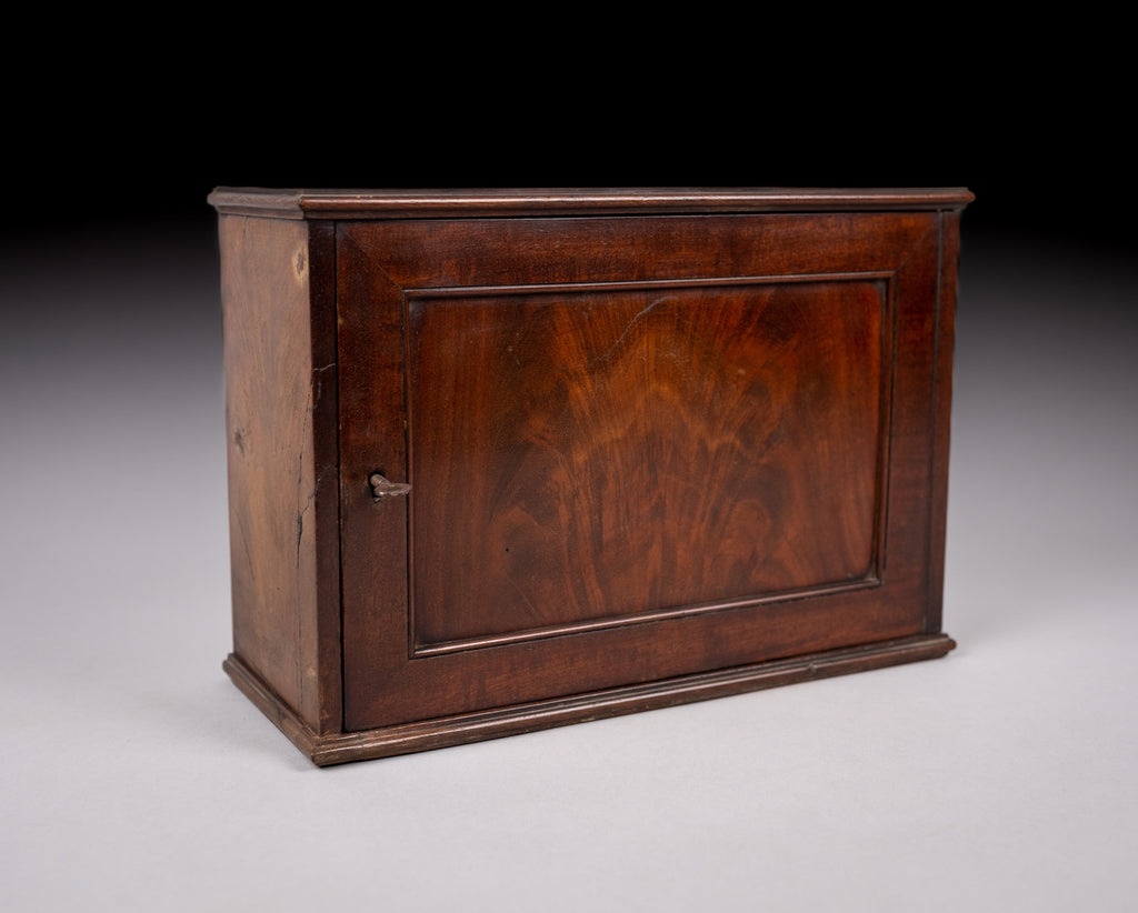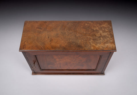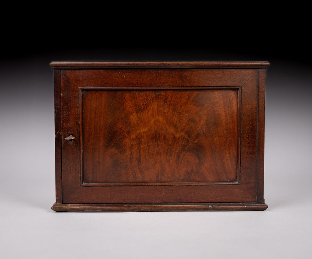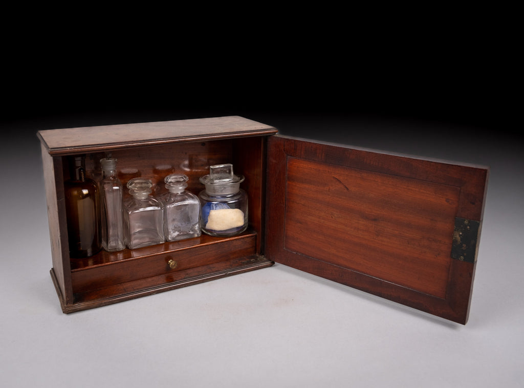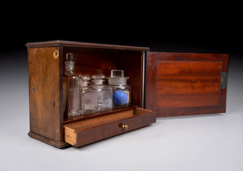 A charming mid-19th century mahogany apothecary cabinet of small proportions with an arrangement of 19th century and later apothecary/chemist bottles, and working lock and key.