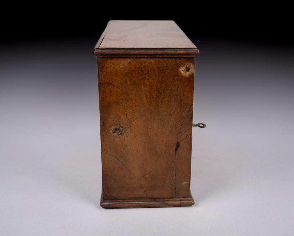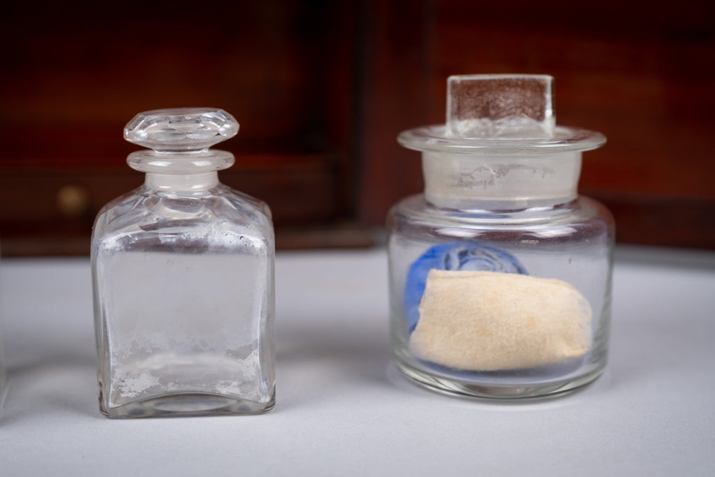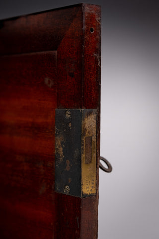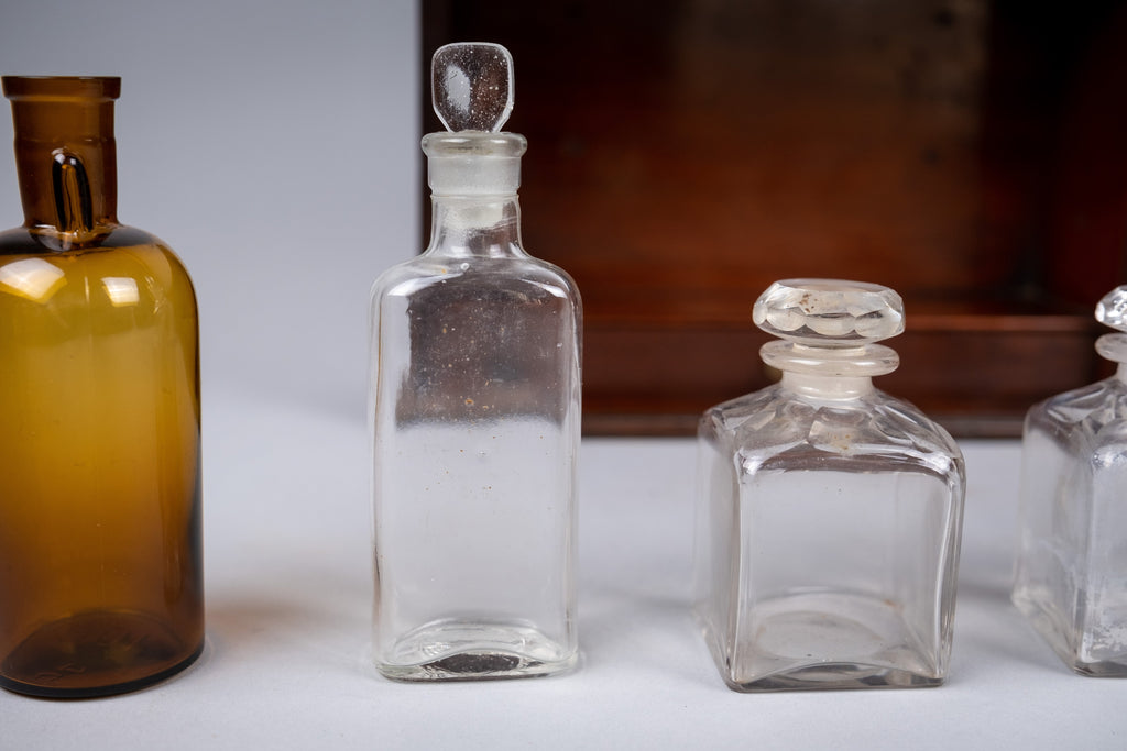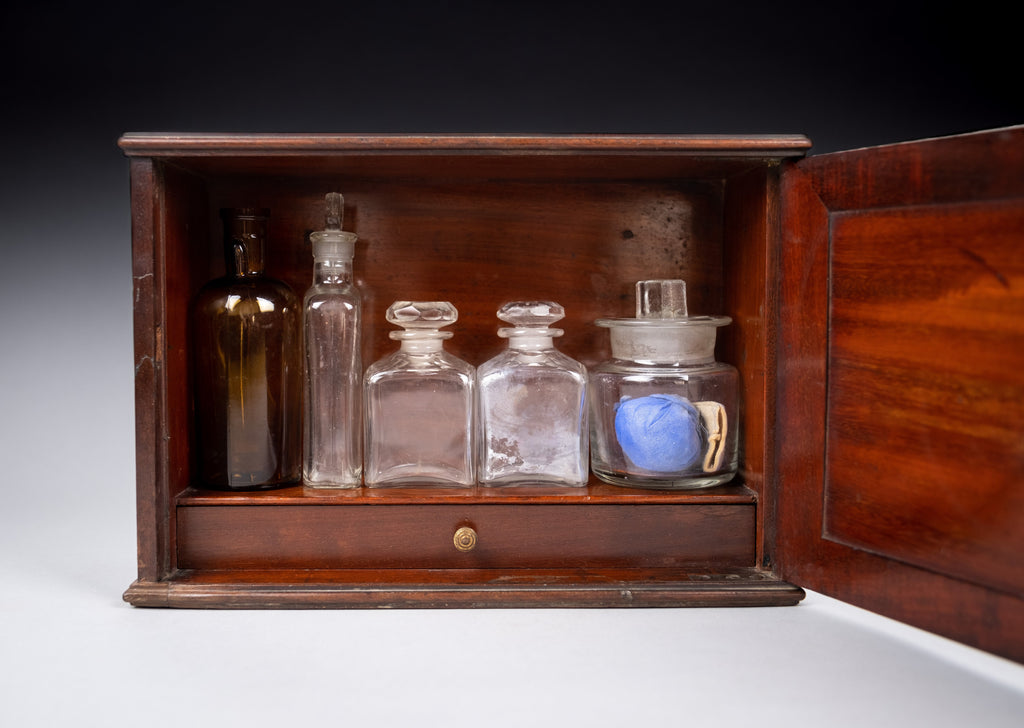 The door opens to reveal a recess holding numerous hand-blown glass chemist bottles and a brass handled drawer. The lock, key, hinges and drawer actions all operate as they should.