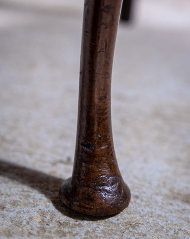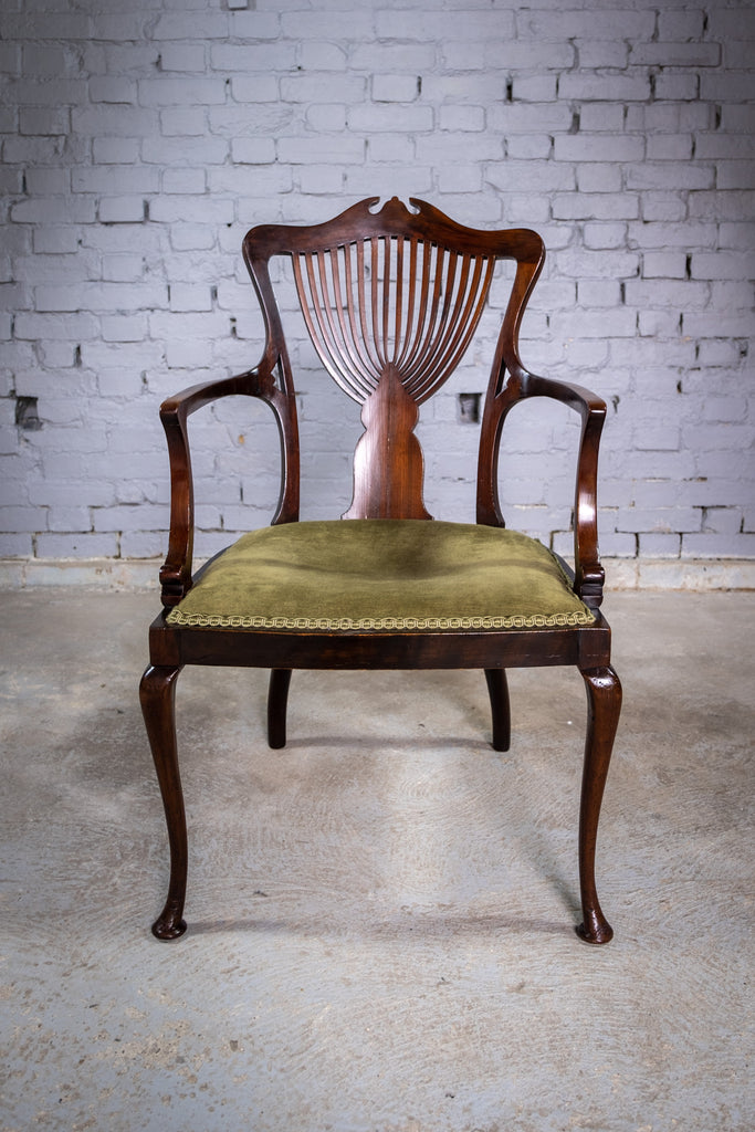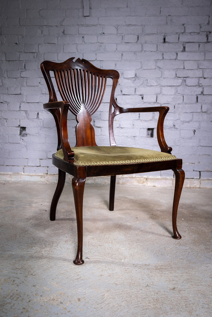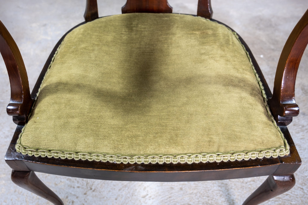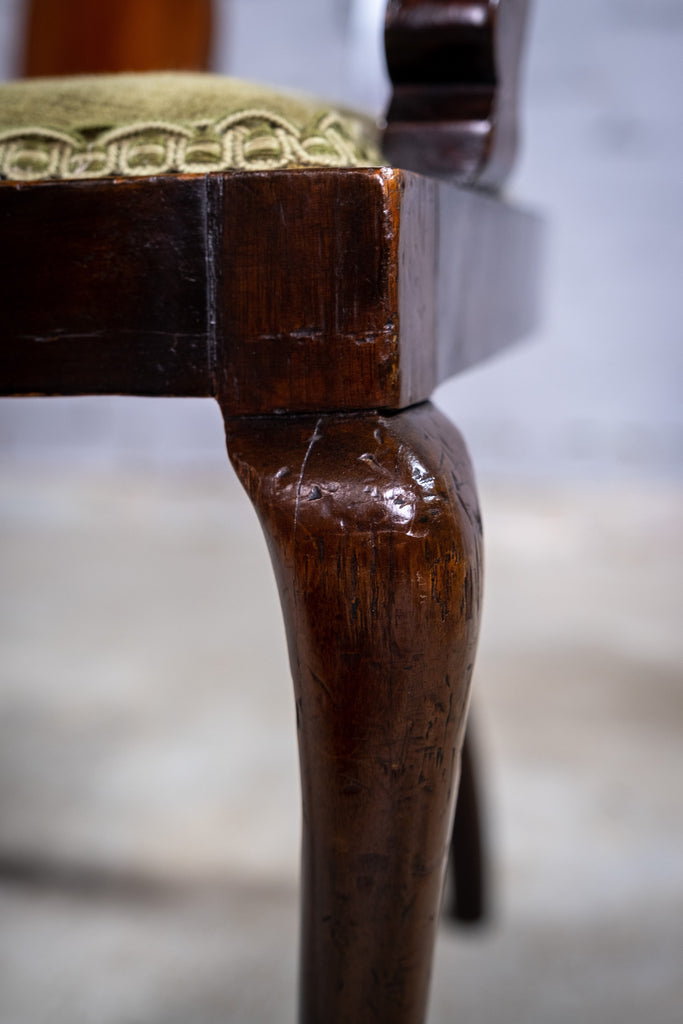 The chair boasts a pierced fan back rest and green upholstered seat above pad foot cabriole fore legs. The chair has some marks commensurate with age (please see photographs) but remains firm and sturdy. The upholstery has age but remains clean. The wood has a wonderful patination throughout, particularly to the legs and fore pad feet.