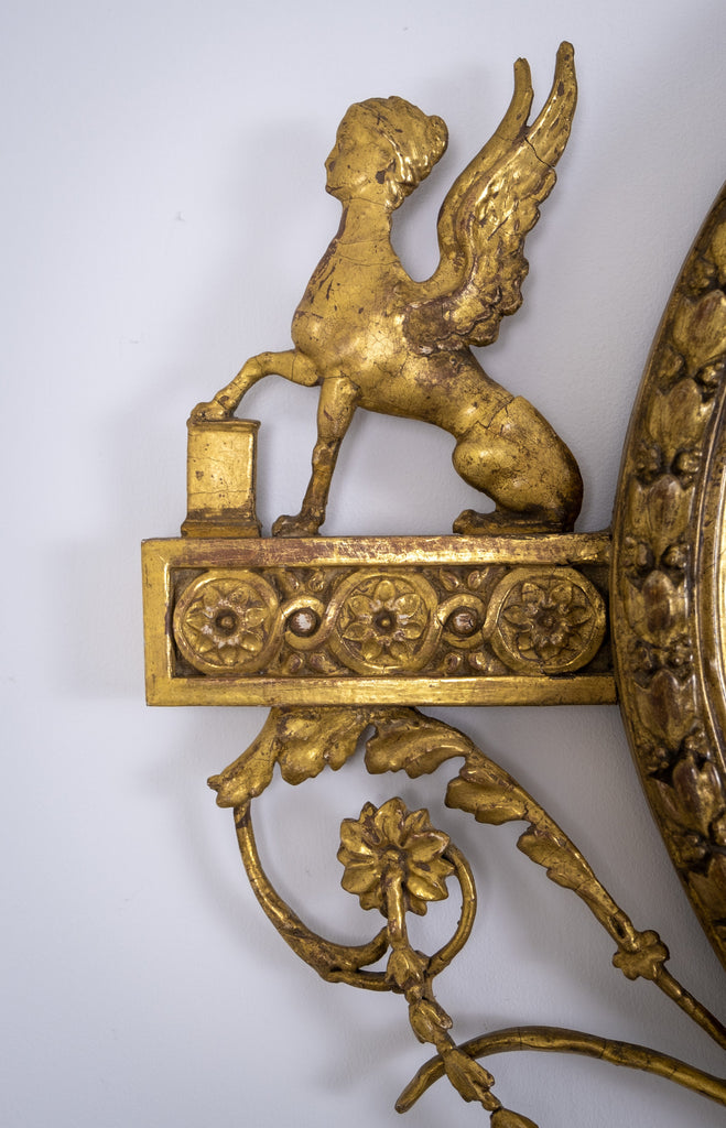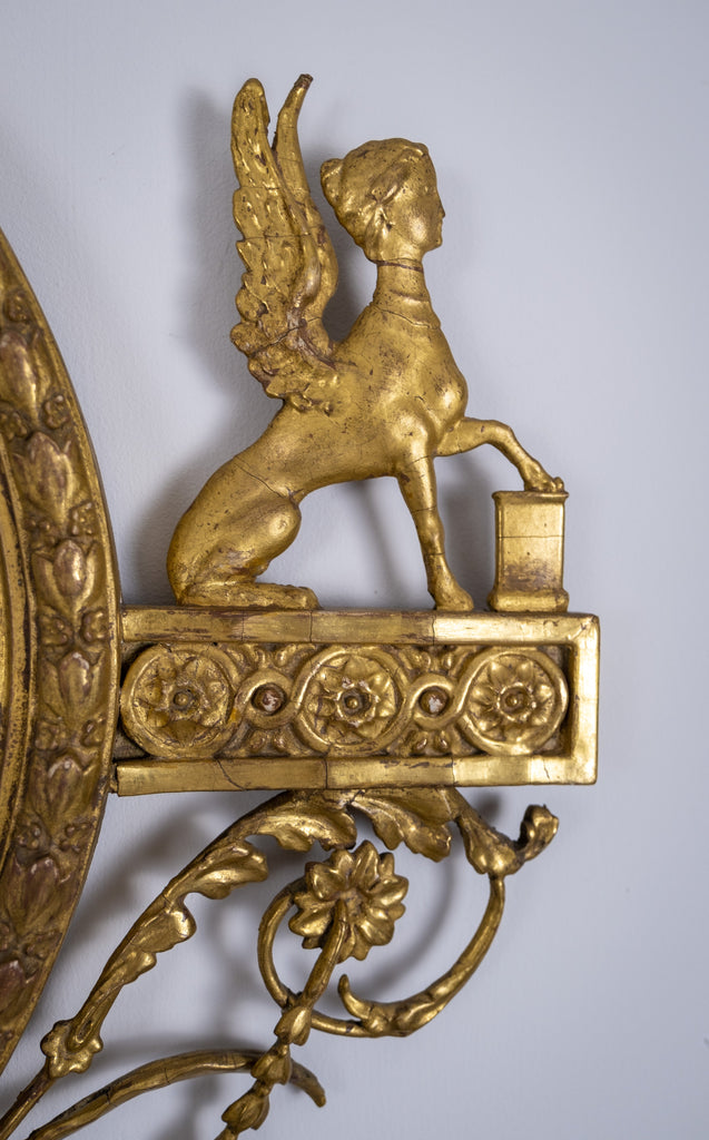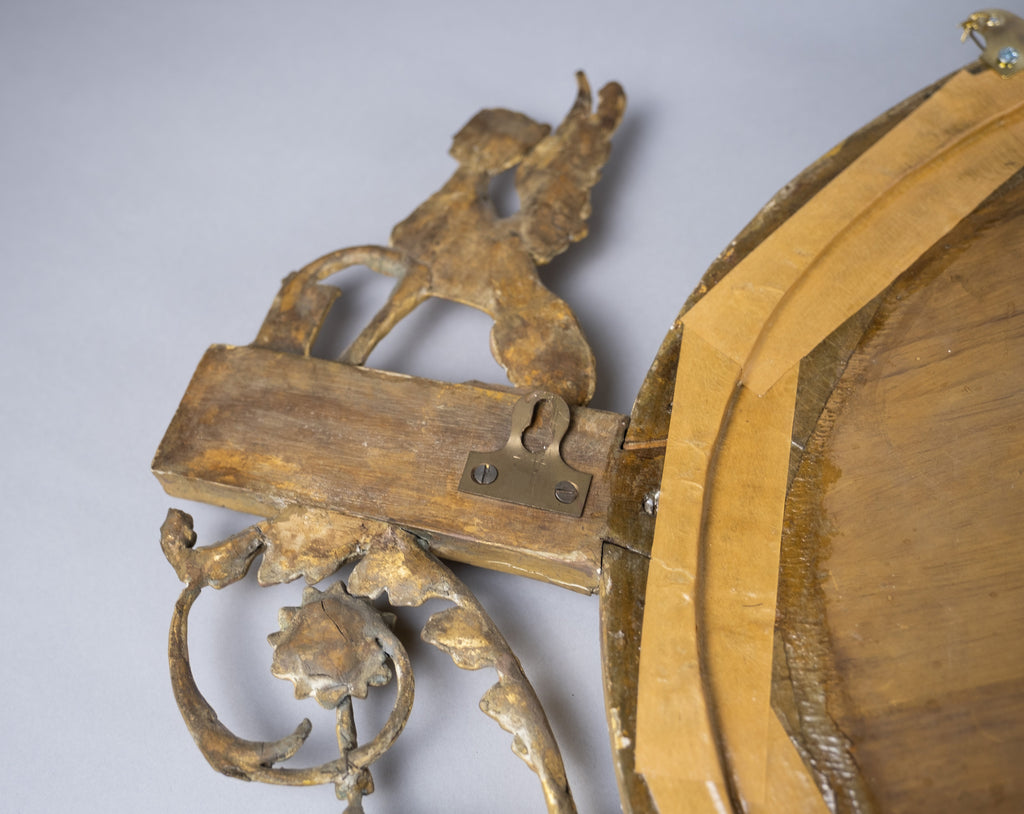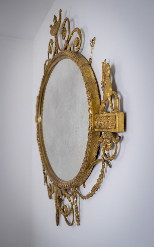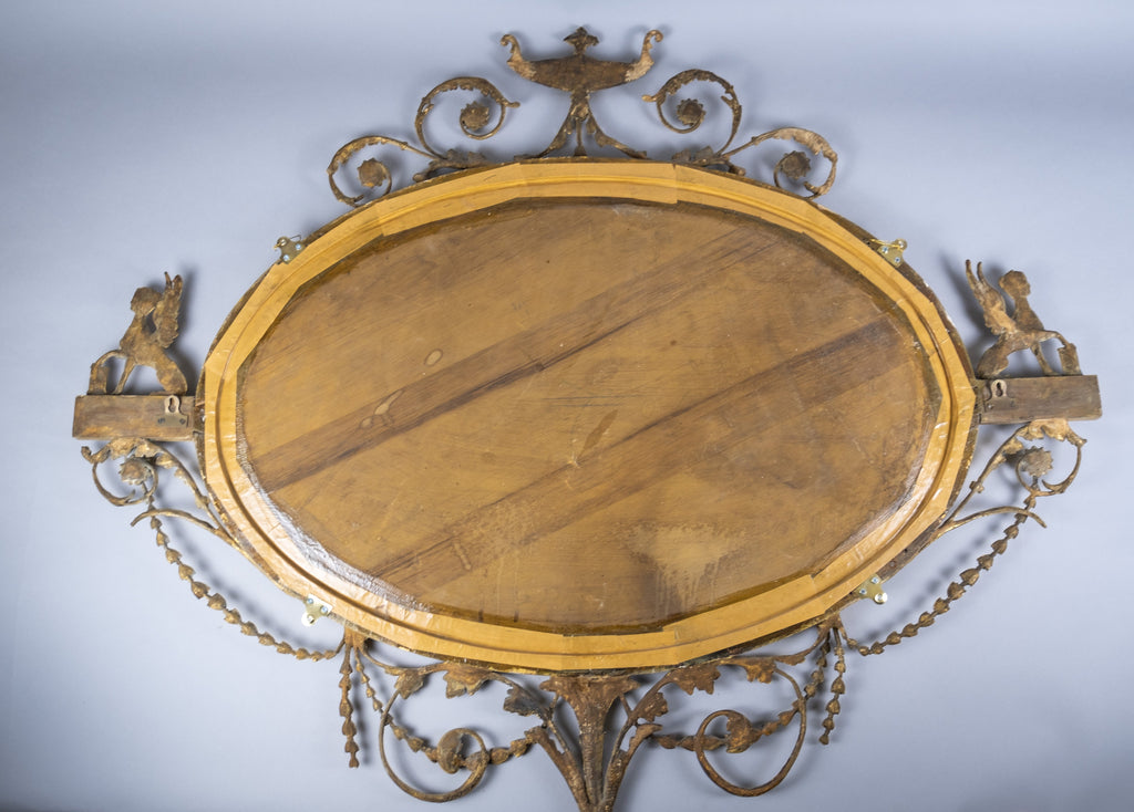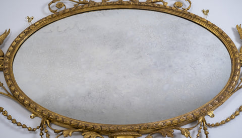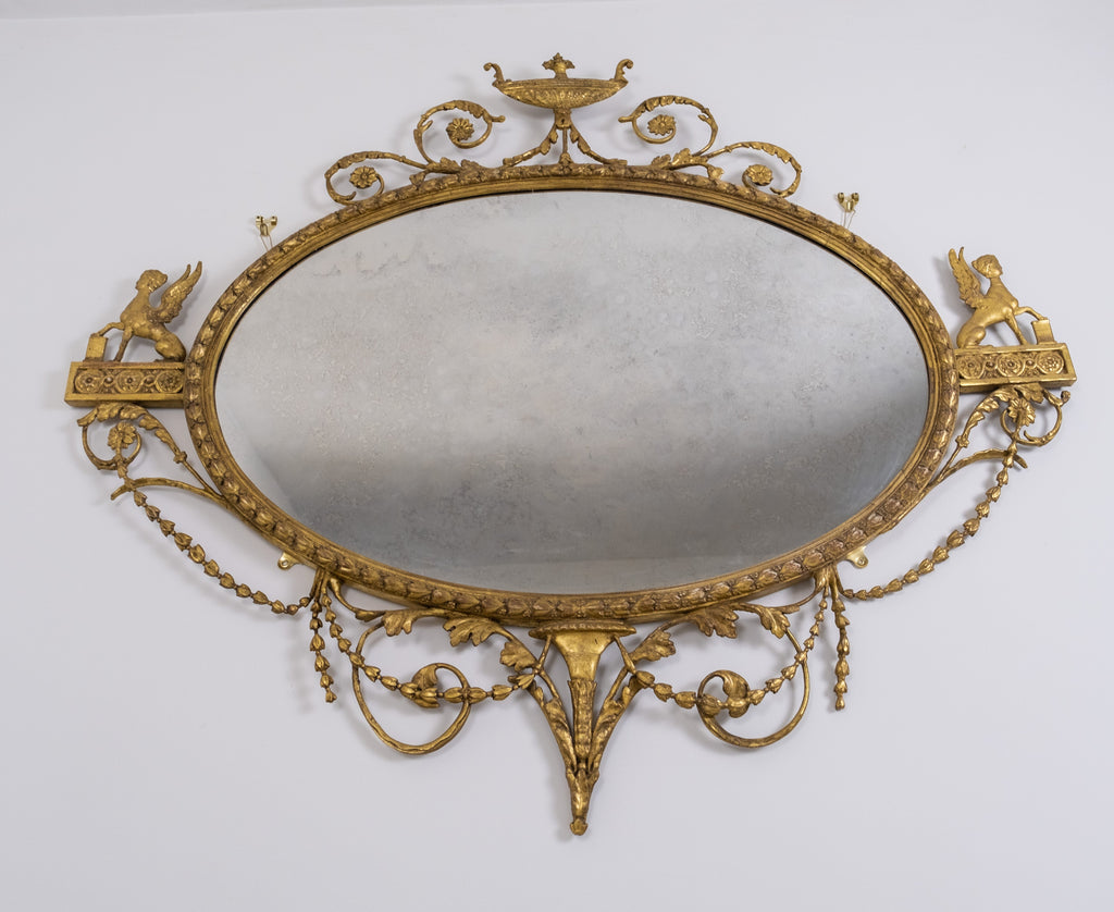 The oval mirror plate is flanked by Sphynx ornaments, swag and harebell decoration and topped with an urn finial. The original mercury mirror plate has foxed beautifully but remains reflective.