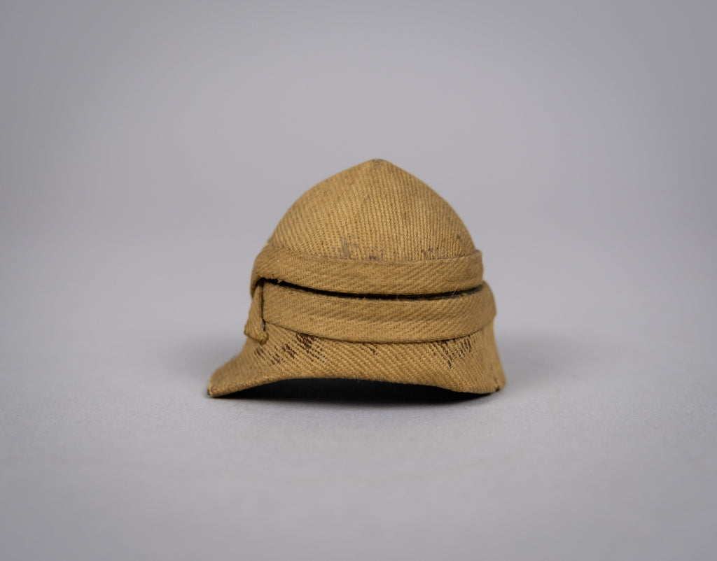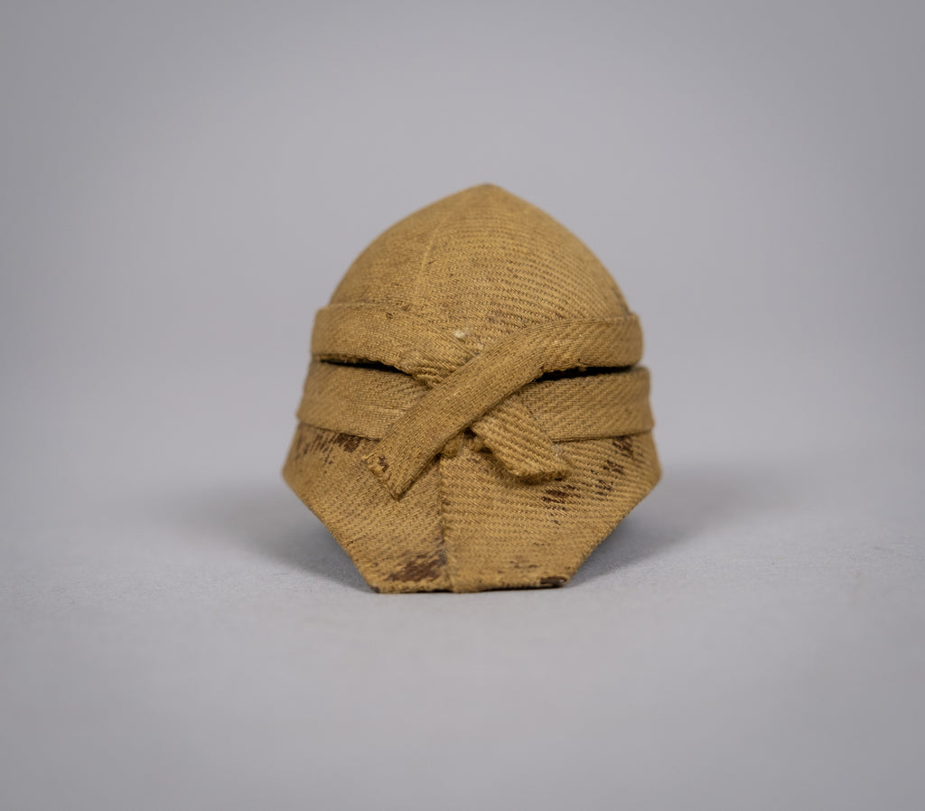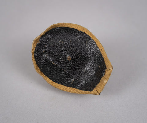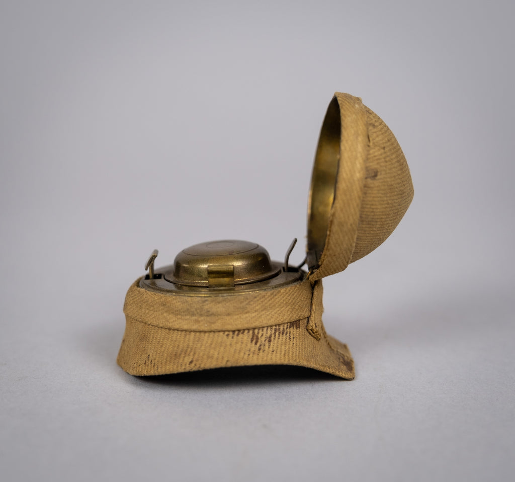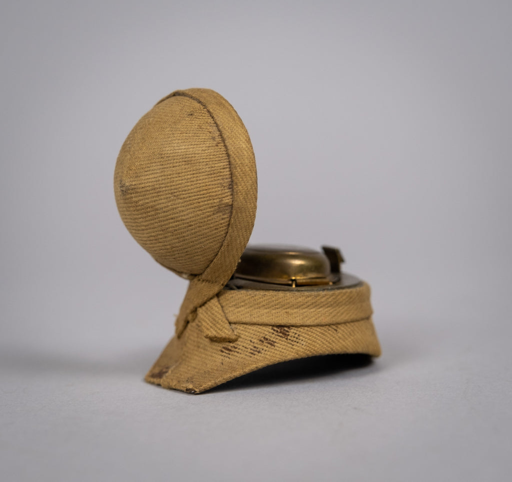 The helmet is covered in a quality cloth with a black paper lining to the base. The inkwell is operated by pressing a concealed push button the front, and opens to reveal a brass interior with original bottle and ink.