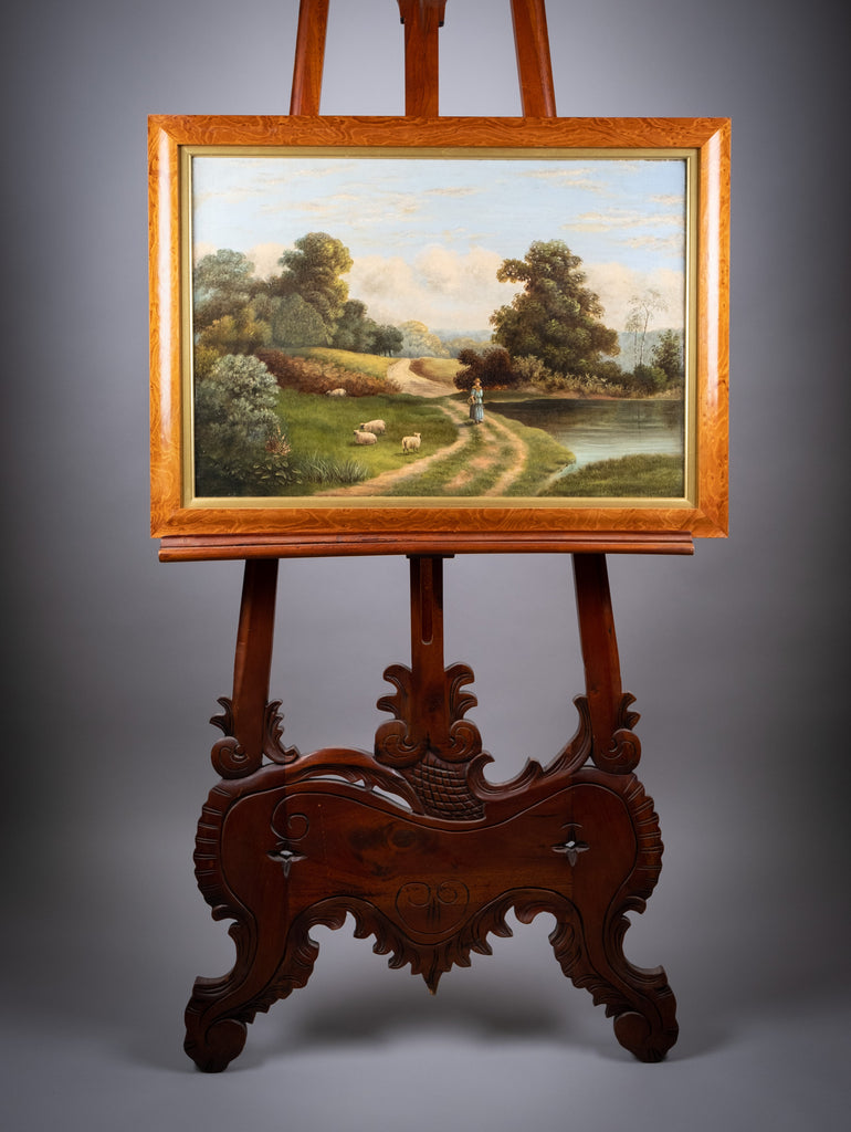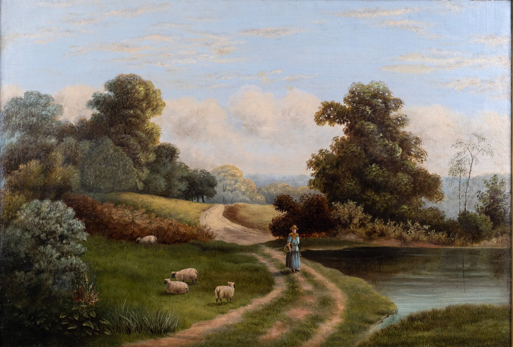 A large late 19th/early 20th century oil on canvas depicting a rural scene with a lady walking by a pond with sheep and a rolling hills to the background. Signed 'T. Morris' to the lower left.