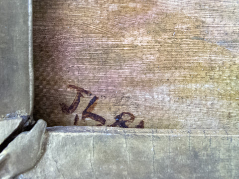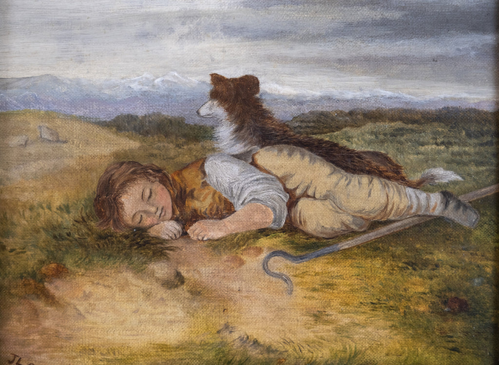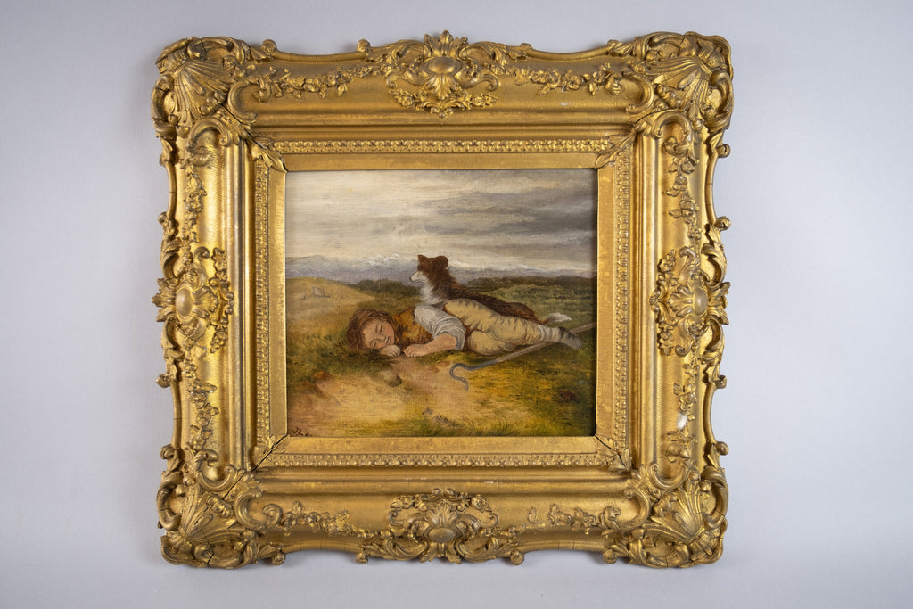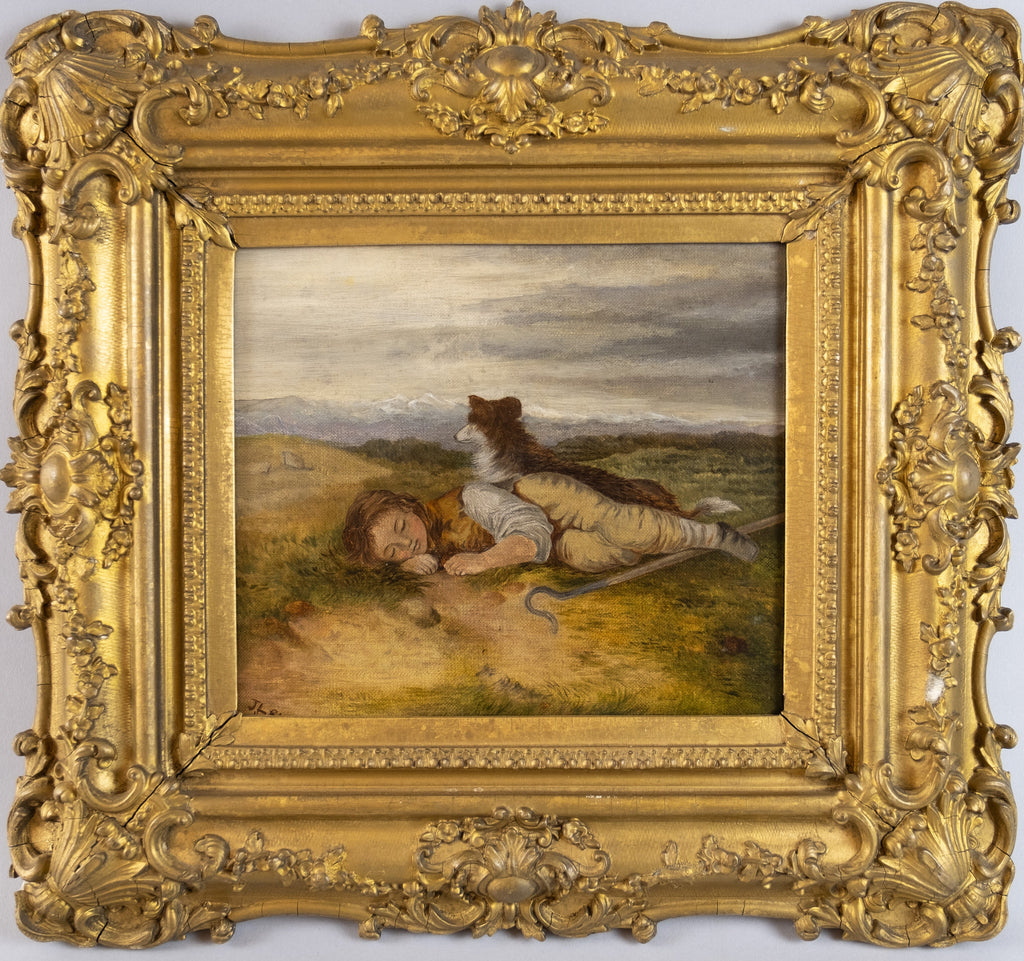 A late 19th century oil on canvas depicting a resting shepherd and dog in a mountainous landscape. The work is initialled 'J.L' to the lower right and dated 188[?] (the last number is obscured by the frame).
