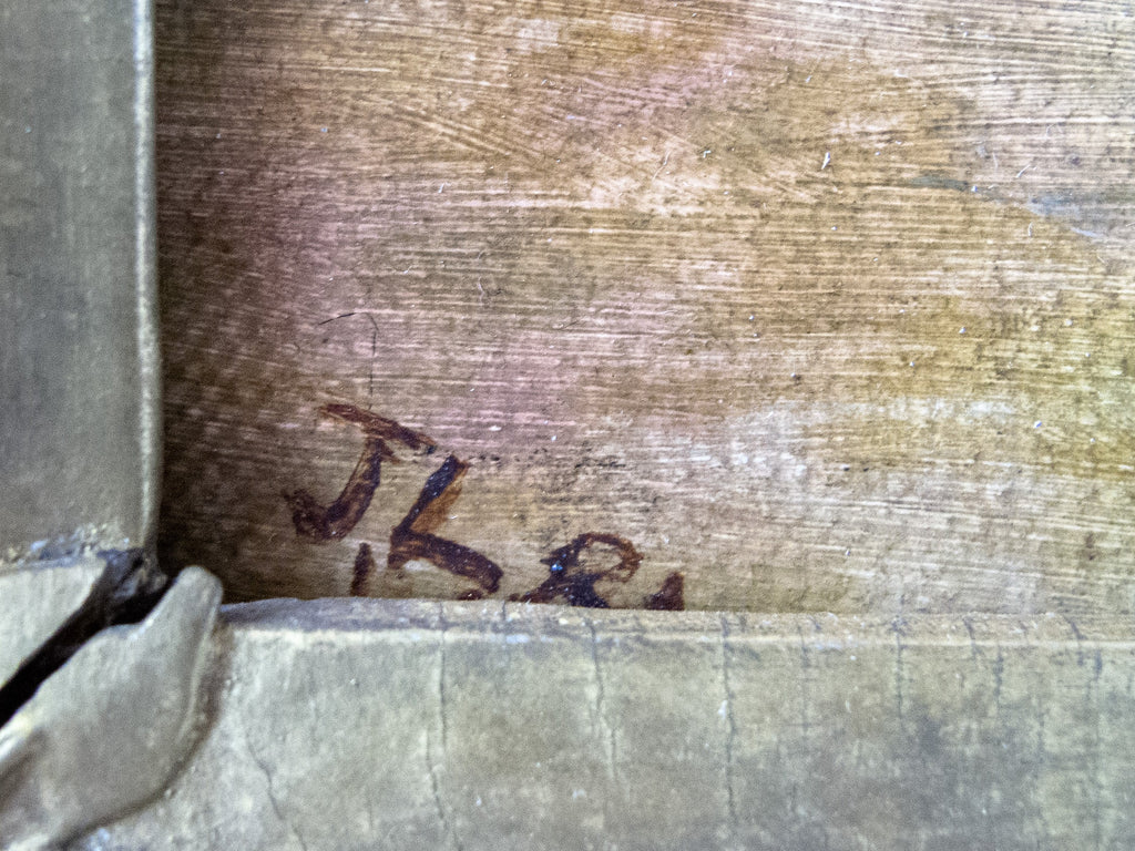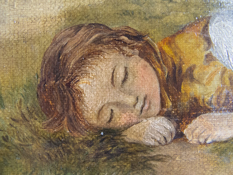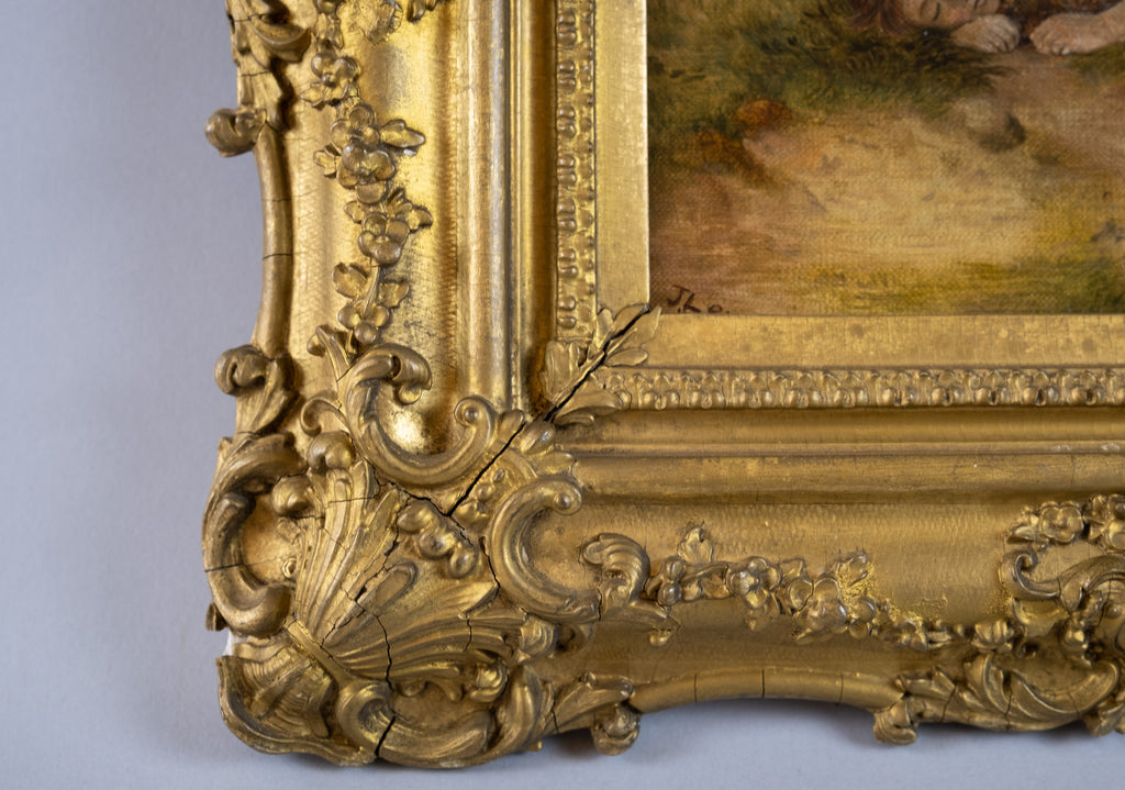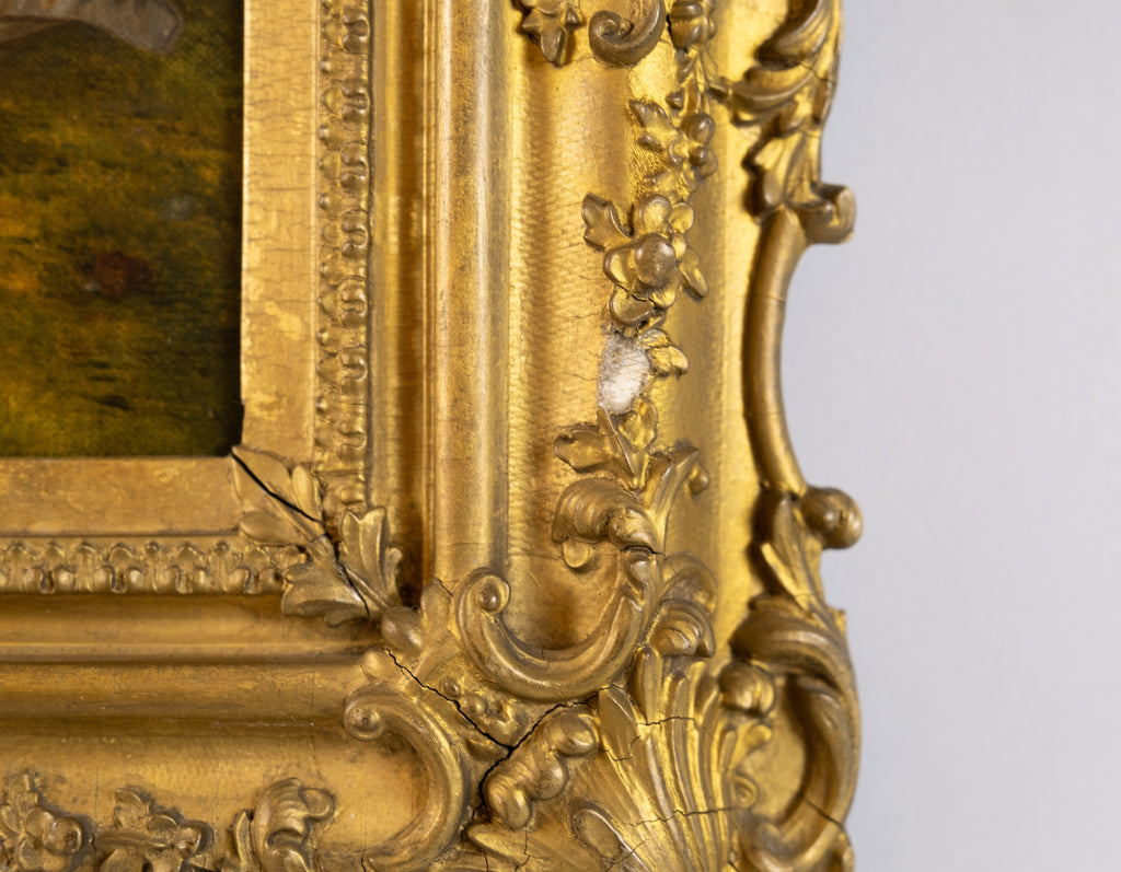 The work is beautifully done and of lovely proportions. The shepherd's face in particular is very well executed. The work is in excellent condition throughout. The right side of the frame has a small chip to the gilt and the left corner shows some (please see photographs).