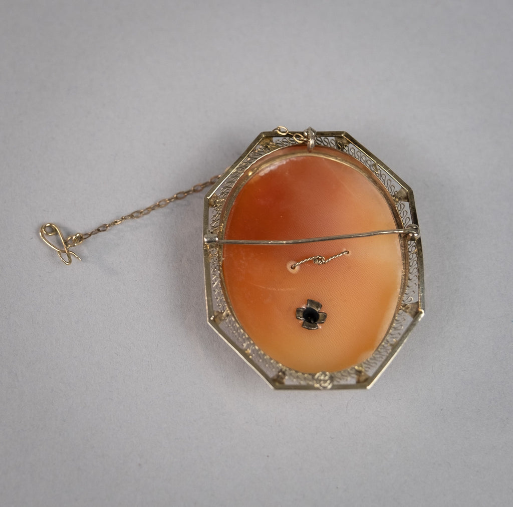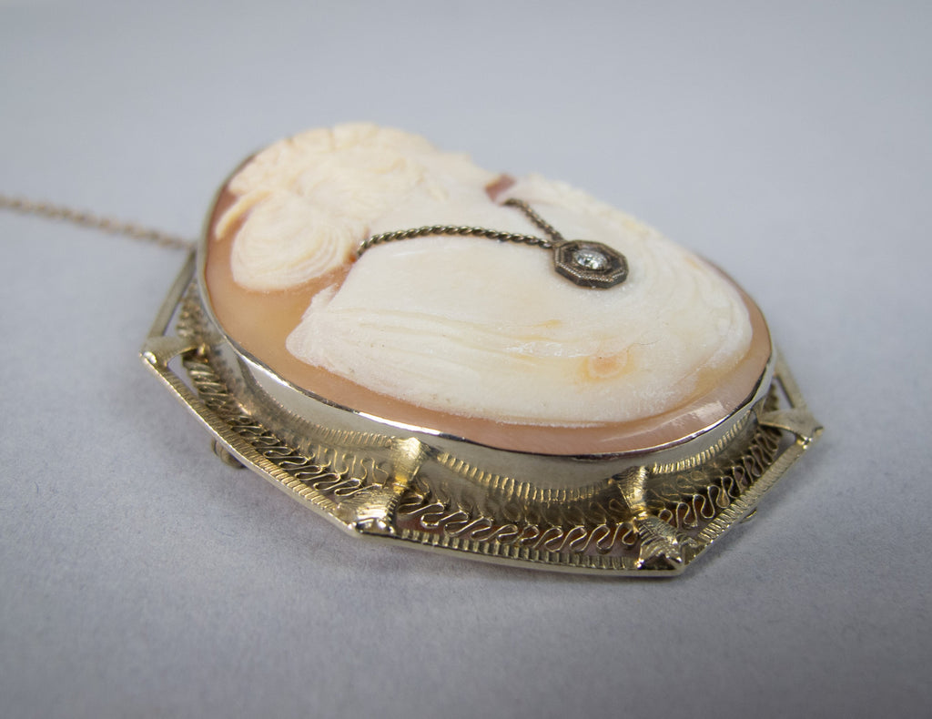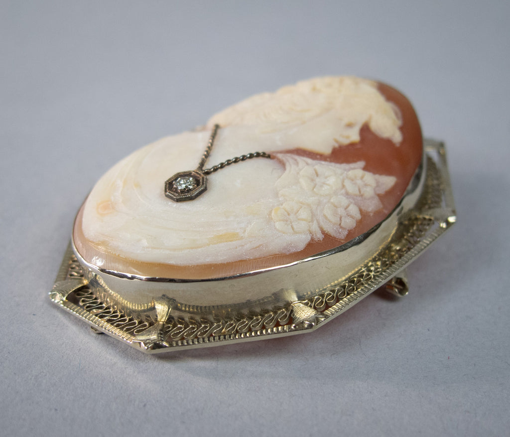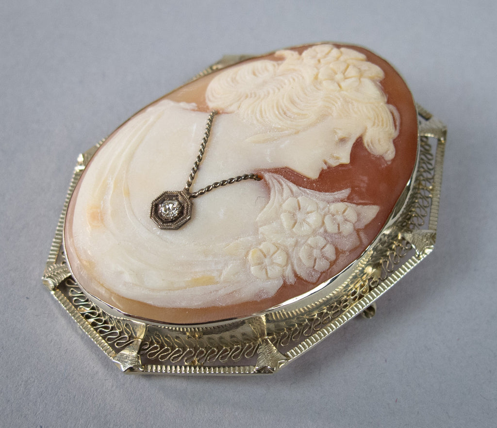 This is a particularly attractive example and is in an excellent condition throughout. The filigree remains free from damage, the cameo is finely carved and the diamond has a wonderful bright sparkle when it catches the light.