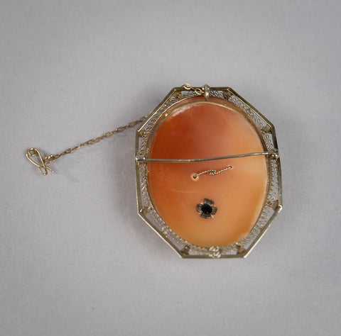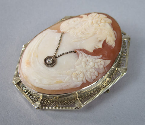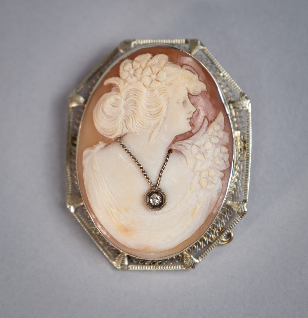 Antique 14 Carat White Gold Filigree & Diamond Carved Cameo Brooch.