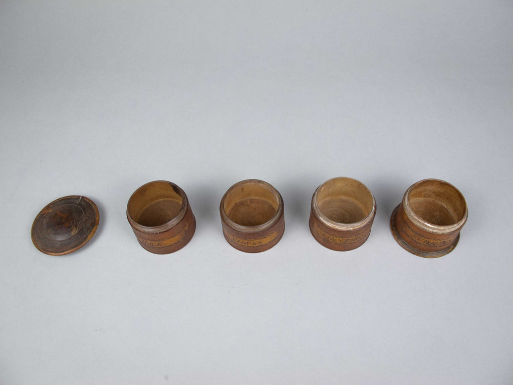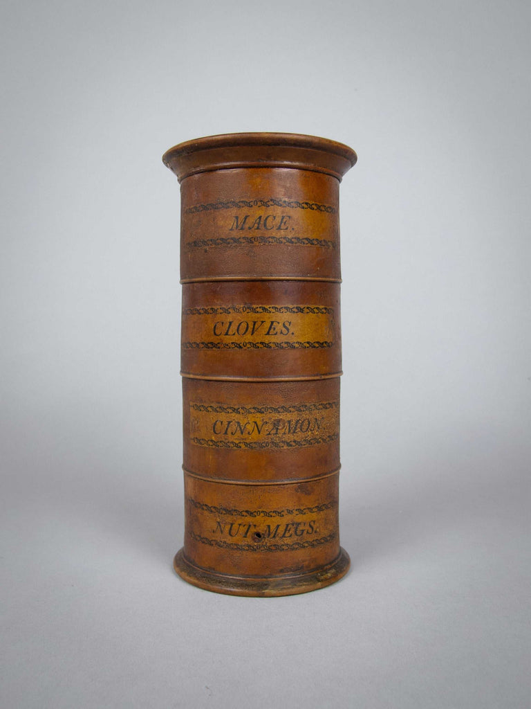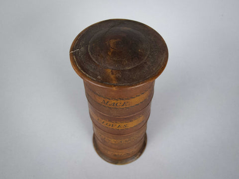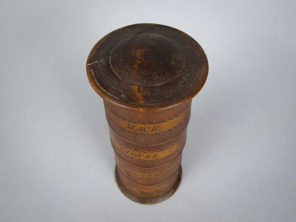The tower's cap has a small split to the wood and the 'Nutmegs' compartment has a very small hole (please see photographs). Overall the set remains in a very attractive condition with all labels present and legible, and all compartments fitting together as they should. The wood has also absorbed a wonderful scent of nutmeg and cloves from 200 years of use which adds to this piece's charm.