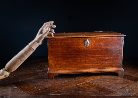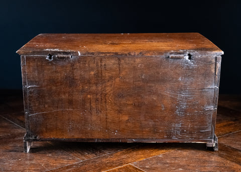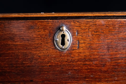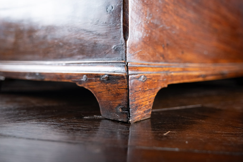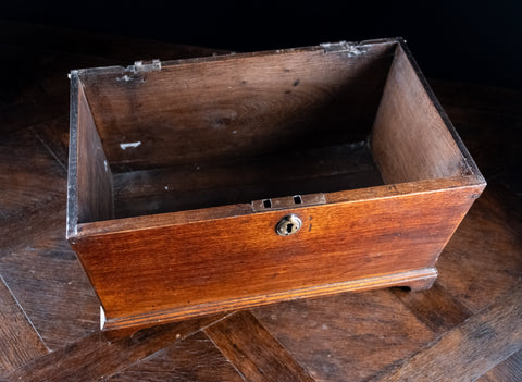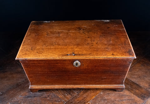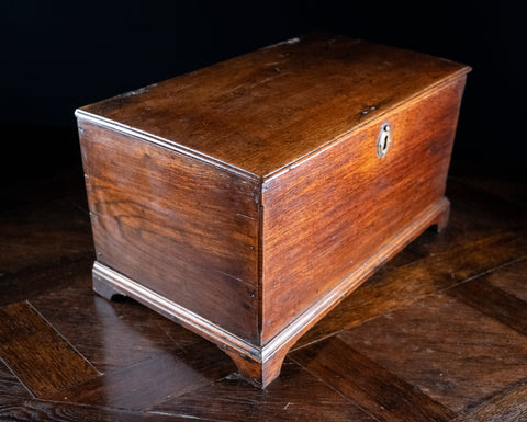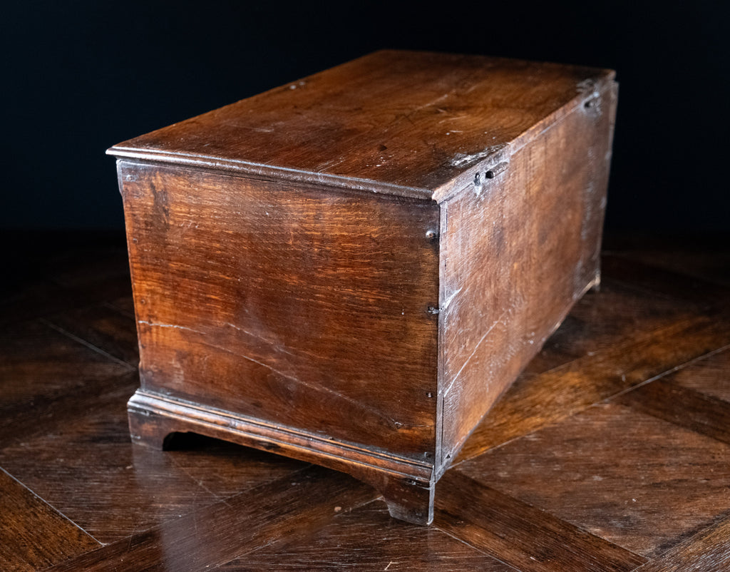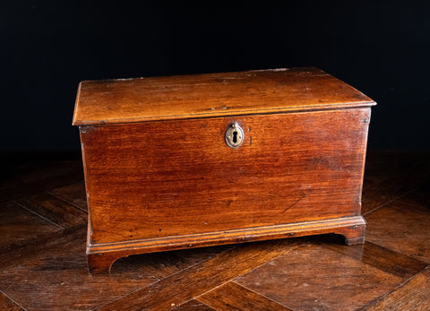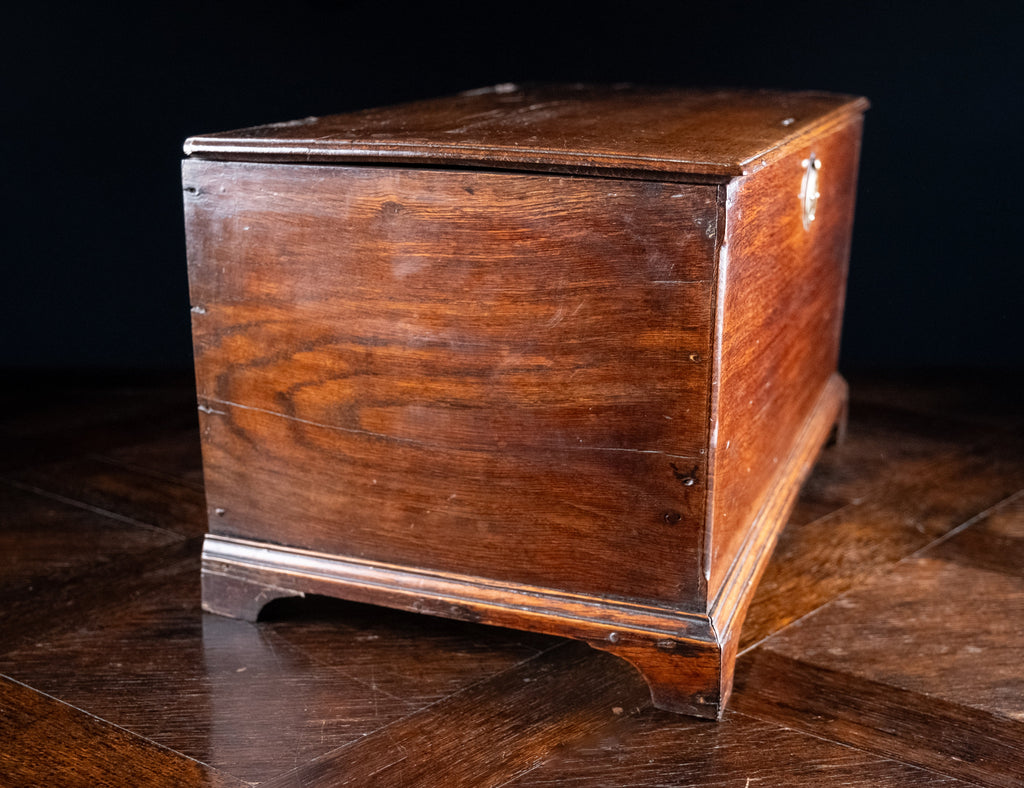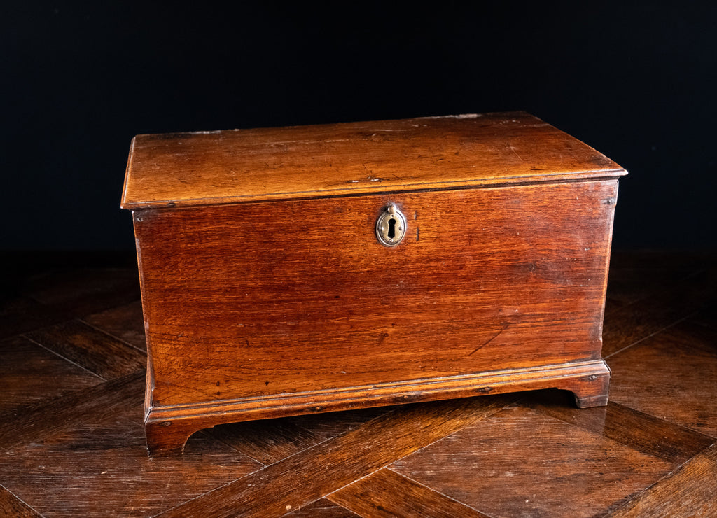 The box is of lovely proportions and has fantastic colour. The box has chamfered edges, bracket feet, brass escutcheon and historically replaced hinges; the small holes from the original iron loop hinges remain present. The lid needs a little wiggle when closing to align and fully close but otherwise the box remains in a very good condition throughout.
