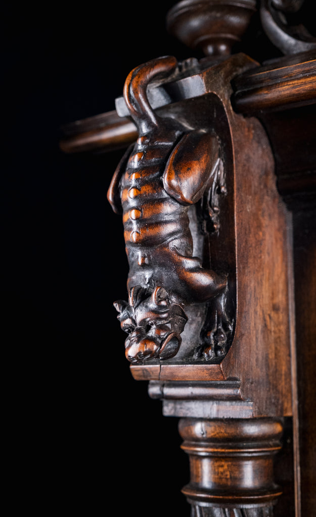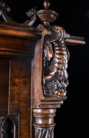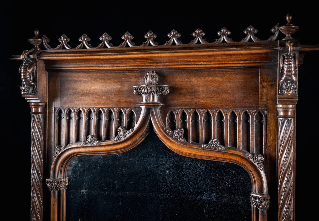 The ogee arched bevelled plate is flanked by intricately carved spiral columns, each surmounted by a finely carved beast, the whole beneath an urn flanked gothic cresting.