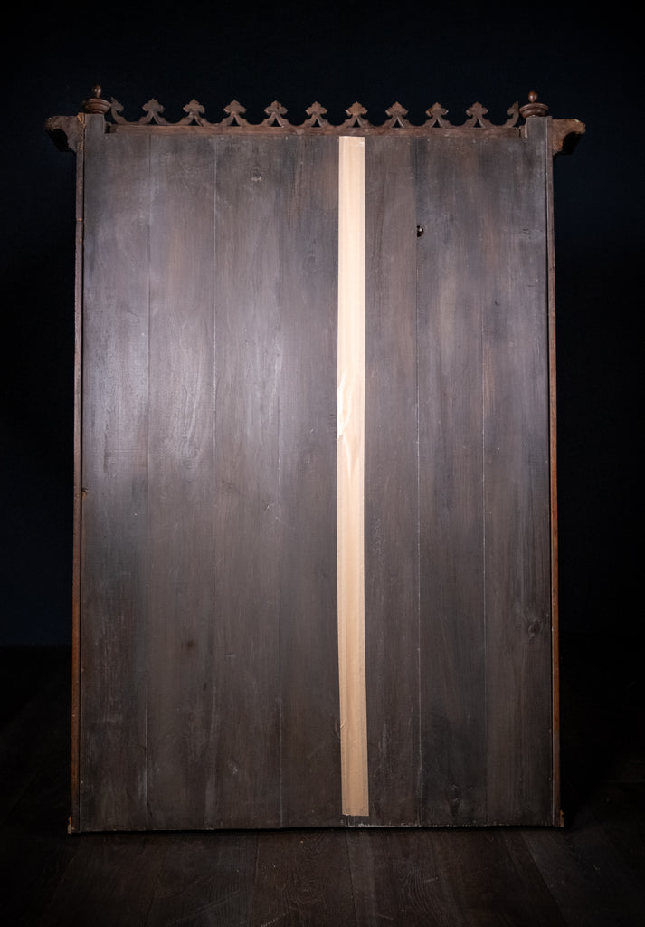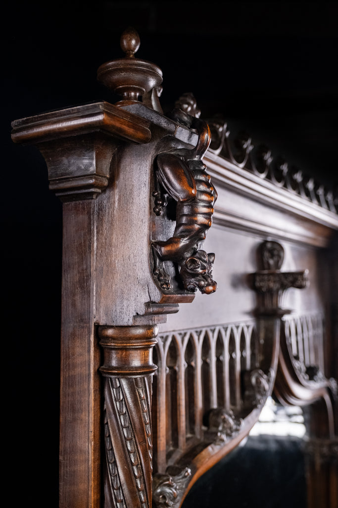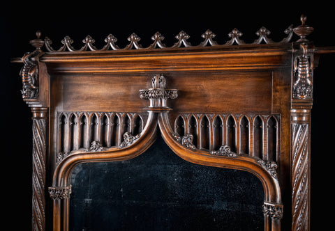 A fine gothic walnut overmantel mirror of large proportions, circa. late 19th century. Likely North European in origin.