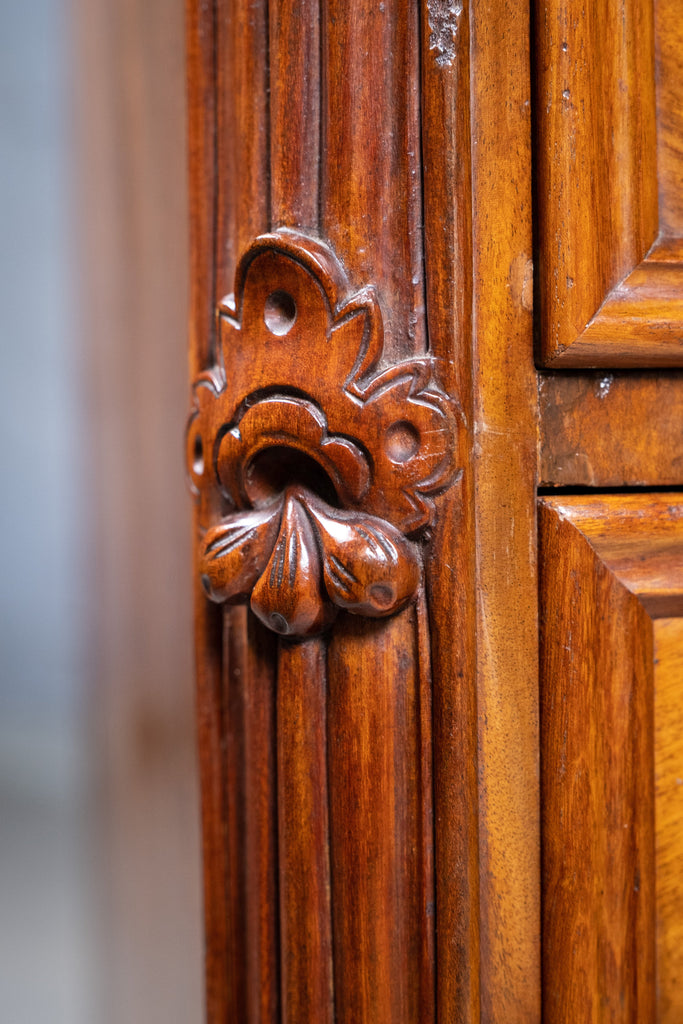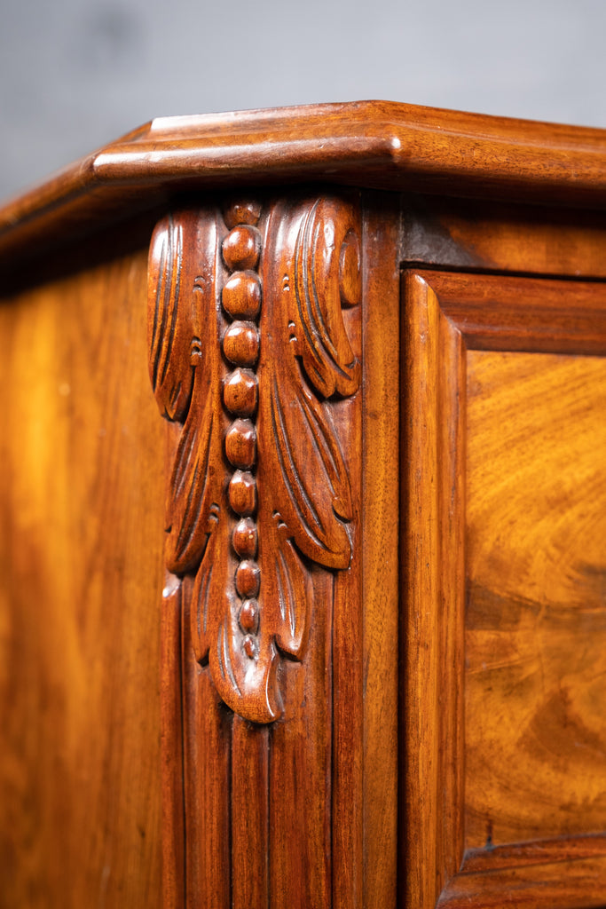 The piece is of truly exceptional quality throughout. Four large graduated drawers with original rams' head brasses are flanked by two columns adorned with finely carved foliate detail, all above bracket feet. The colour of the wood is outstanding and really does glow when caught by the light.