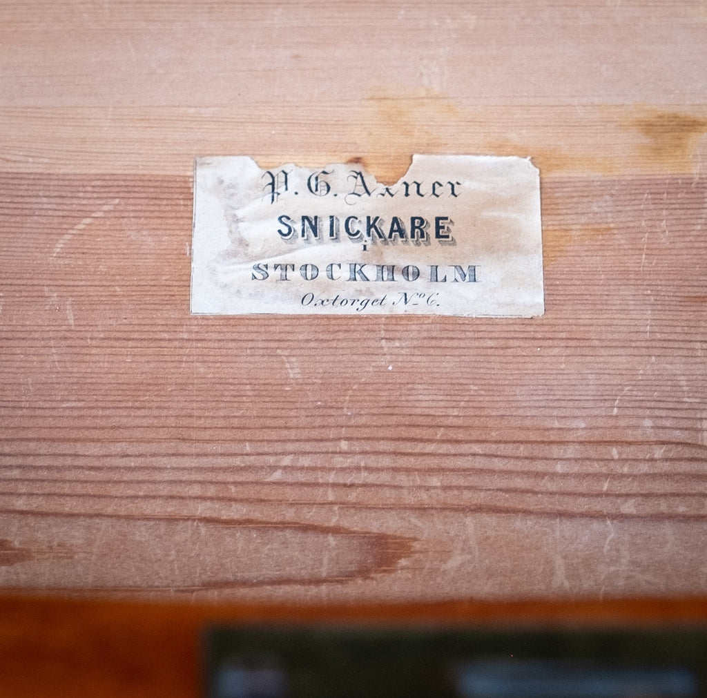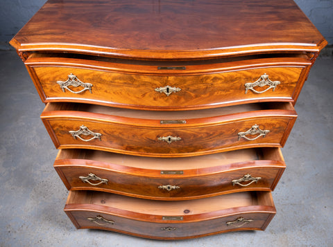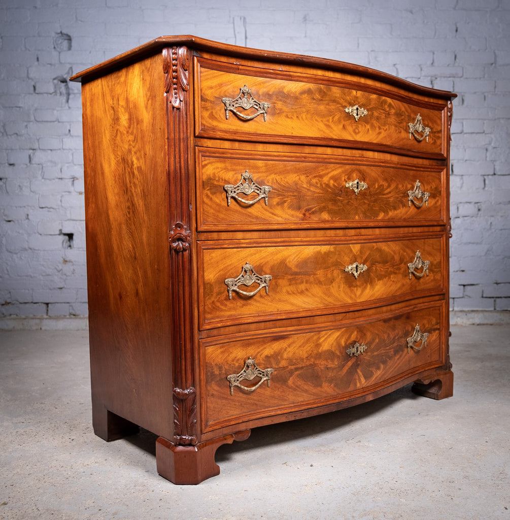 A stunning mid-19th century Swedish serpentine flame mahogany chest of drawers, c.1850, with the original maker's label 'P. G. Axner, Snickare [Carpenter], Stockholm, Oxtorget No 6', retained to the inside top drawer.