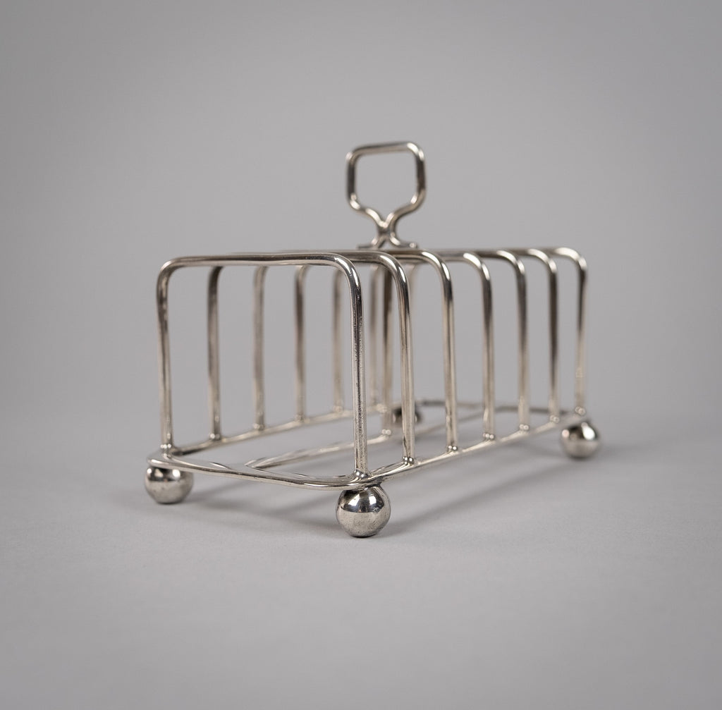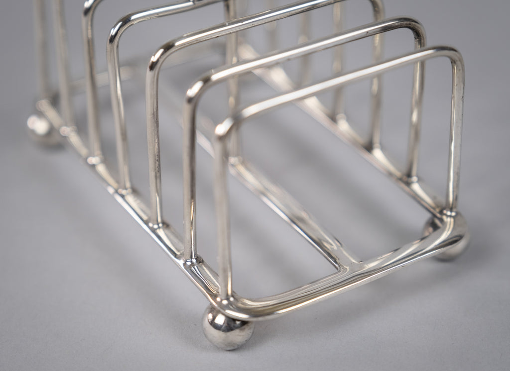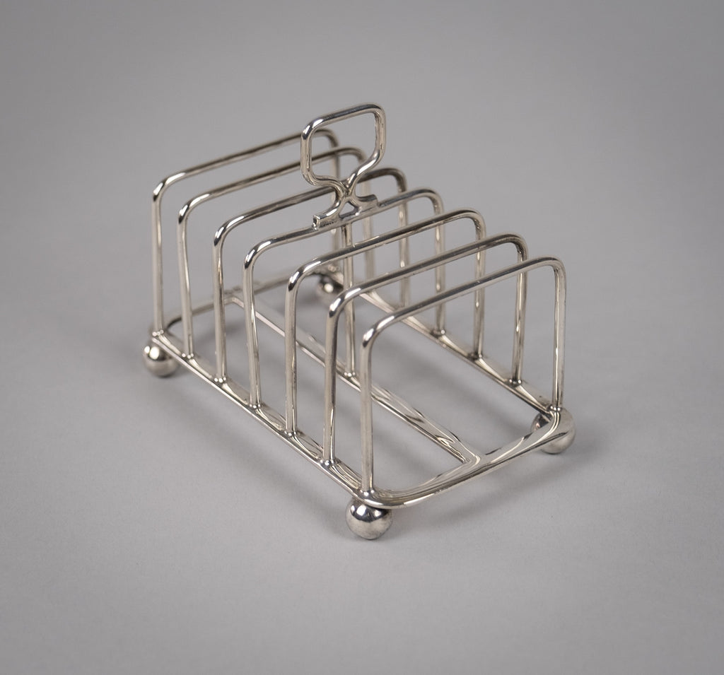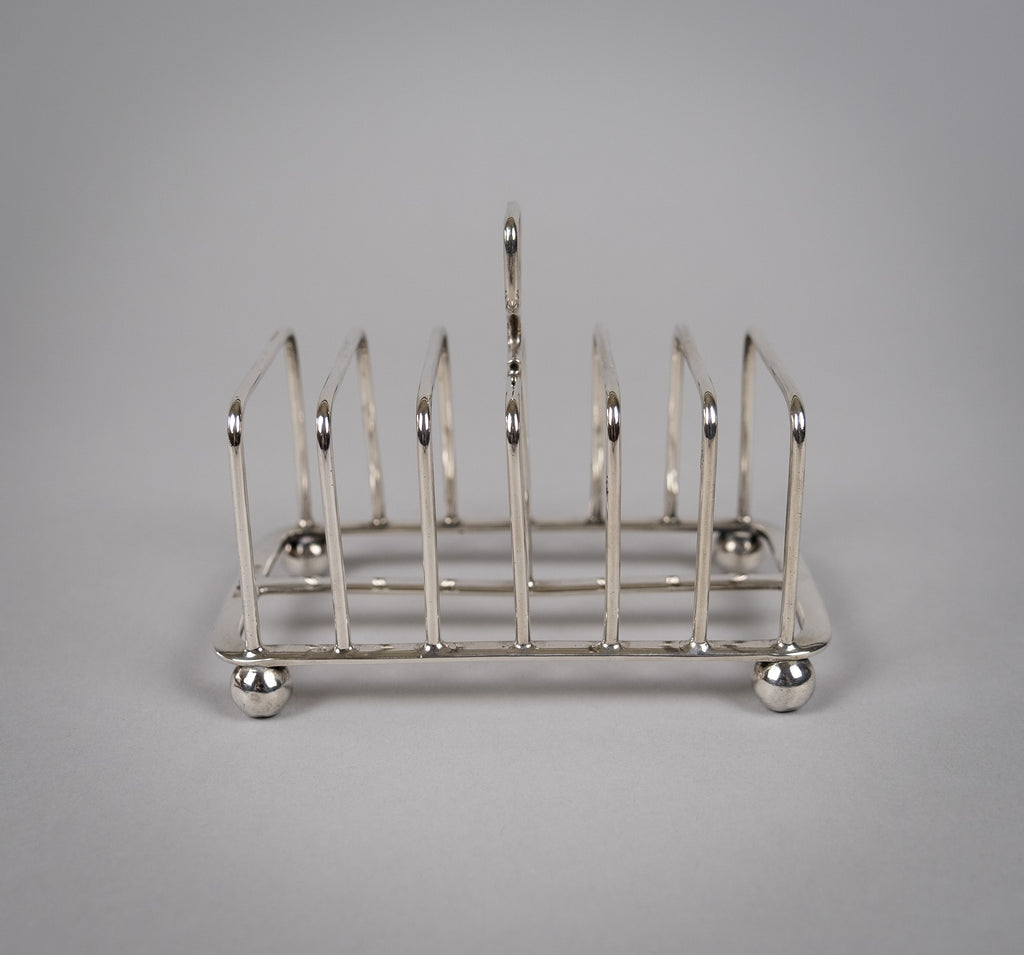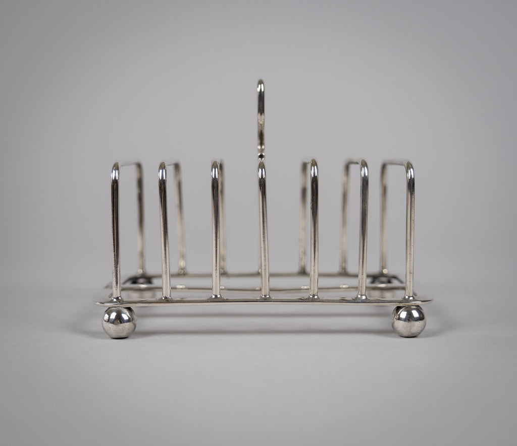 The toast rack is of a rounded square form with four ball feet, a central column and a rounded square handle.