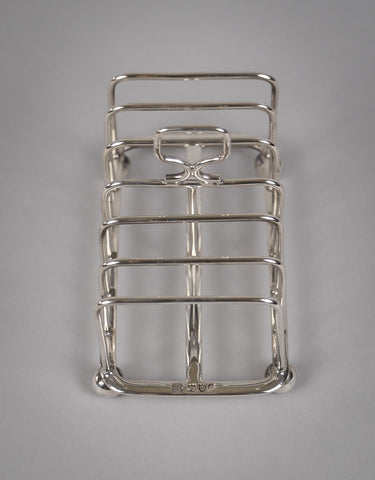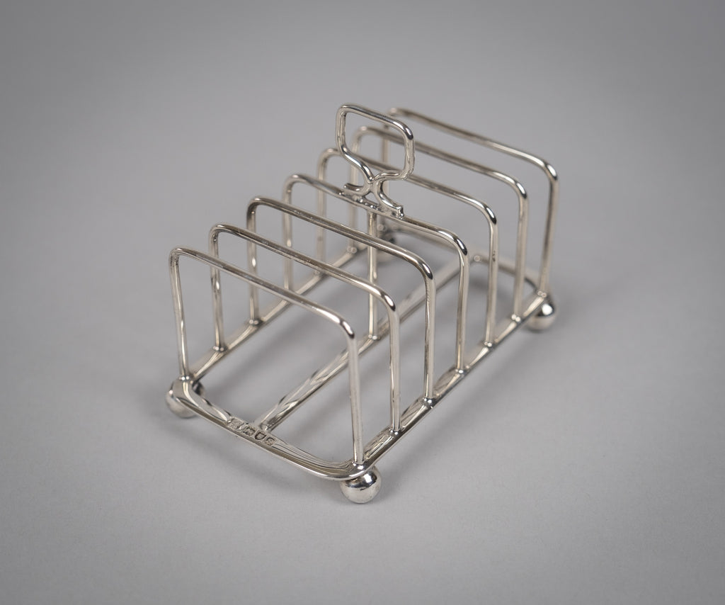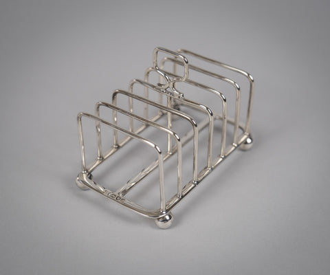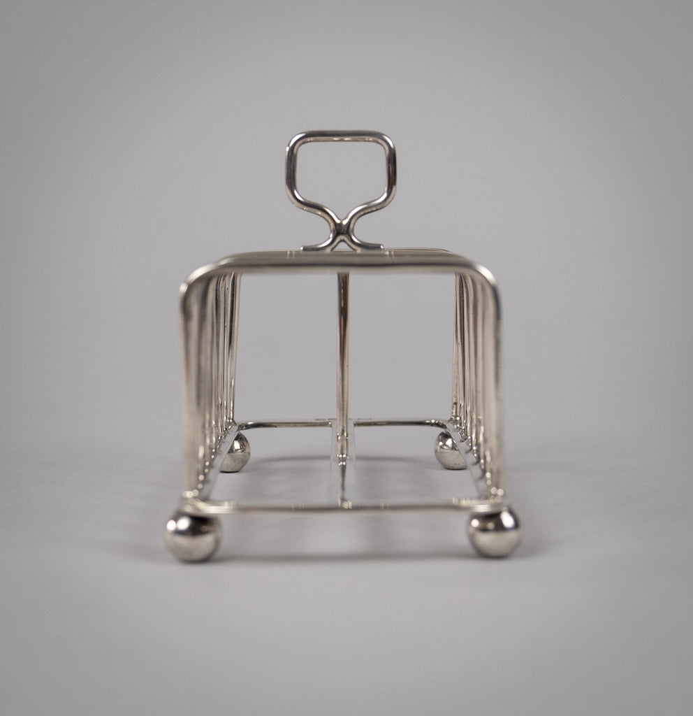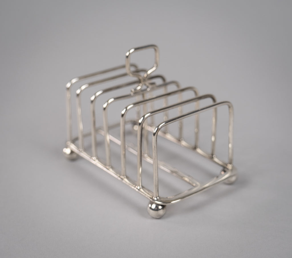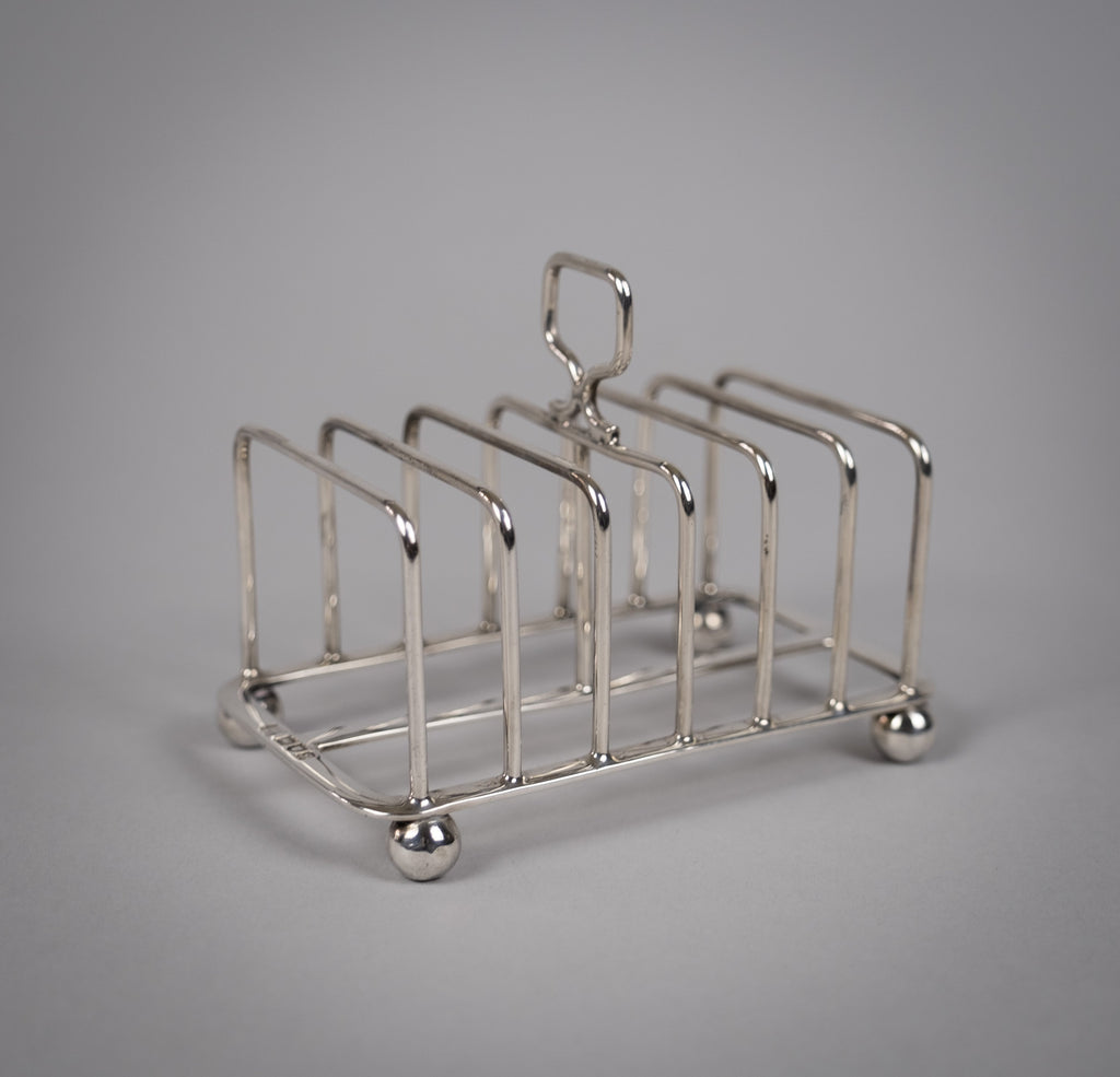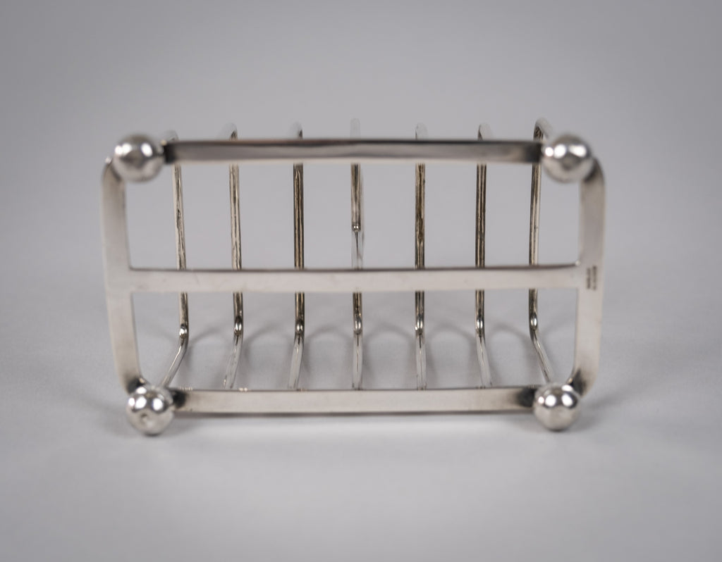 The toast rack is of a rounded square form with four ball feet, a central column and a rounded square handle.