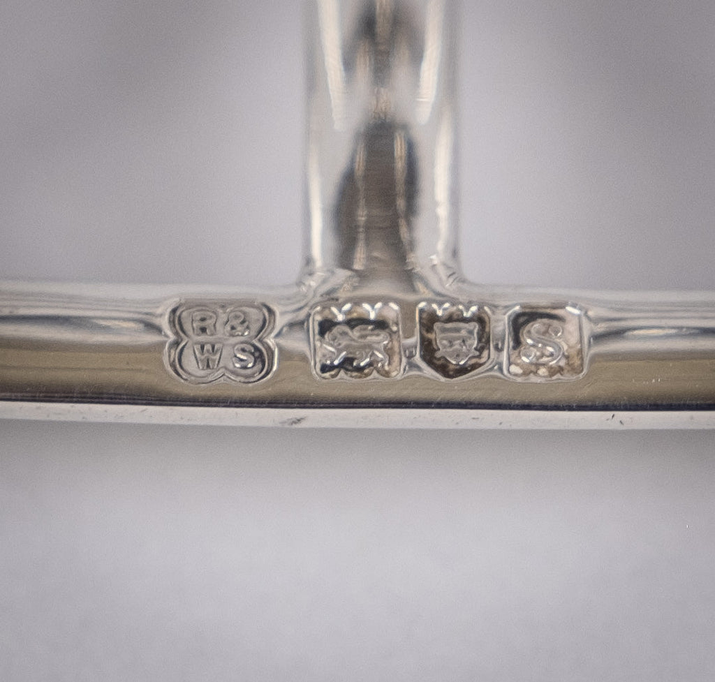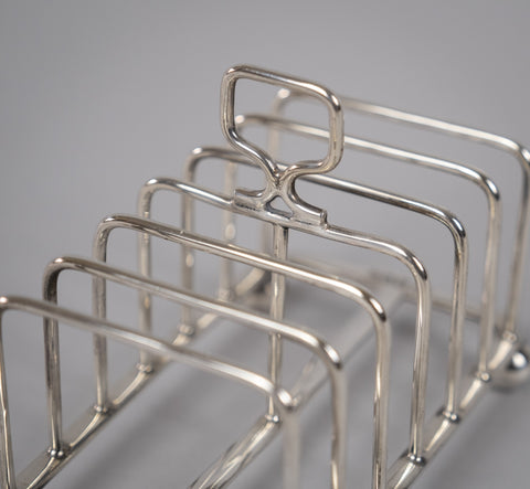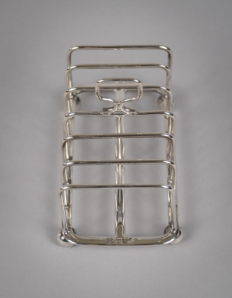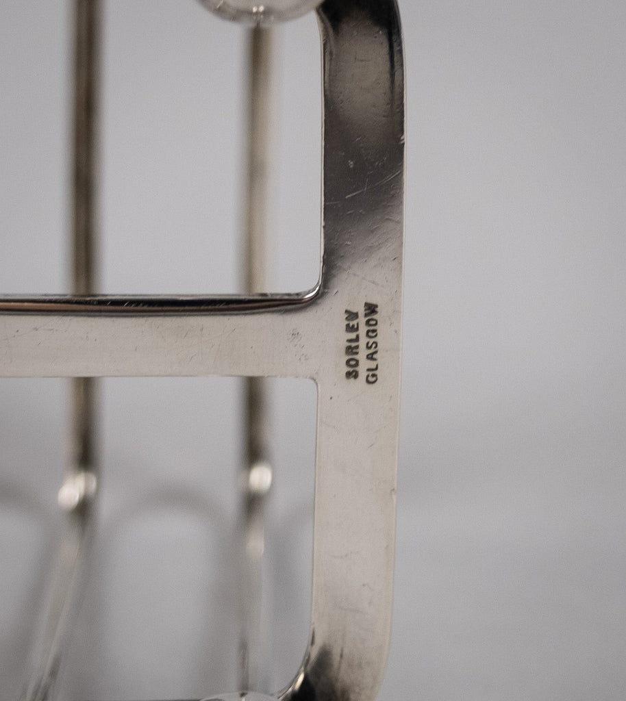 A very attractive and substantial Scottish sterling silver seven-bar toast rack, fully hallmarked for Robert & William Sorley, with London assay and date stamp for 1913. 'Sorley Glasgow' is stamped to the underside.