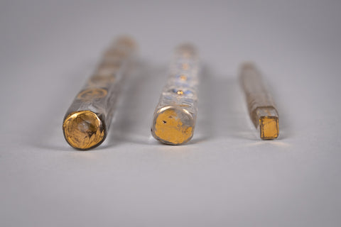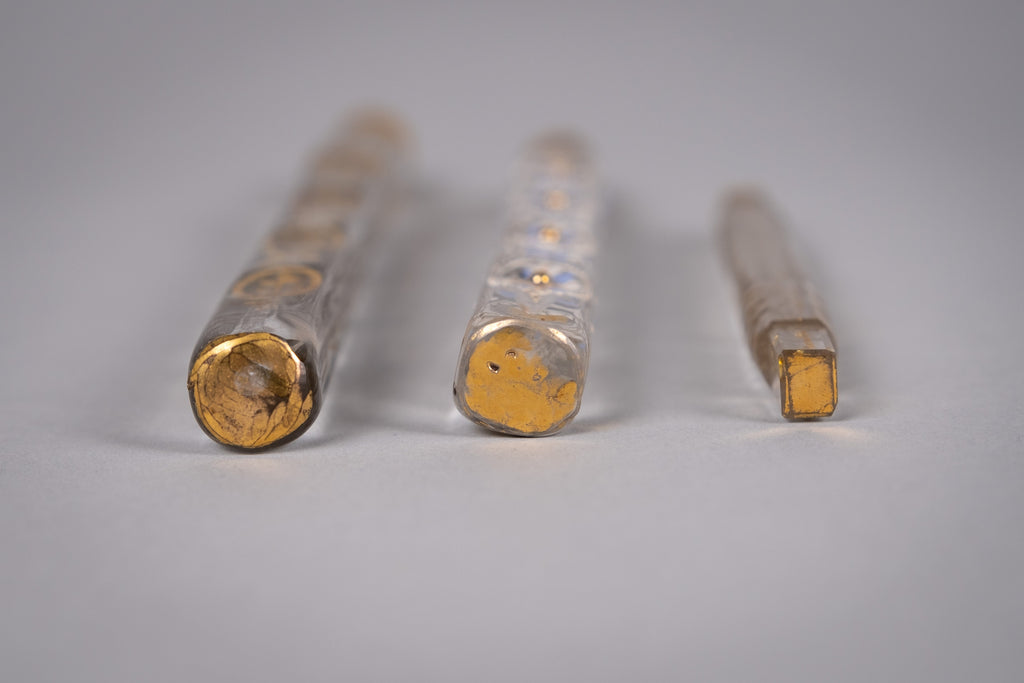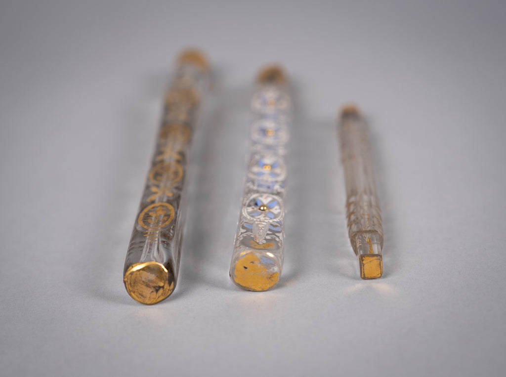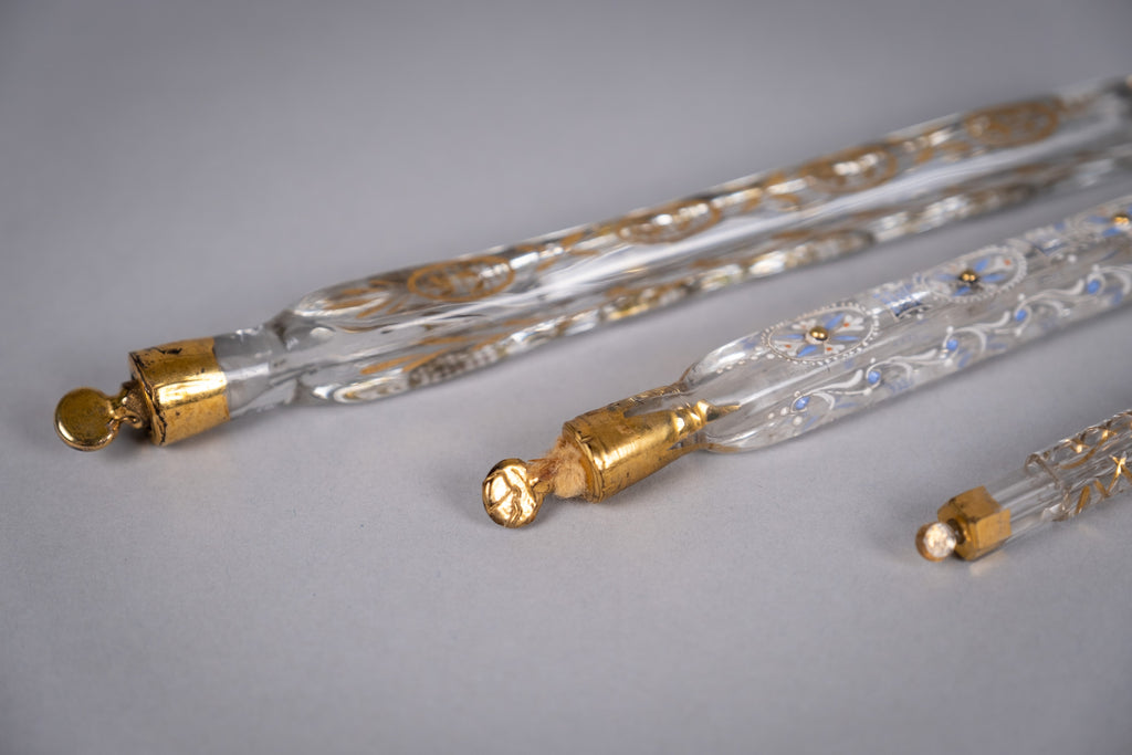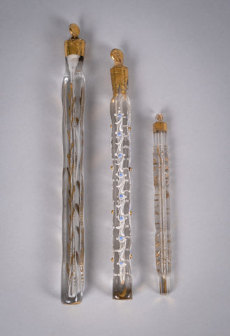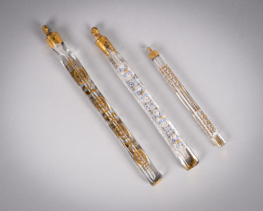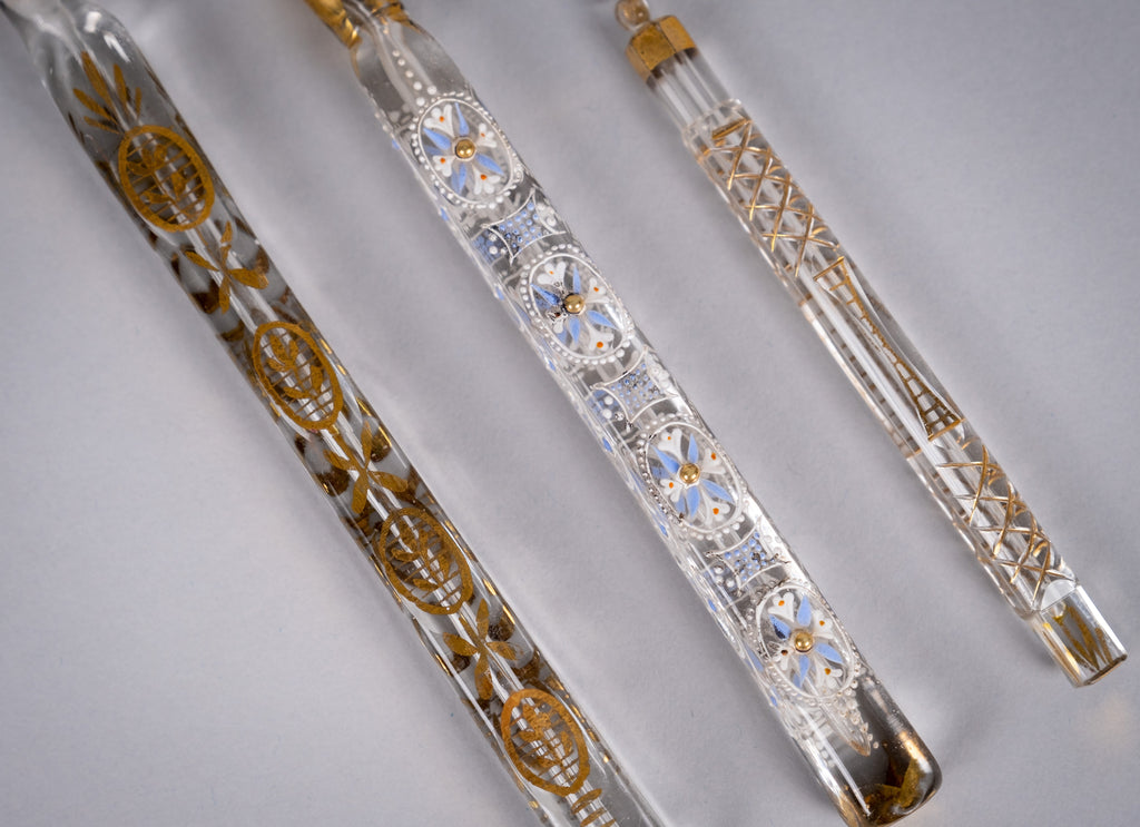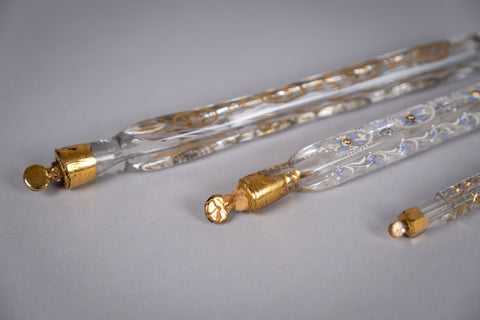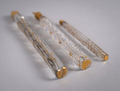 The largest bottle in the set has loosely painted gilt floral detail throughout. The second largest is the most ornate with delicately painted blue and white enamel floral decoration and raised gilt to the centre of the flowers. The smallest bottle has crisp gilt line decoration and a tapered base. Every bottle has gilt to the stopper, top and base.