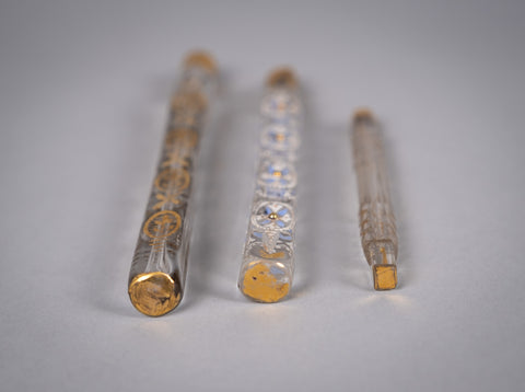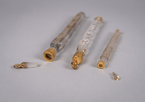 These delightful bottles originally held a small amount of perfume and were to be discarded after use, hence they are rather scarce items today.