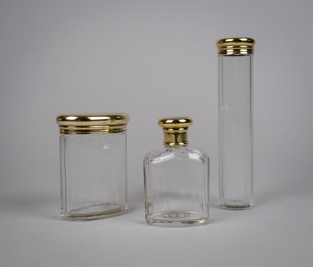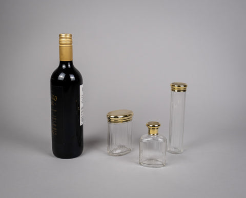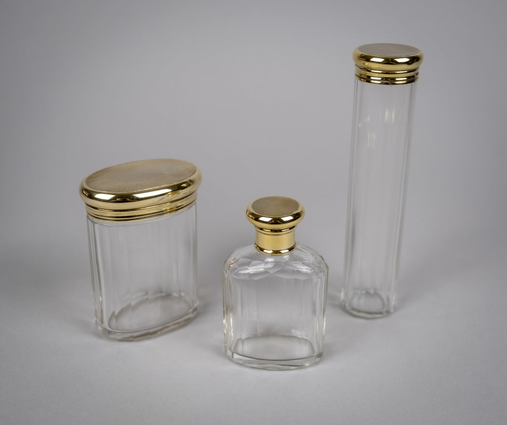 Each jar remains in a very good condition with only minor wear commensurate with age, namely a very small kink to the centre lid of the middle sized jar, a small dink to the scent bottle near the hallmarks and some small areas of rubbing to the silver gilt. The set remains in a wholly original condition, with the scent bottle still retaining the smell of a decadent perfume.