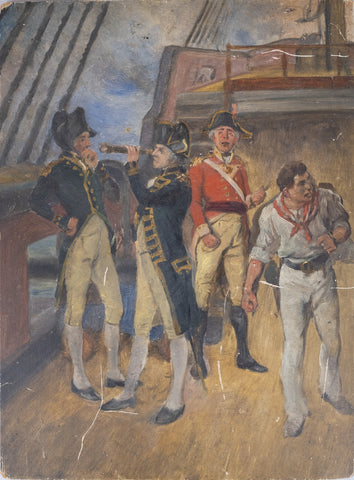 A charming oil on board titled 'Sketch - Nelson At Copenhagen', depicting Lord Horatio Nelson at the Battle of Copenhagen, placing a telescope to his blind eye, or 'turning a blind eye' to the signal to disengage on 2nd April 1801.