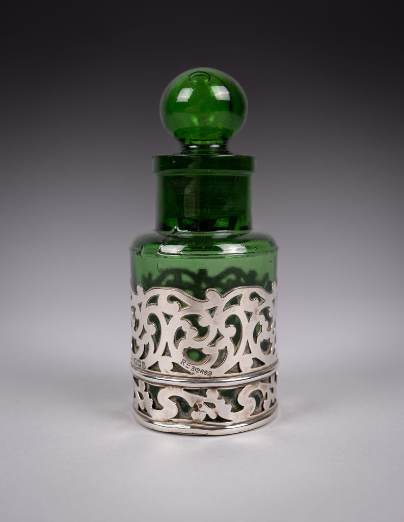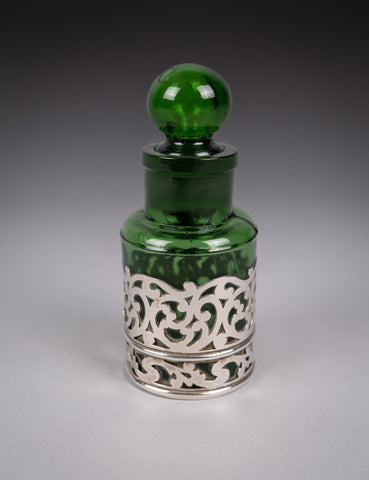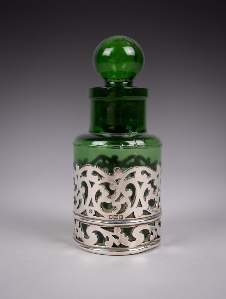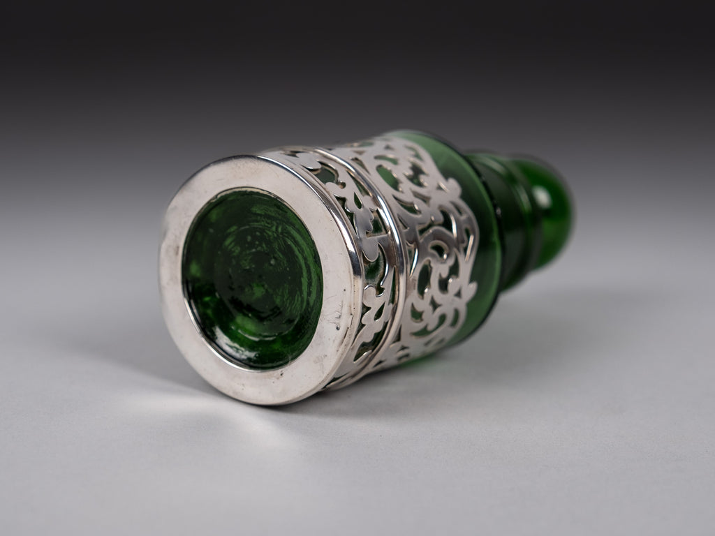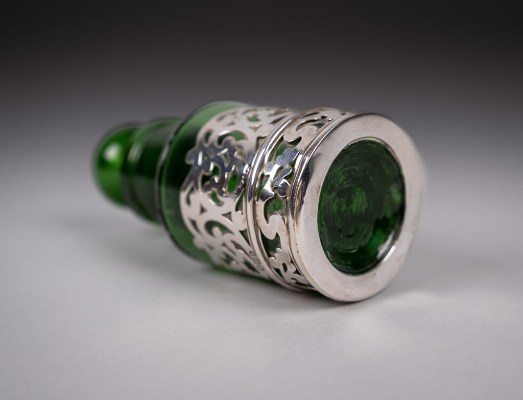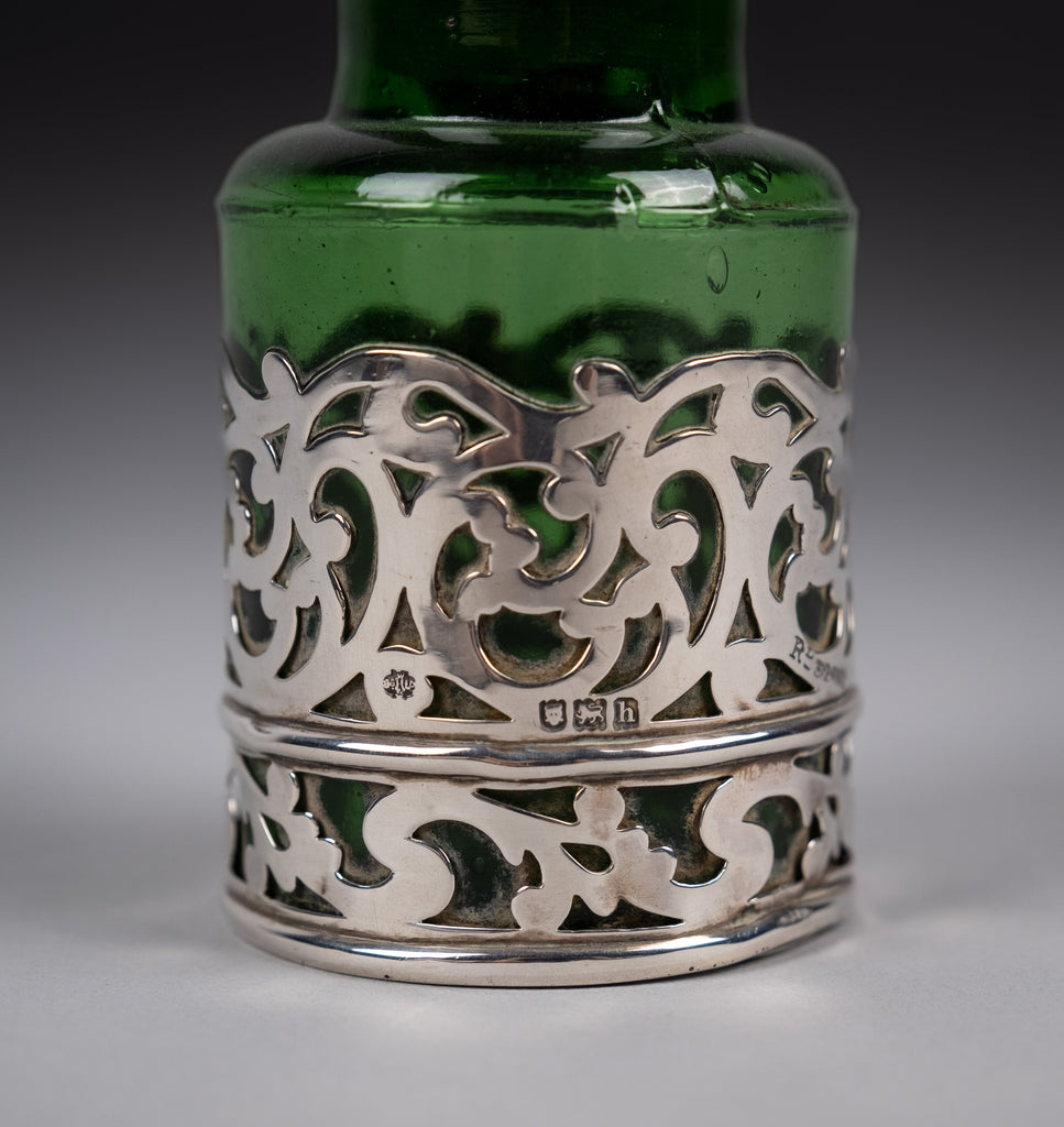 Sterling Silver Emerald Green Glass Scent Bottle by William Hutton & Sons, 1903