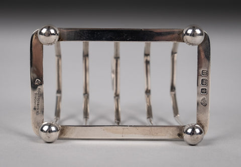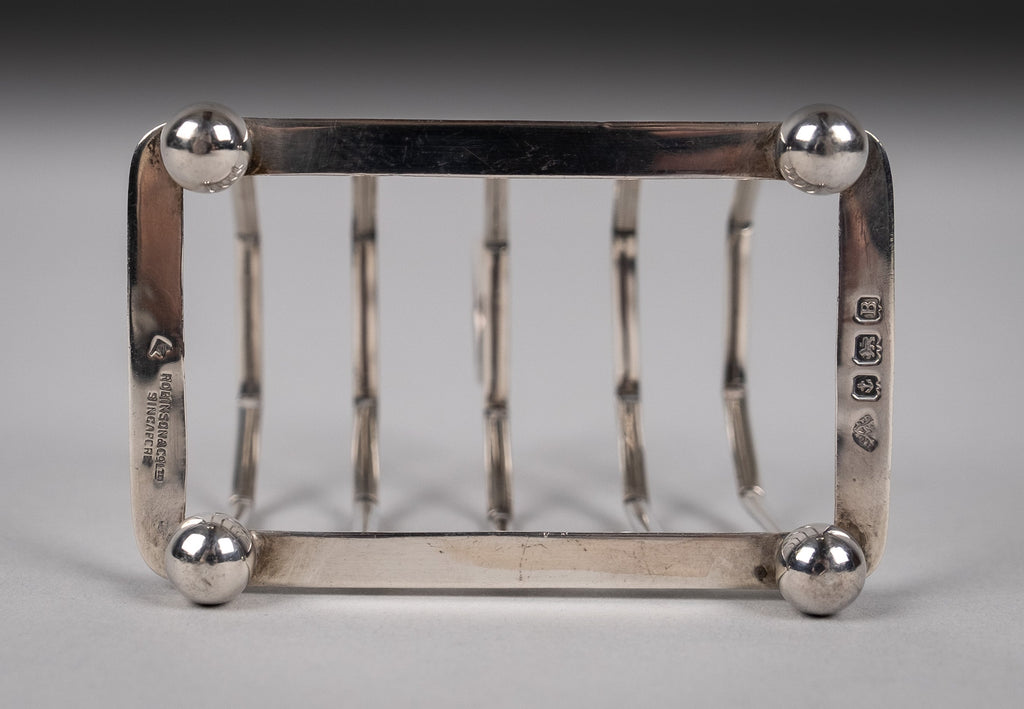 A charming little sterling silver five-bar toast rack, fully hallmarked for Adie Brothers Ltd, Birmingham, 1926. Retailer stamp for 'Robinson & Co, Singapore'.
