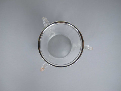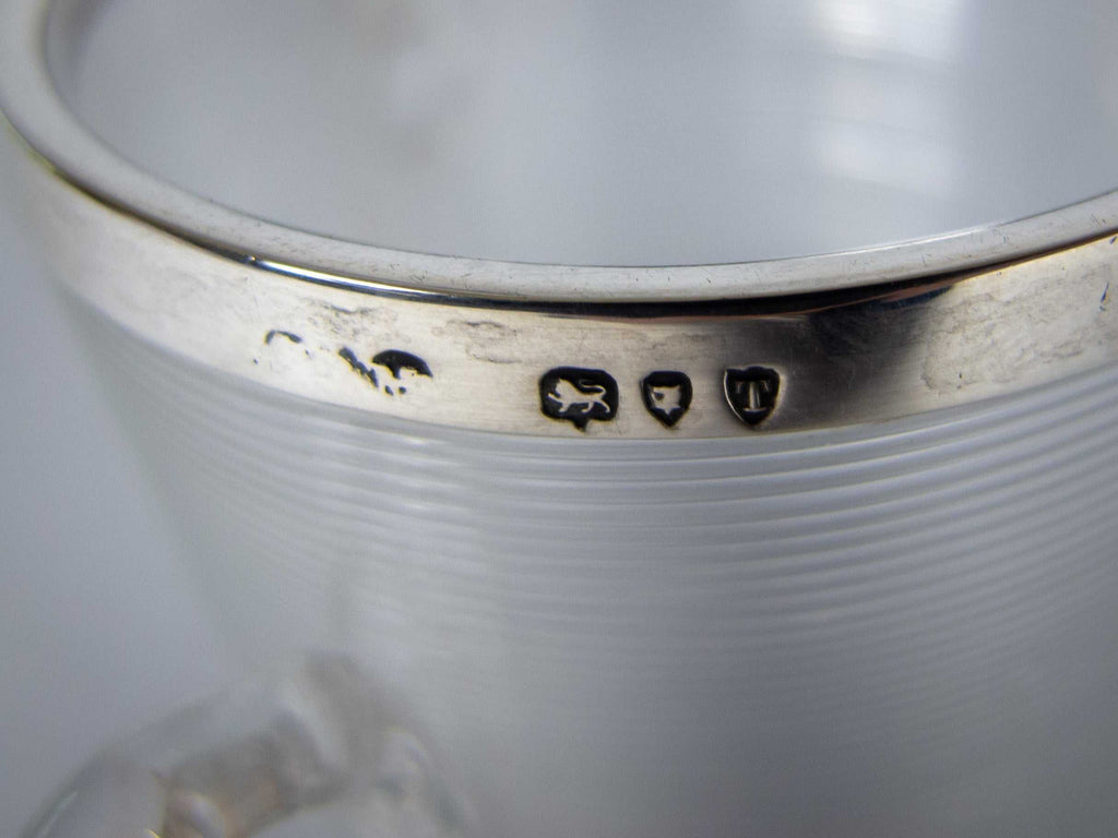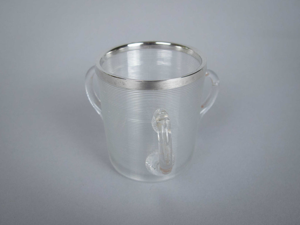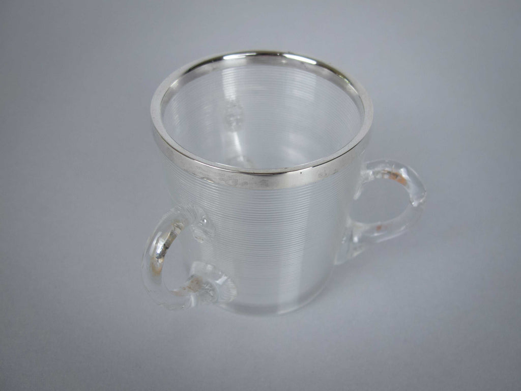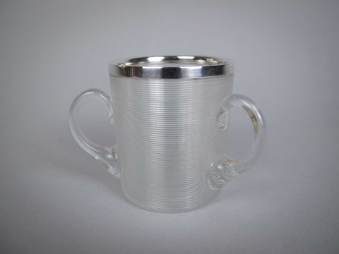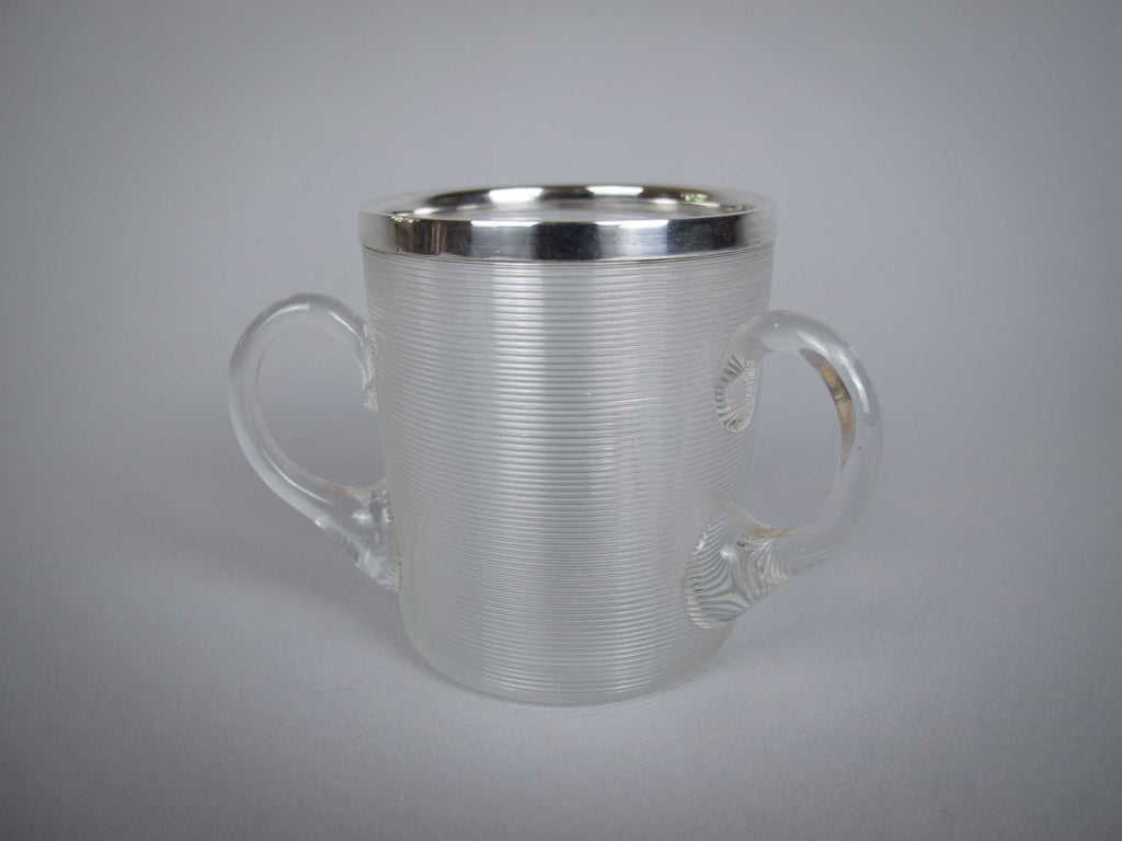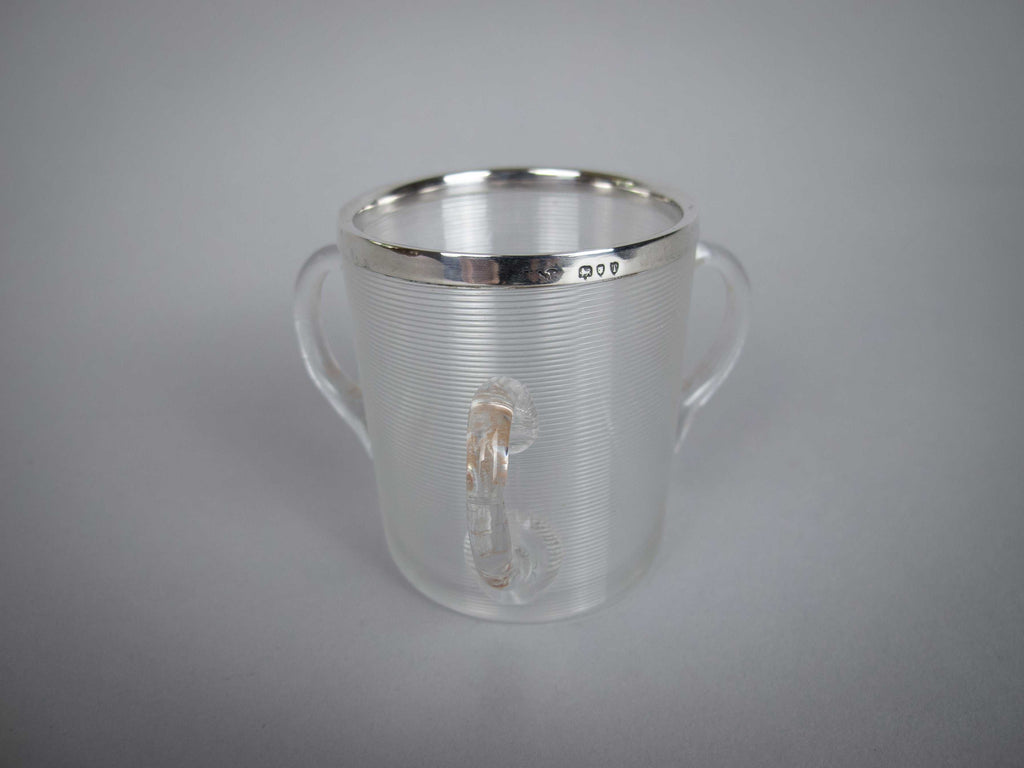 A silver mounted clear glass match striker of tyg form, hallmarked for London, 1894. The maker's mark is rubbed with only the latter letter remaining visible - an 'M' within a circle.