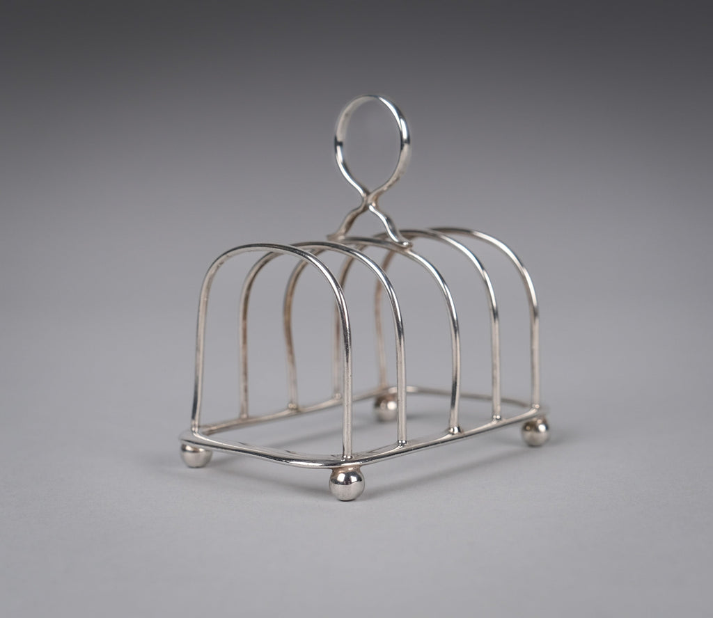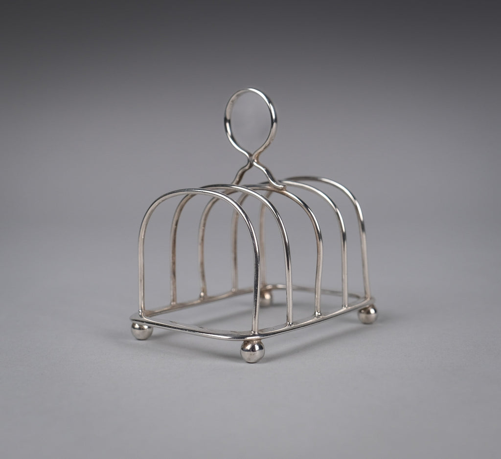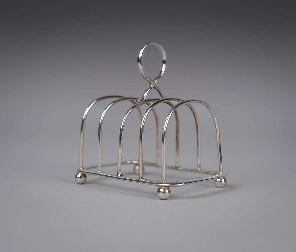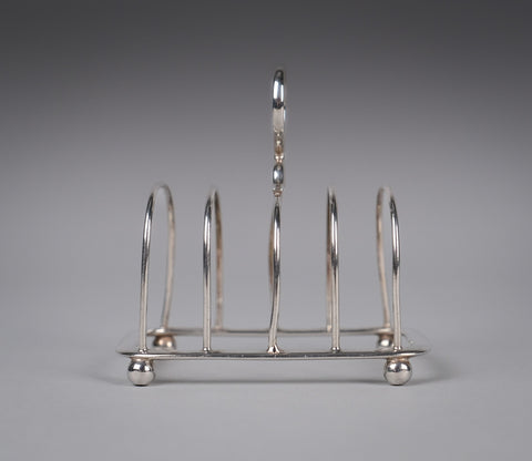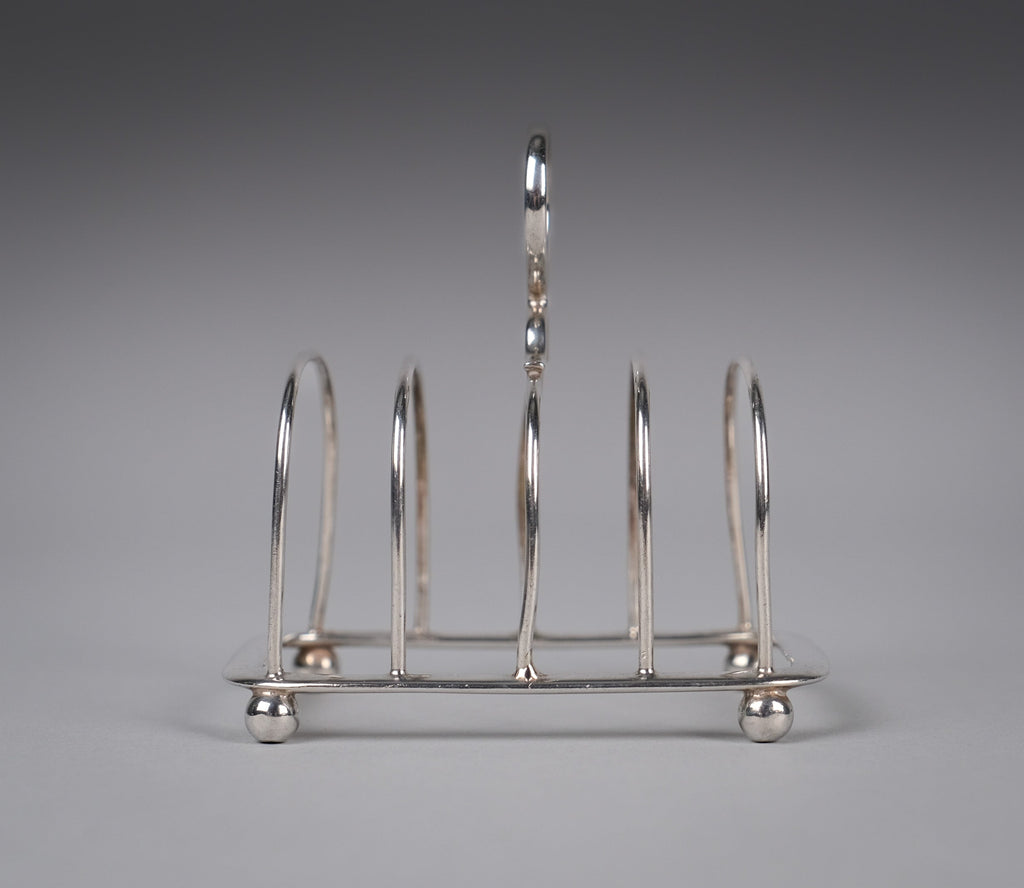 This small elegant toast rack has five bars, a loop handle, rounded corners and four ball feet. There is some light wear commensurate with age, most notably a small warp to one edge of the central bar (please see photographs).