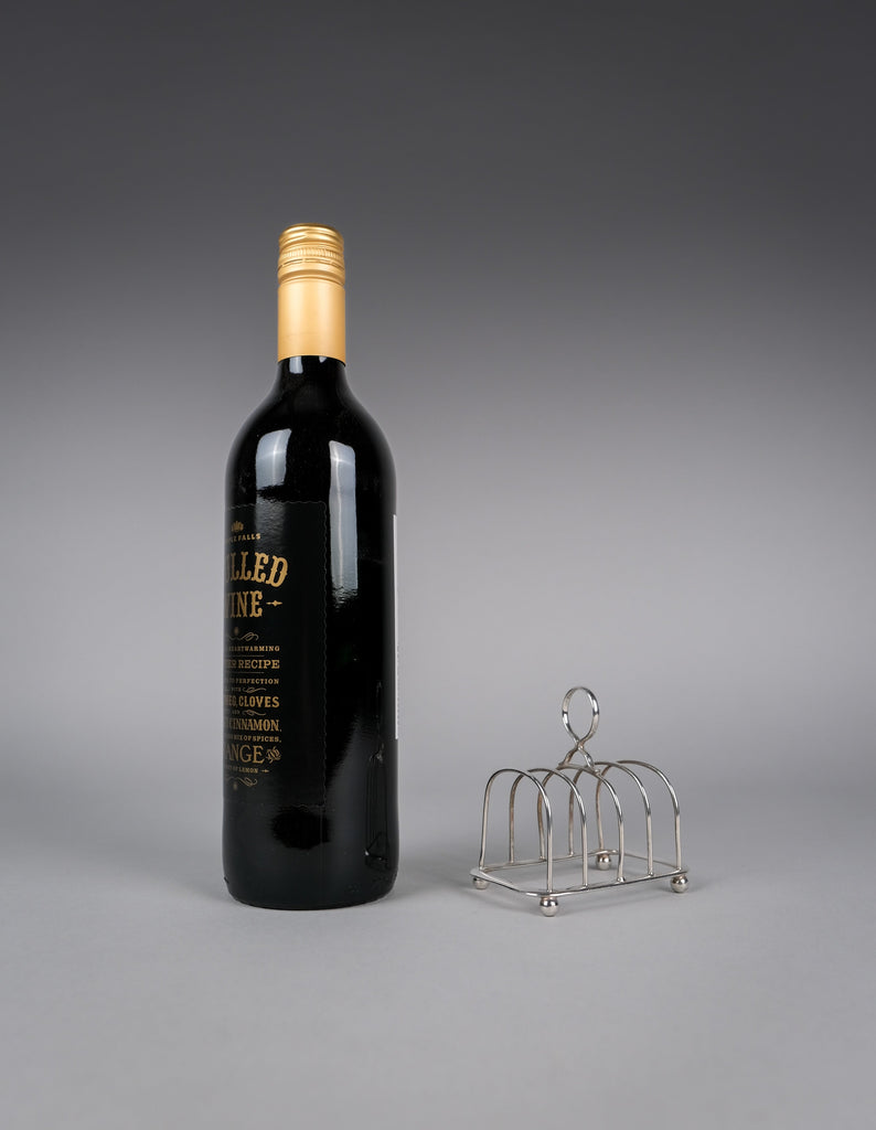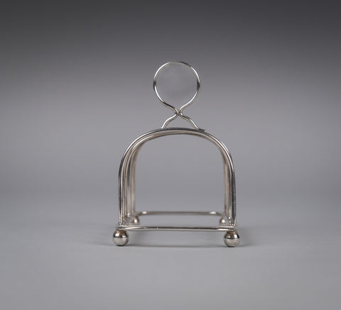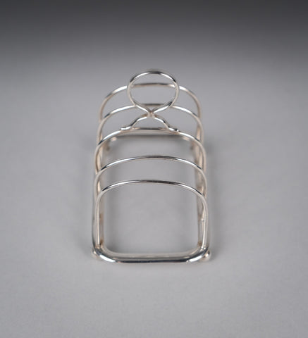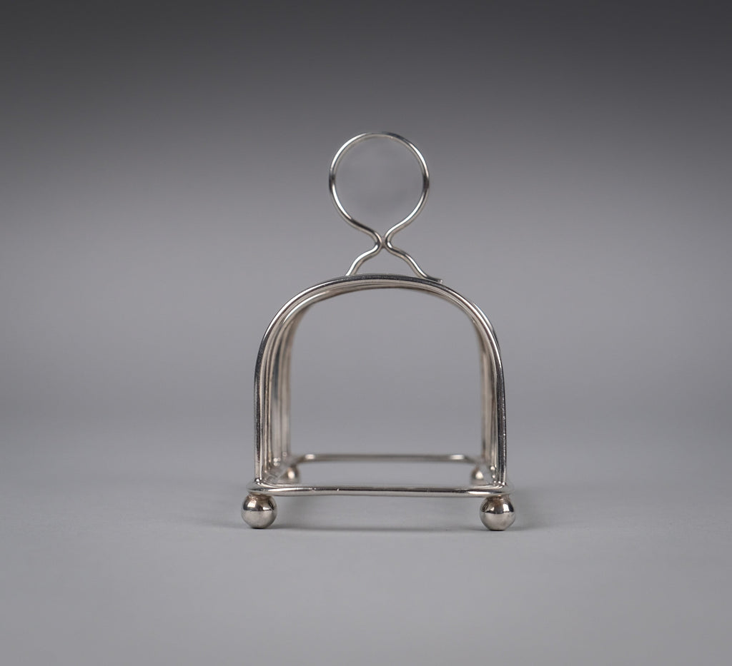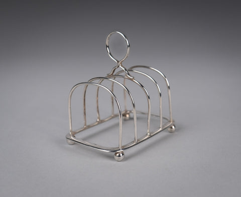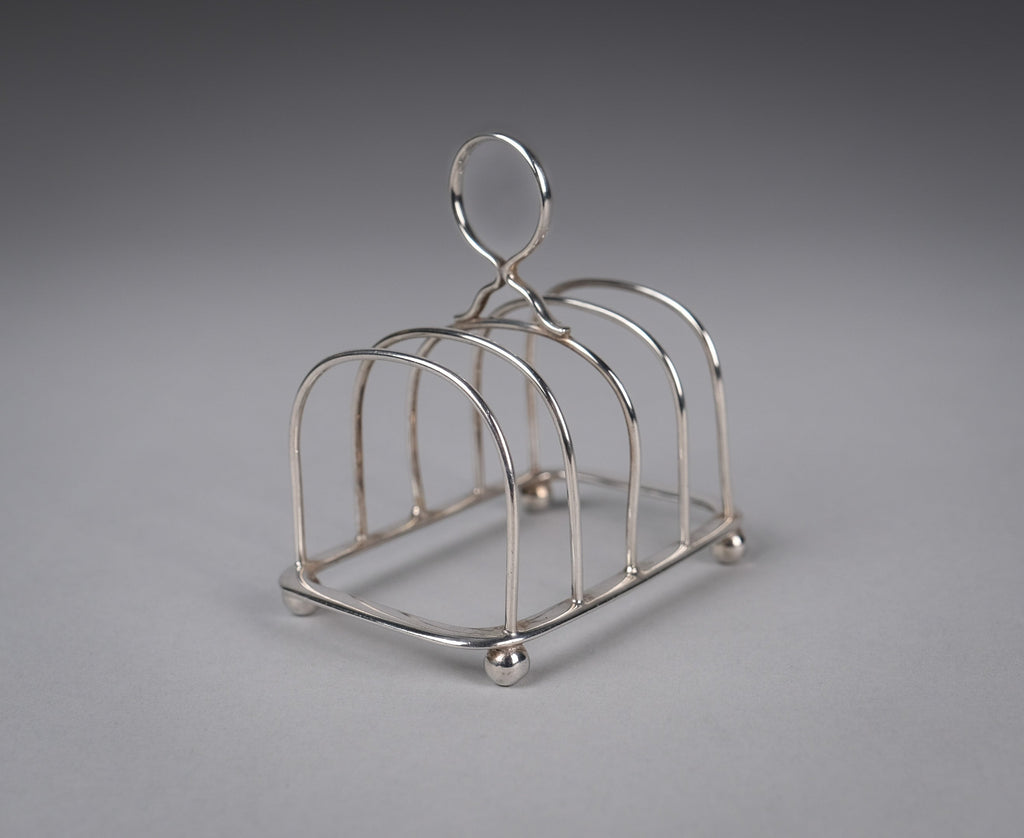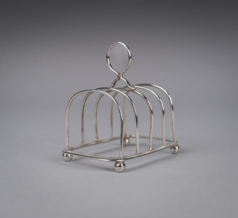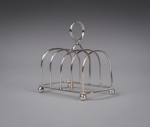 This small elegant toast rack has five bars, a loop handle, rounded corners and four ball feet. There is some light wear commensurate with age, most notably a small warp to one edge of the central bar (please see photographs).