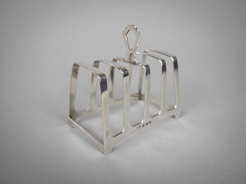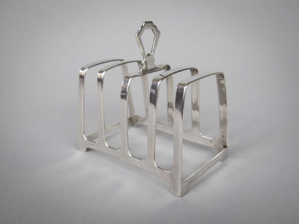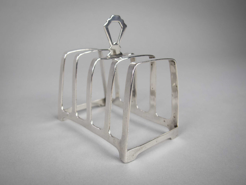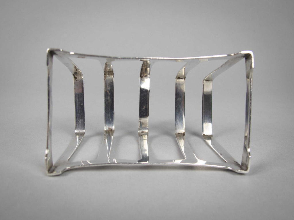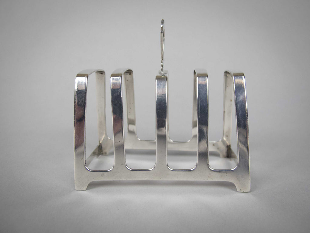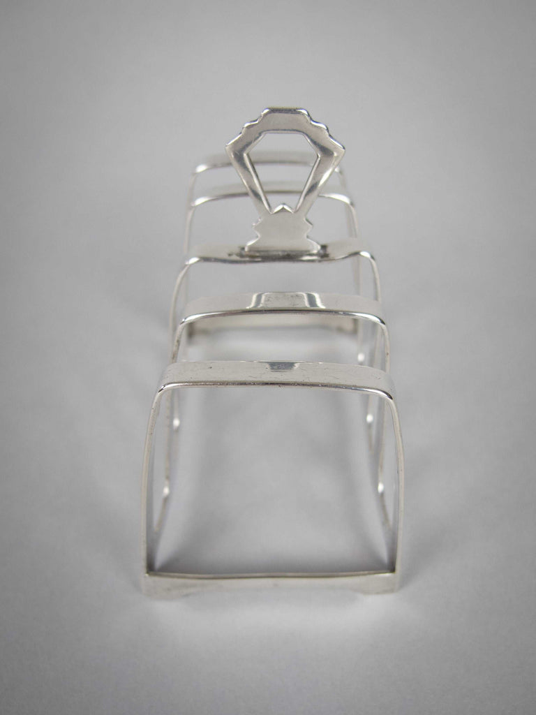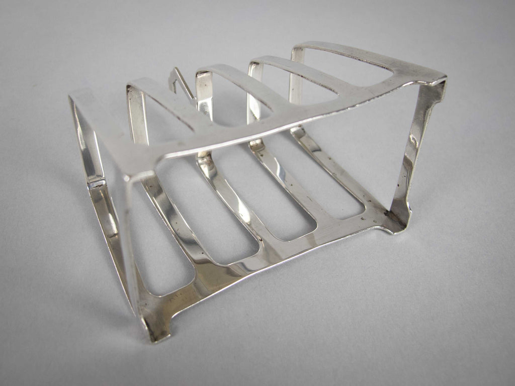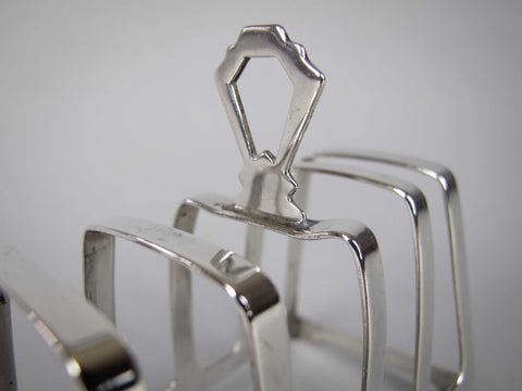 The toast rack is of concave form, the outside supporting bars dipping in to the centre and flaring out to each end. There is a small dent to the handle bar, directly under the handle (please see photographs) and some small spots of tarnish to the underside. The toast rack remains remains fully functional and attractive.