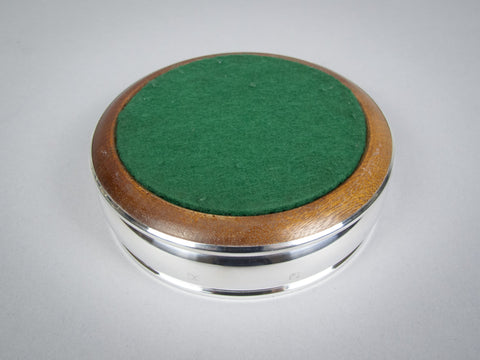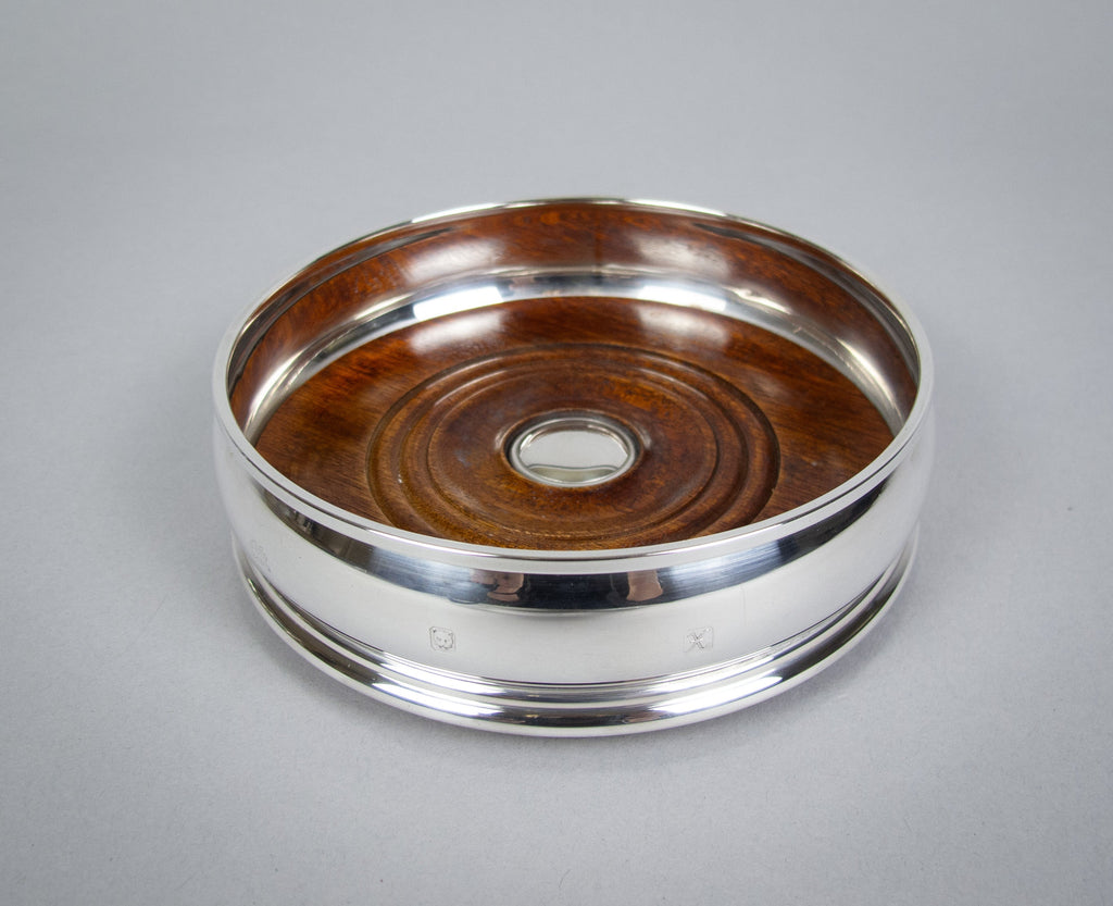The coaster has a curved edge, warm wooden base and a central sterling silver 'button' surrounded by turned wood detail. The base is lined with green baize.