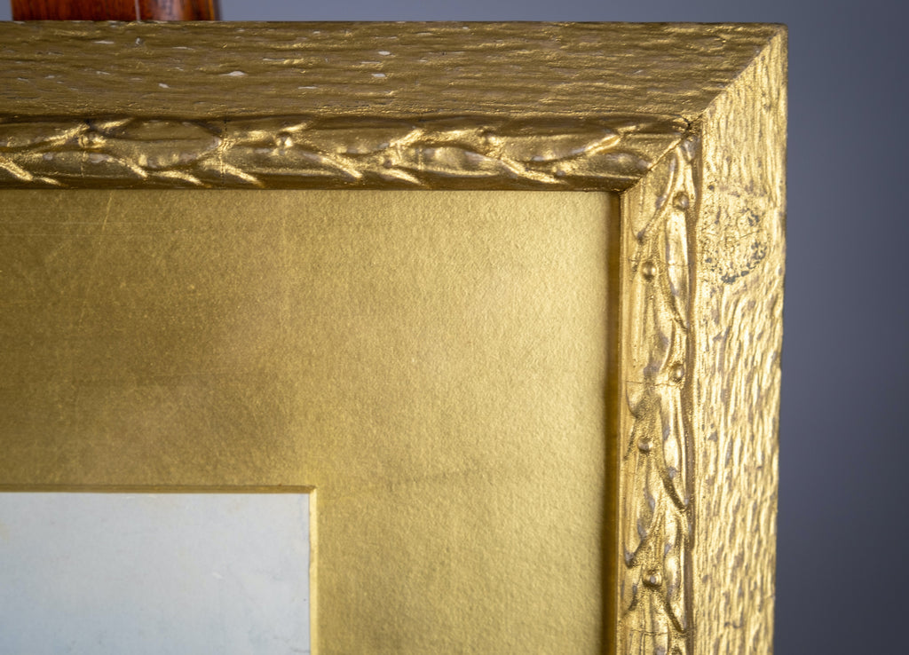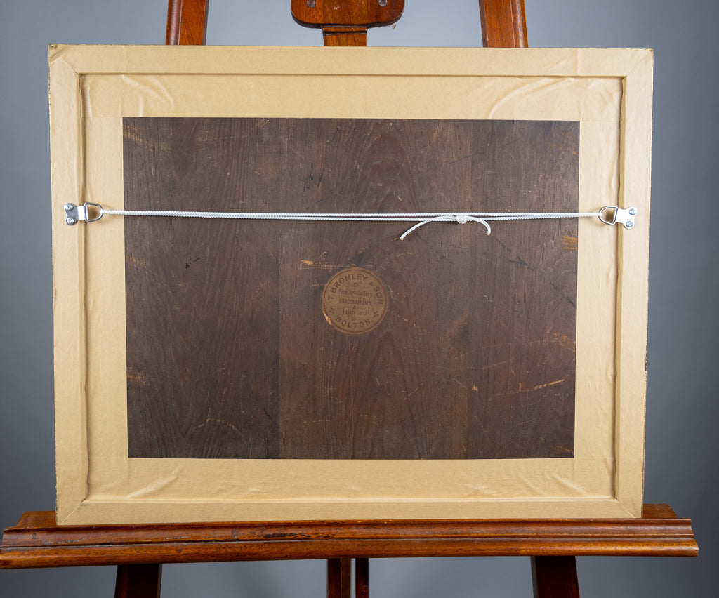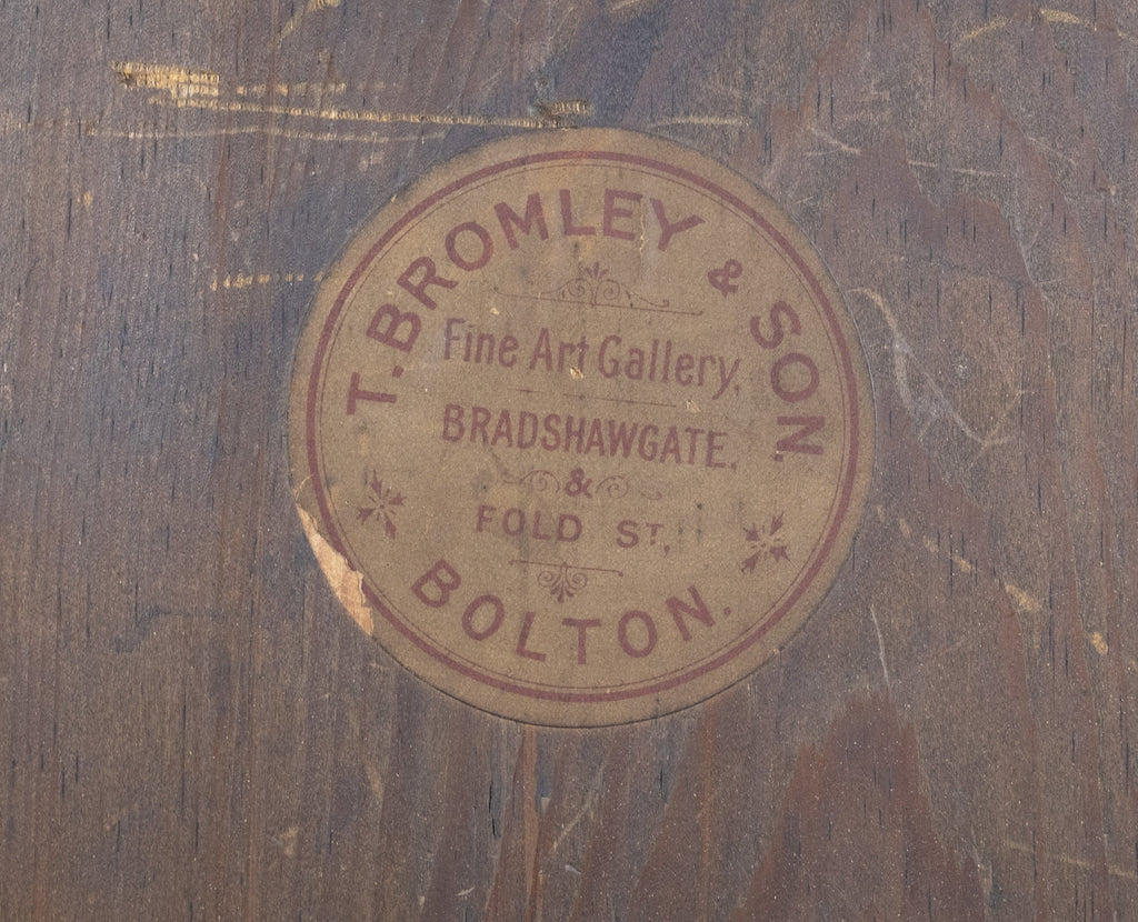 The work is housed in a period frame which has been overpainted gilt. The original backboard remains verso with a sticker for fine art gallery T. Bromley & Son, Bolton.