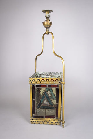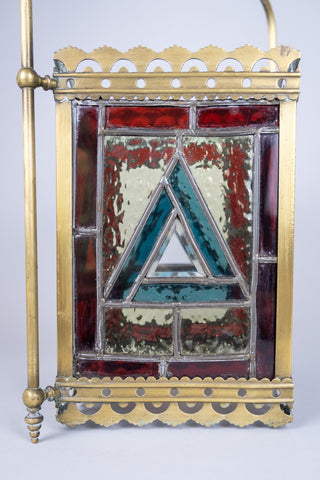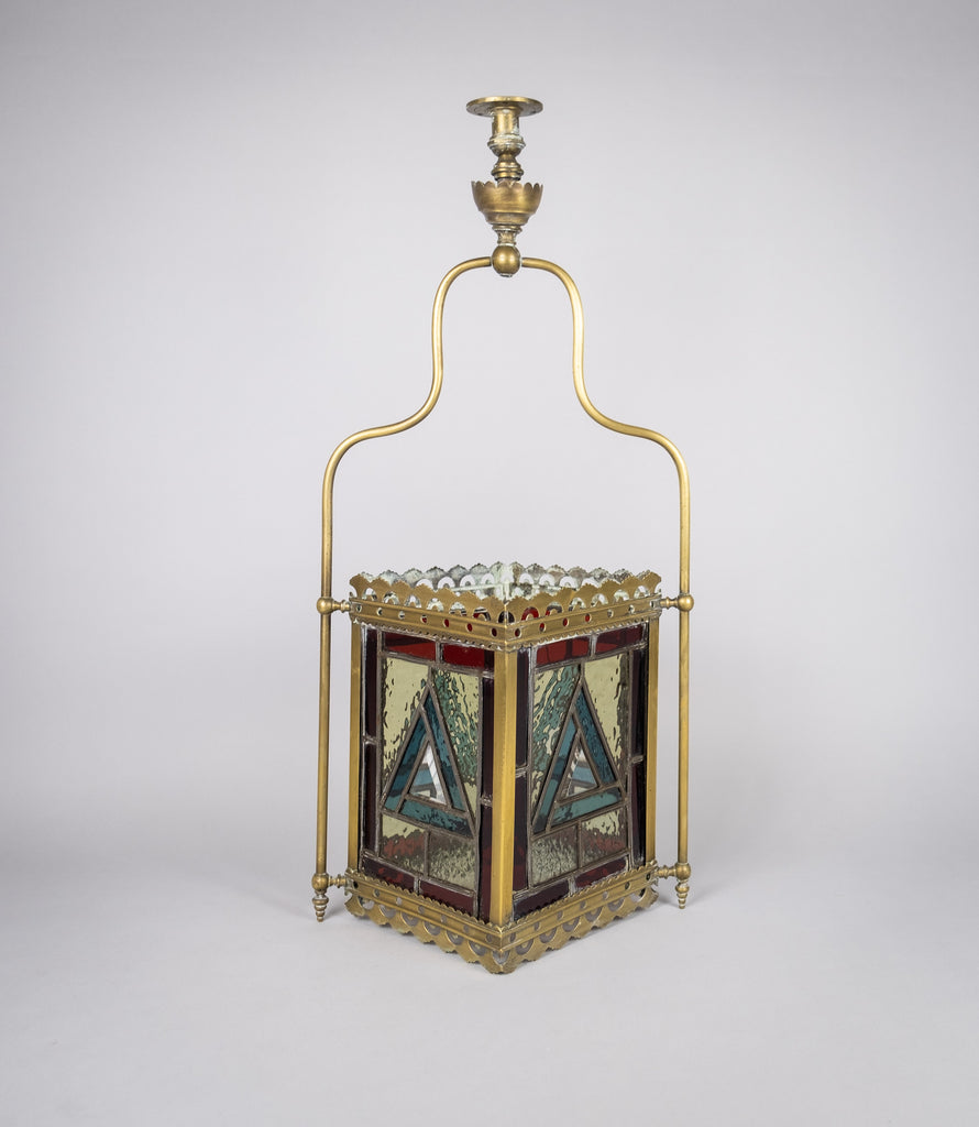 A very attractive Victorian brass and leaded stained glass hall lantern, c.1890.