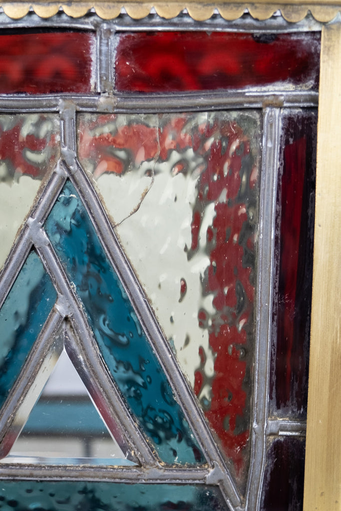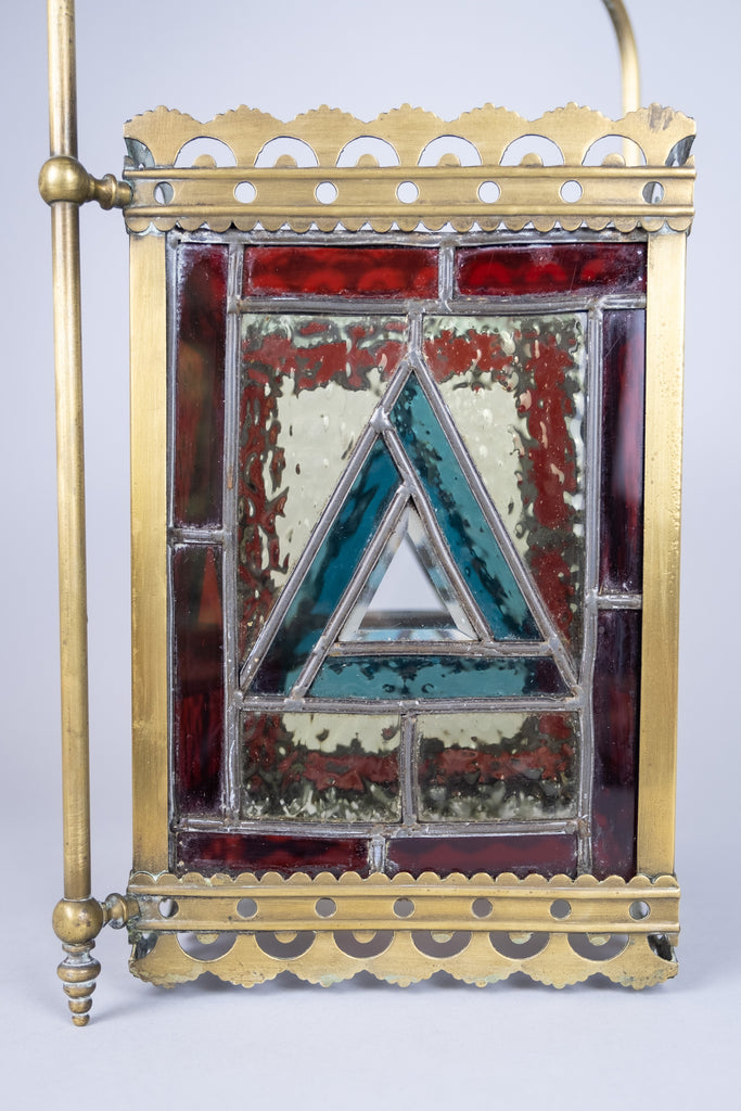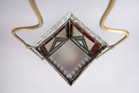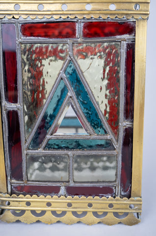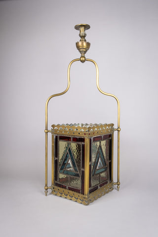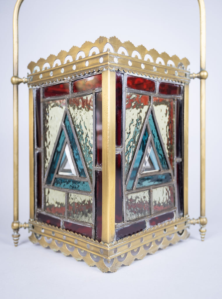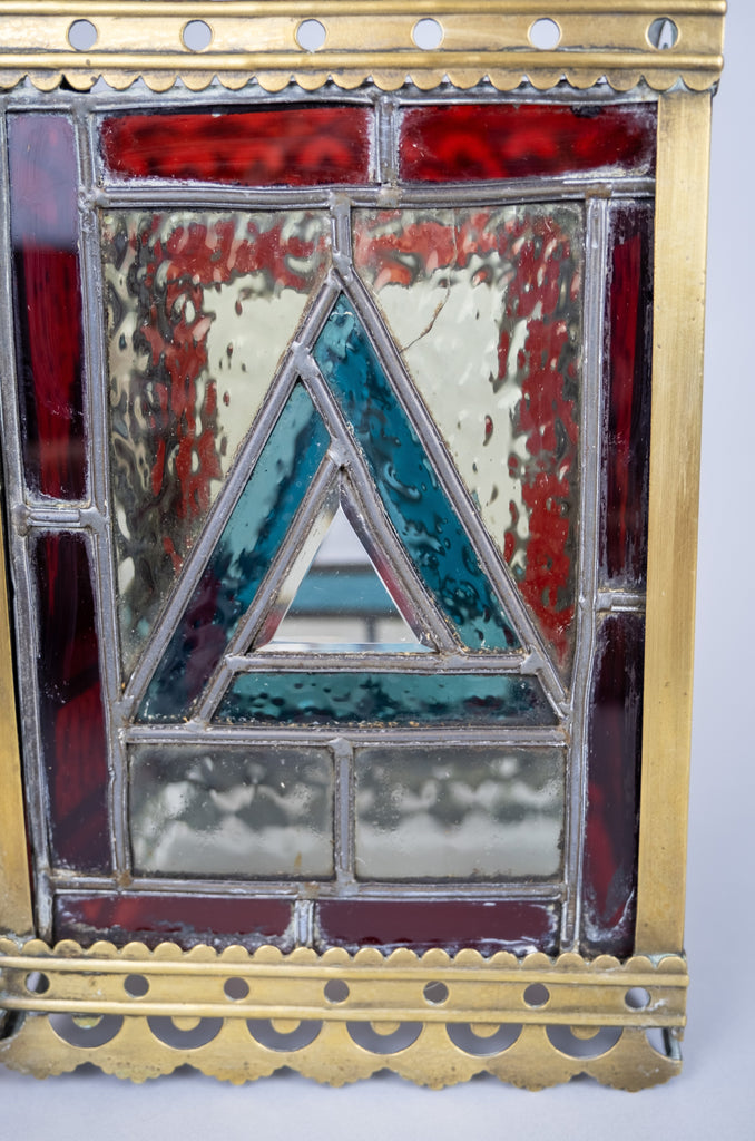 The lantern is four-sided with all sides boasting an identical stained glass design. The glass is wonderfully original with with visible bubbles and waves throughout. One of the clear panels to one side has a small crack (please see photographs) but this is not particularly obvious from a distance and does not detract from the piece. All other panels of glass remain in an excellent condition.