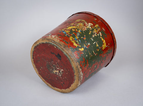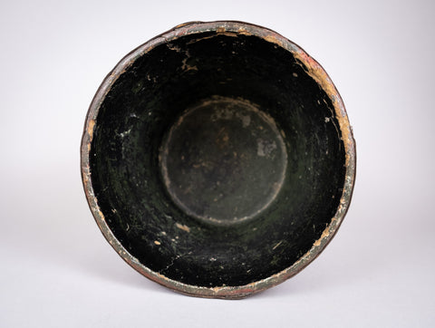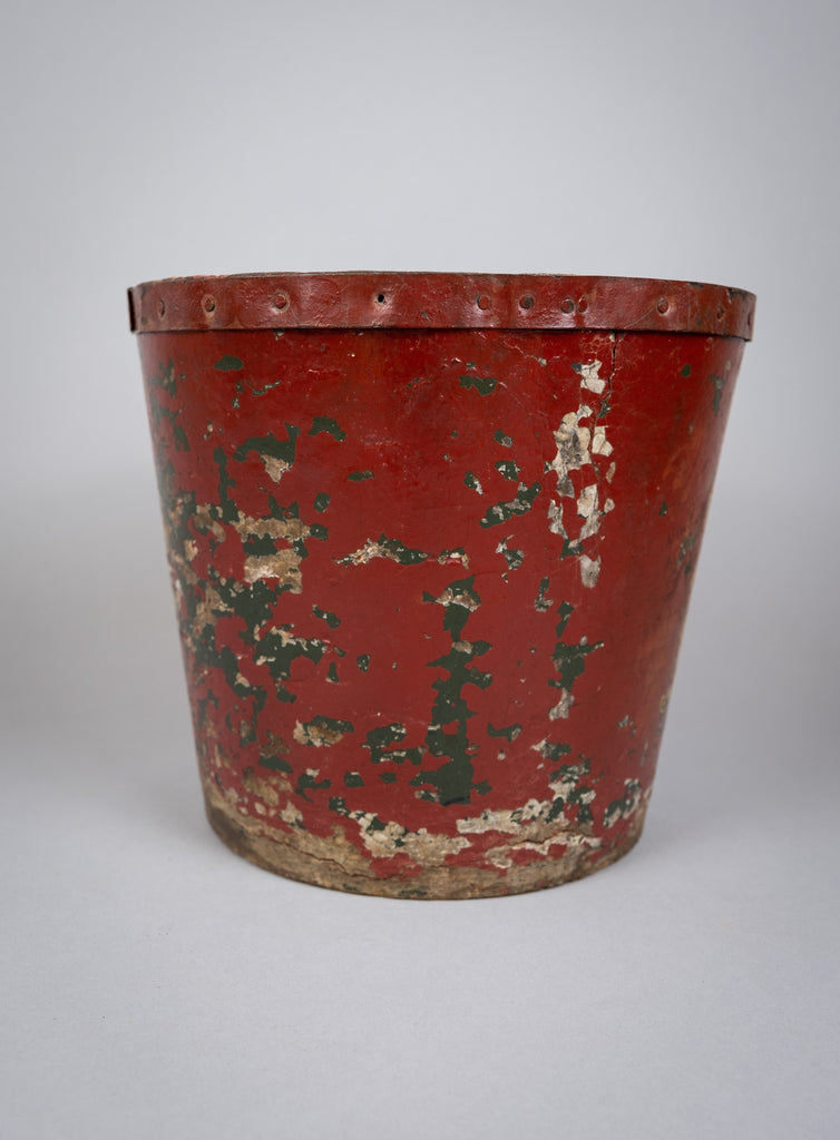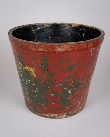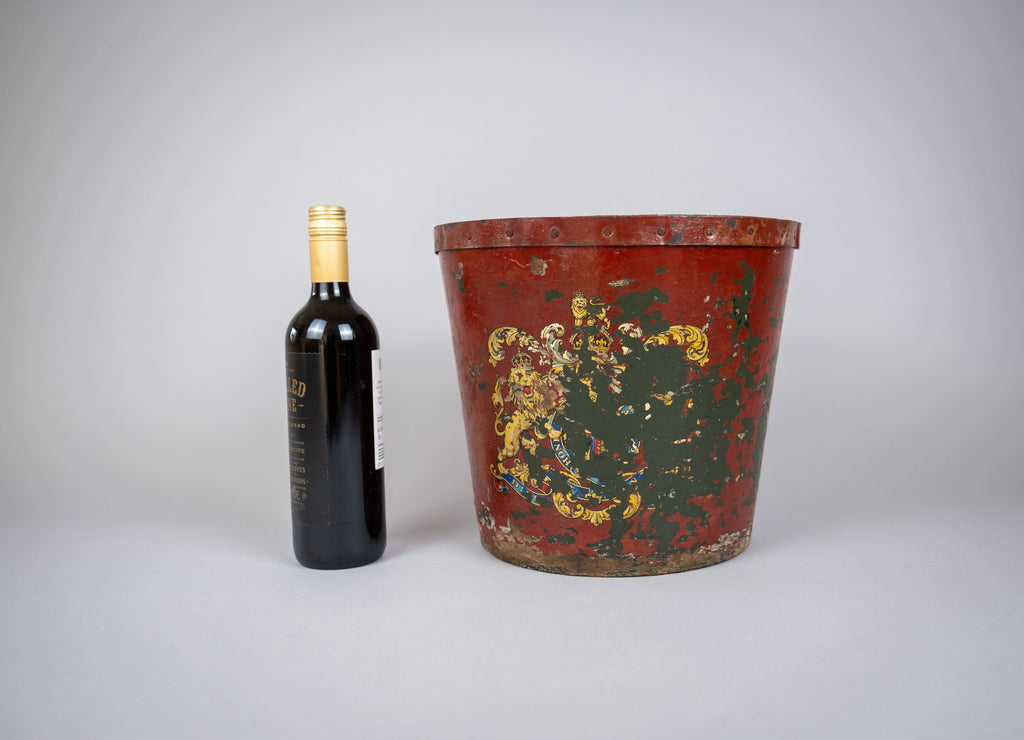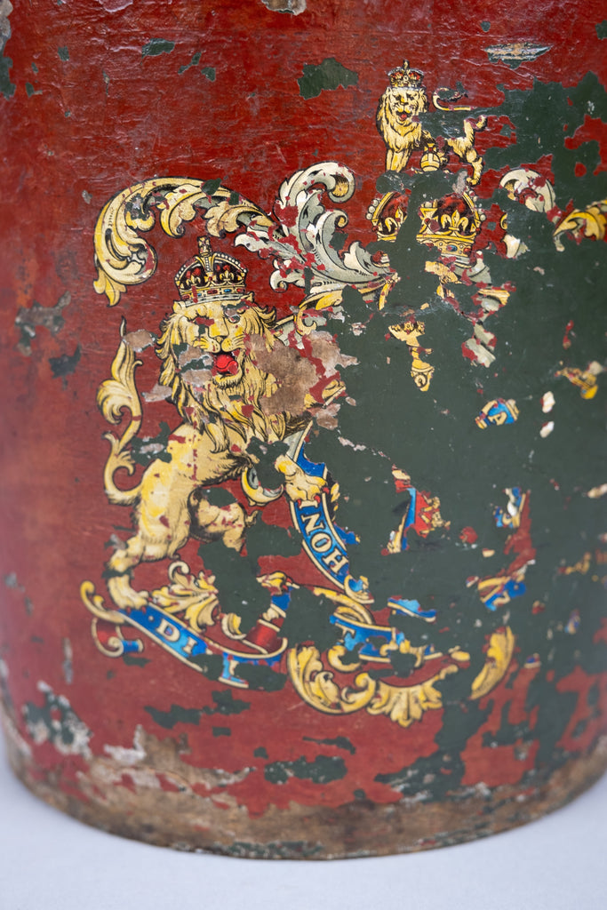 The bucket has a wonderful patina throughout, tactile and worn with dark green under paint poking through the the red Royal Arms top layer. The interior of the bucket retains its original black paint and the top its iron band.