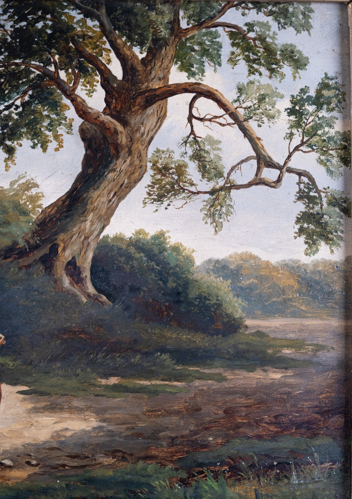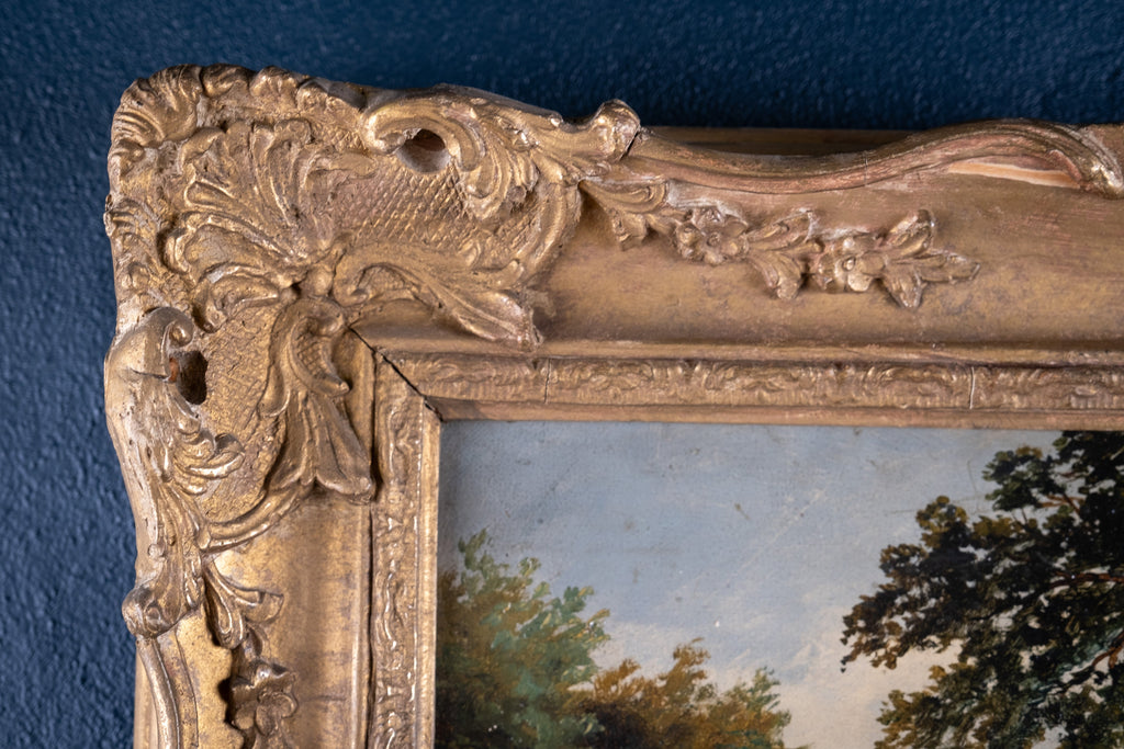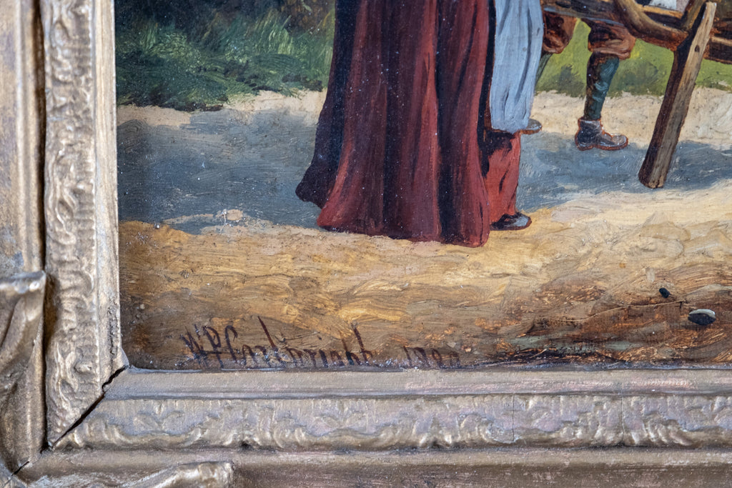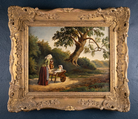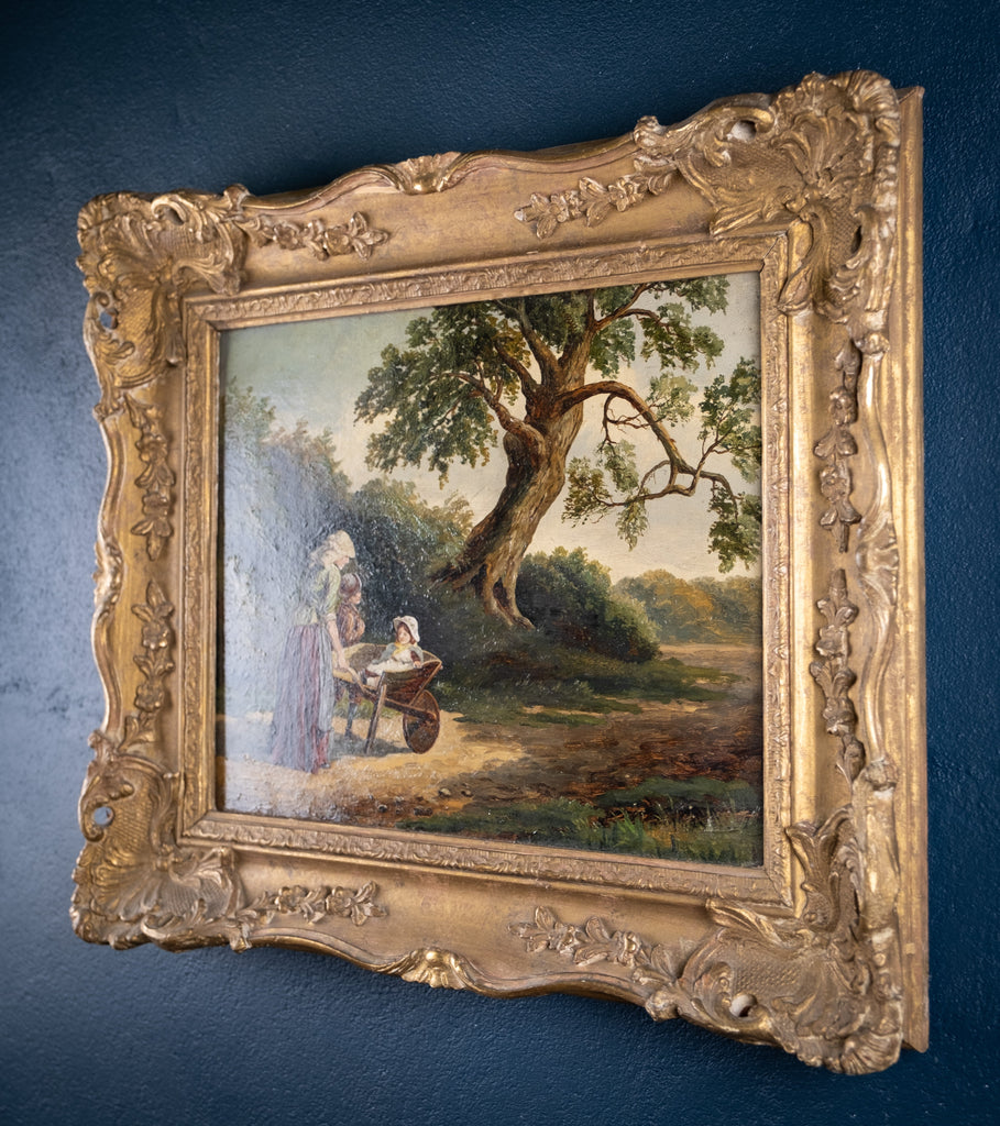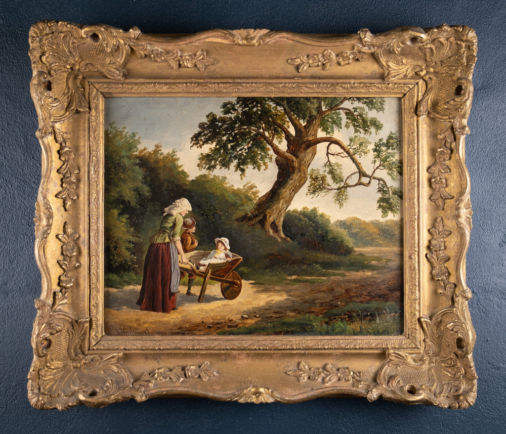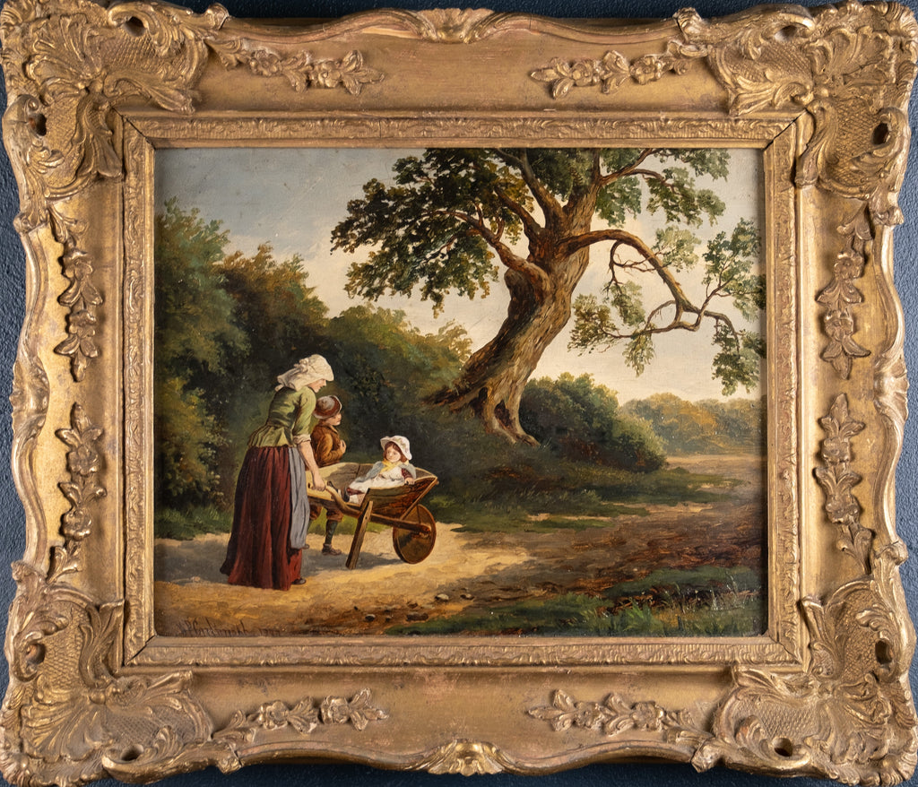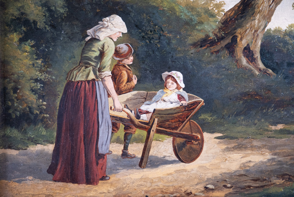 The work depicts a woman walking down a country lane with a young girl in a wooden wheelbarrow with a young boy alongside. The work remains in a very good condition throughout, and is housed in a period gilt frame which has some light signs of wear but generally remains in a very good condition. The whole displays very well.