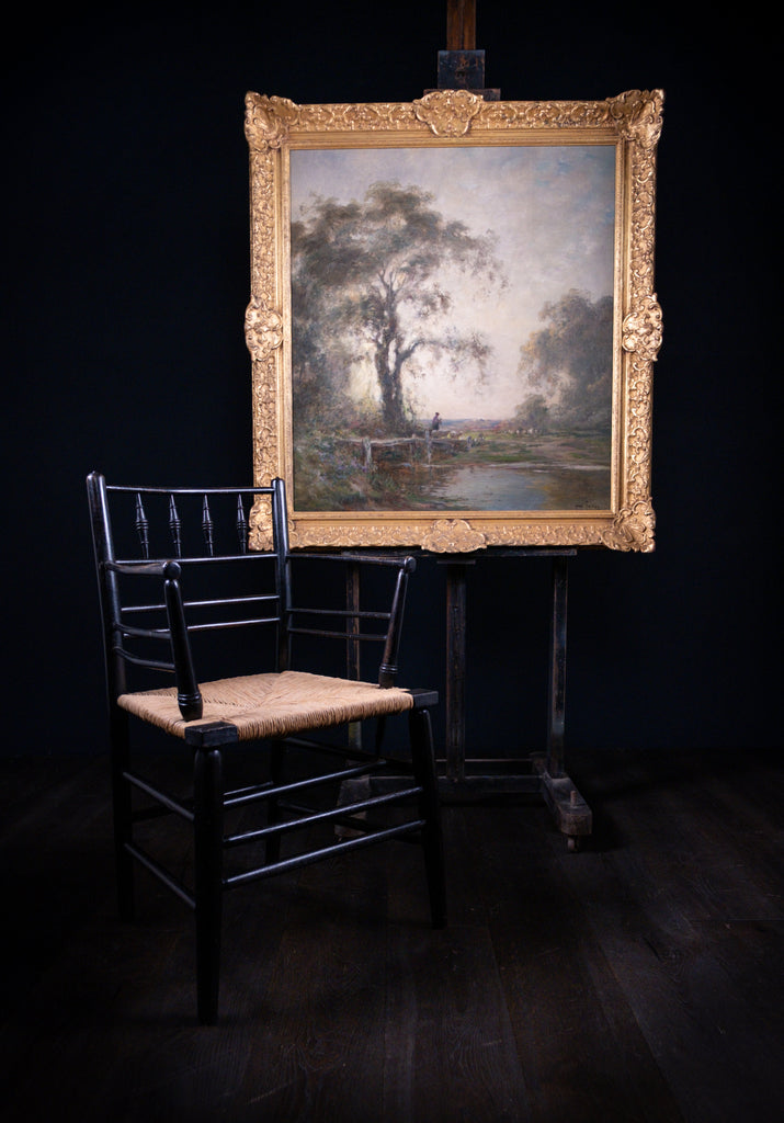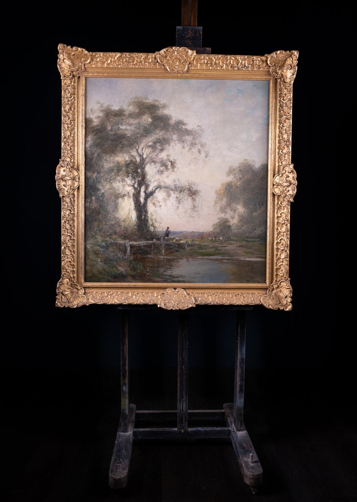 This striking landscape scene depicts a shepherdess and her sheep crossing a small footbridge with the landscape extending out into background. The dominant subject of the landscape is the tree which has been masterfully painted reaching up into the morning sky. The whole work has an almost dream like quality.