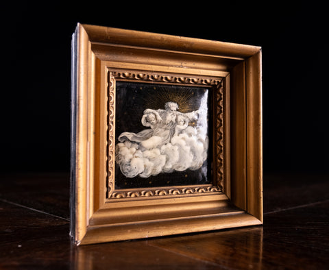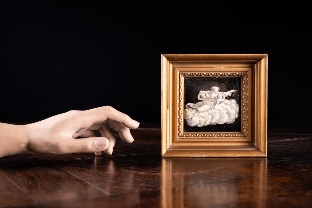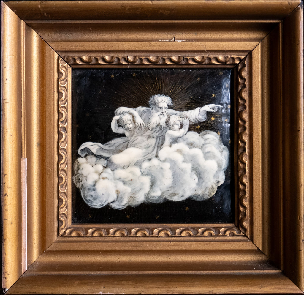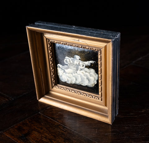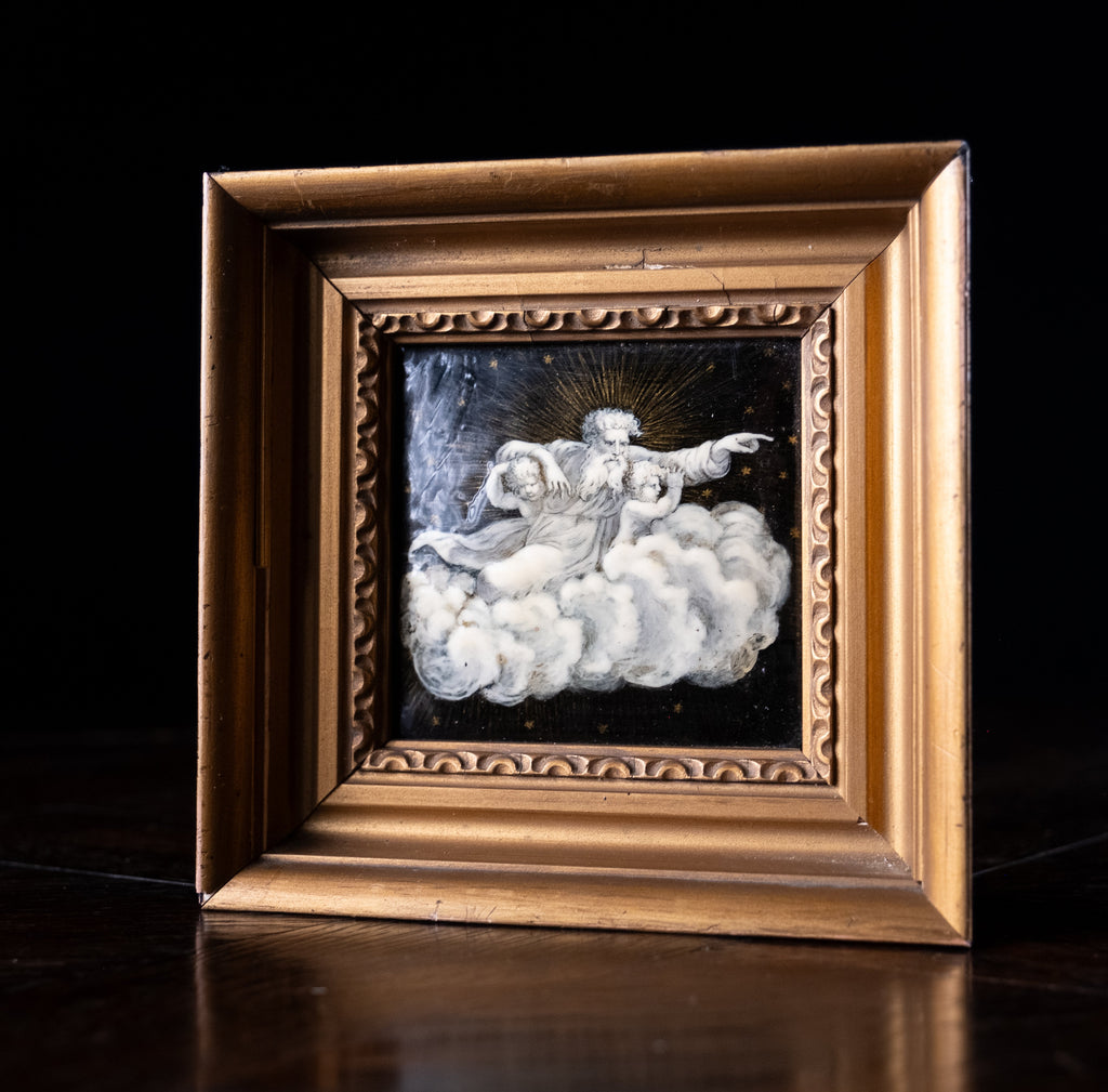 Possibly depicting a day in creation, the work depicts a God-like figure sat upon a large cloud surrounded by gilt stars and rays of light, pointing into the universe with a putto to each side. The work is housed in a later gilt frame.